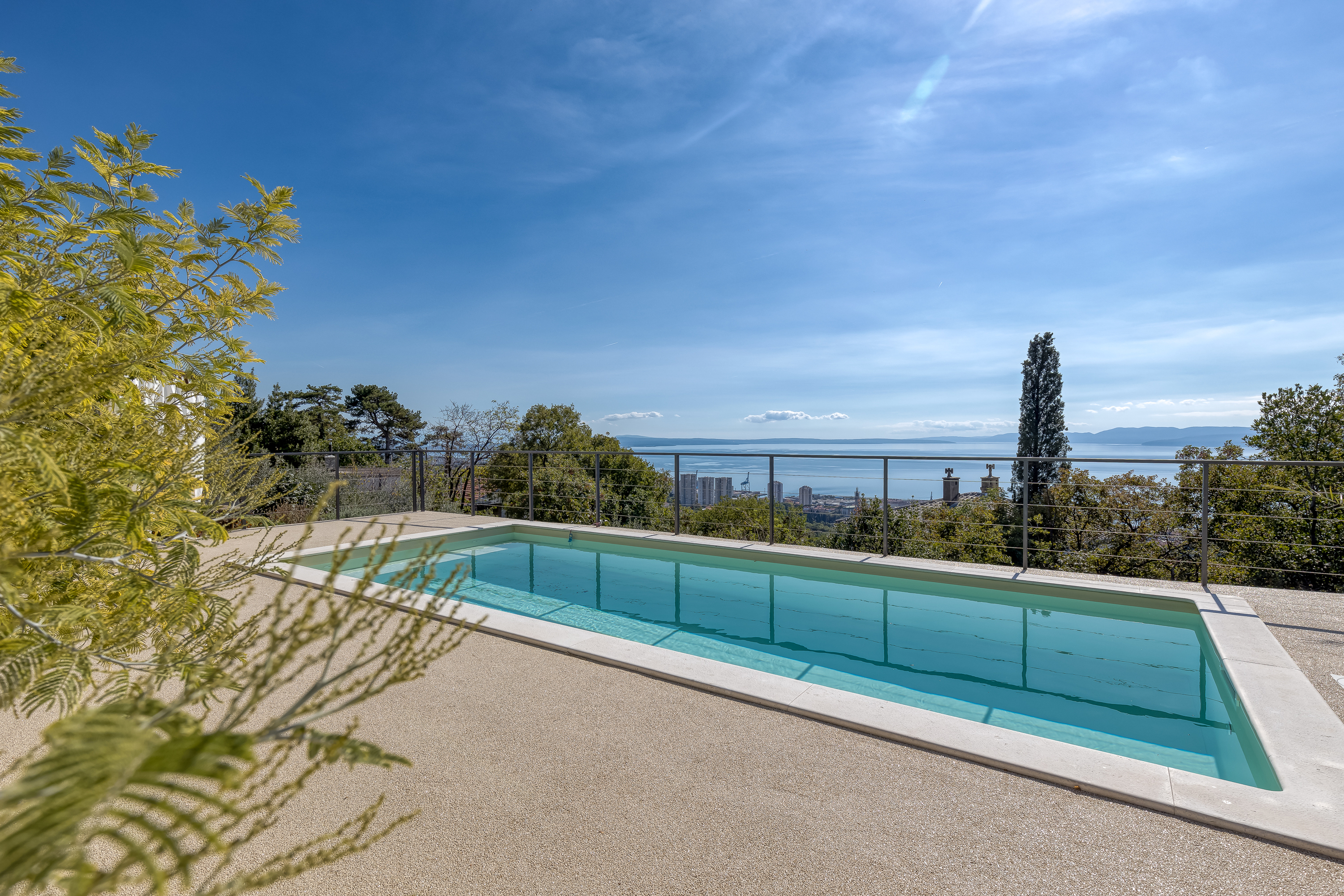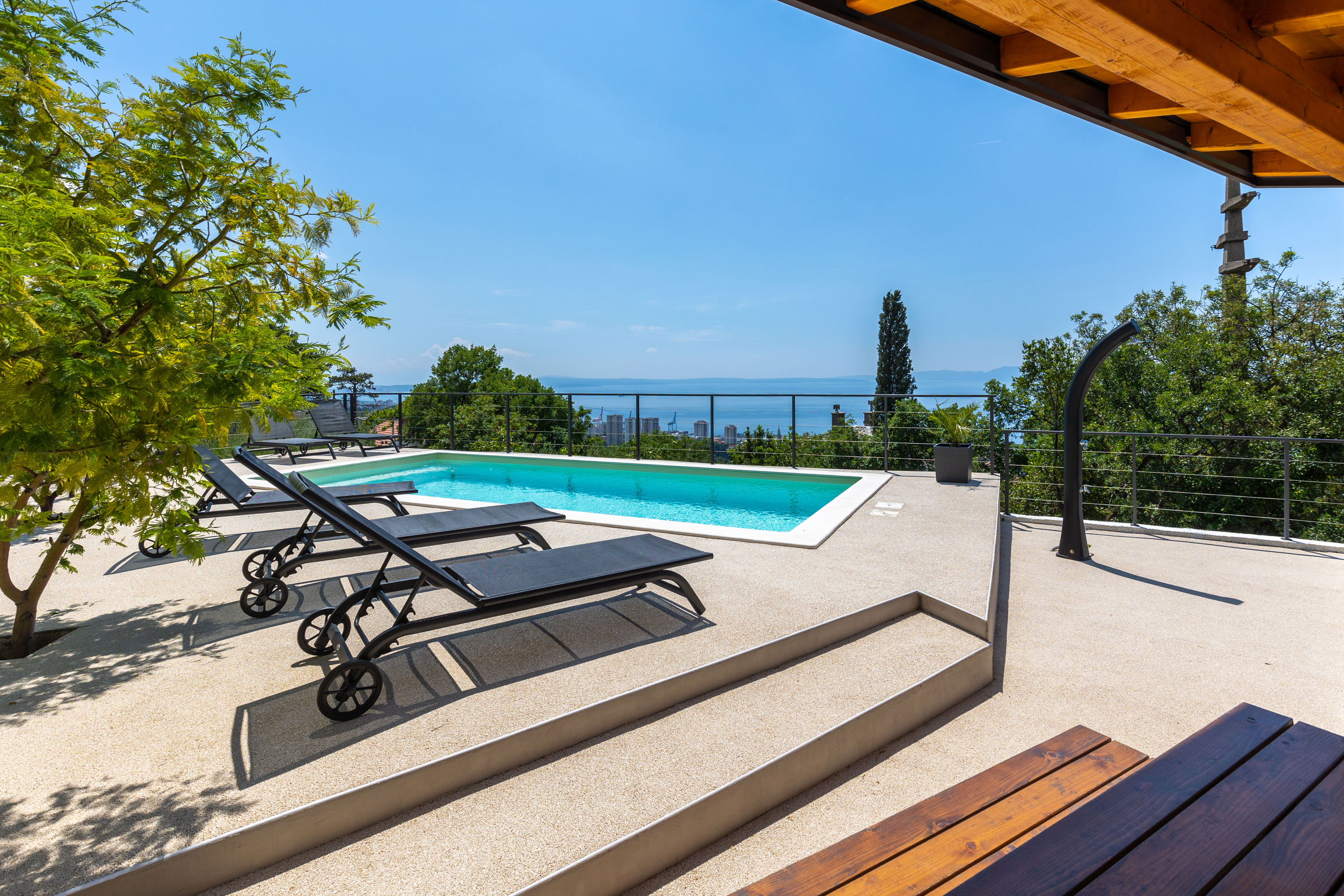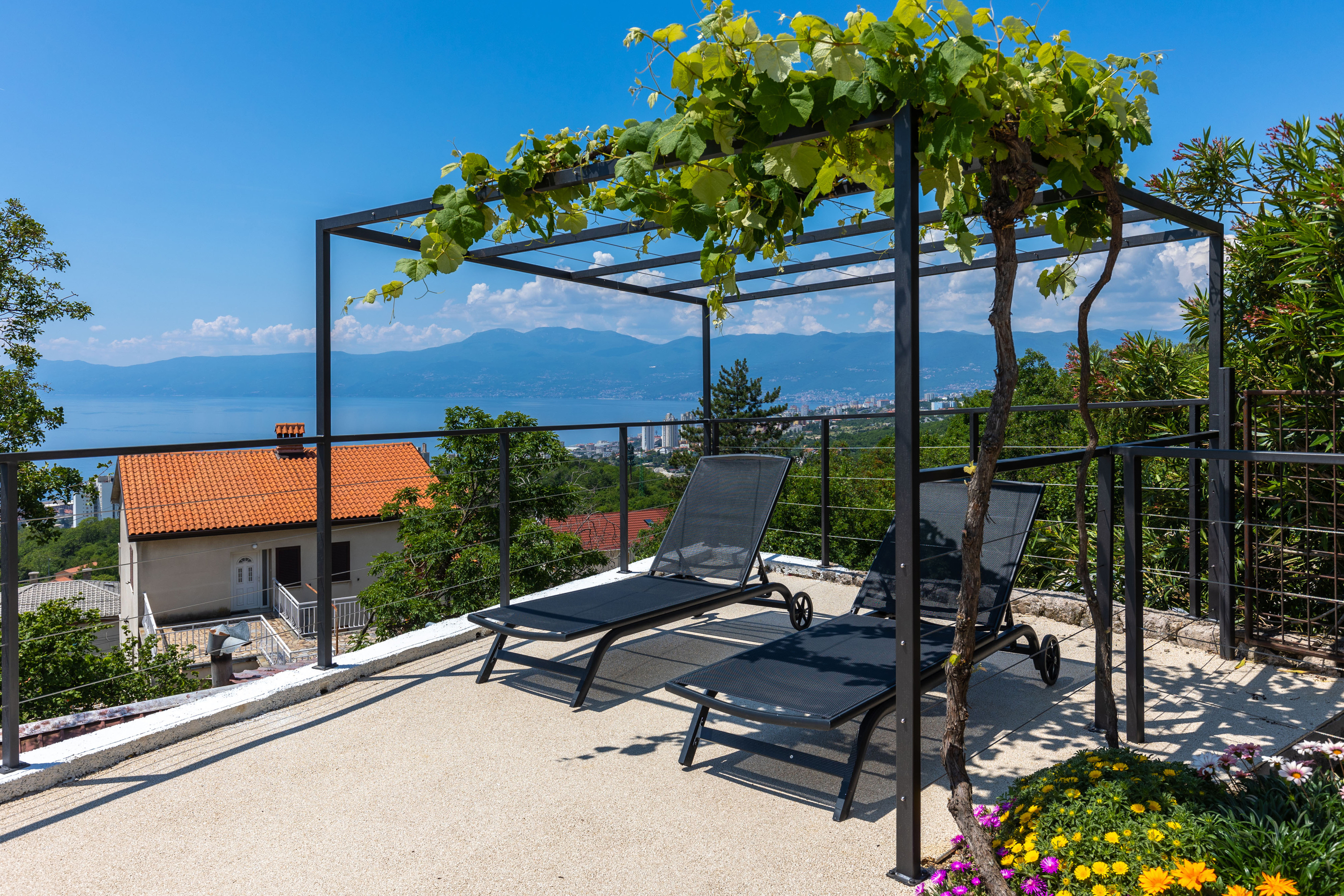 Geniet van ontspanning als geen ander met dit zwembad en tuinretraite met een perfect uitzicht op de Kvarnerbaai en Učka!