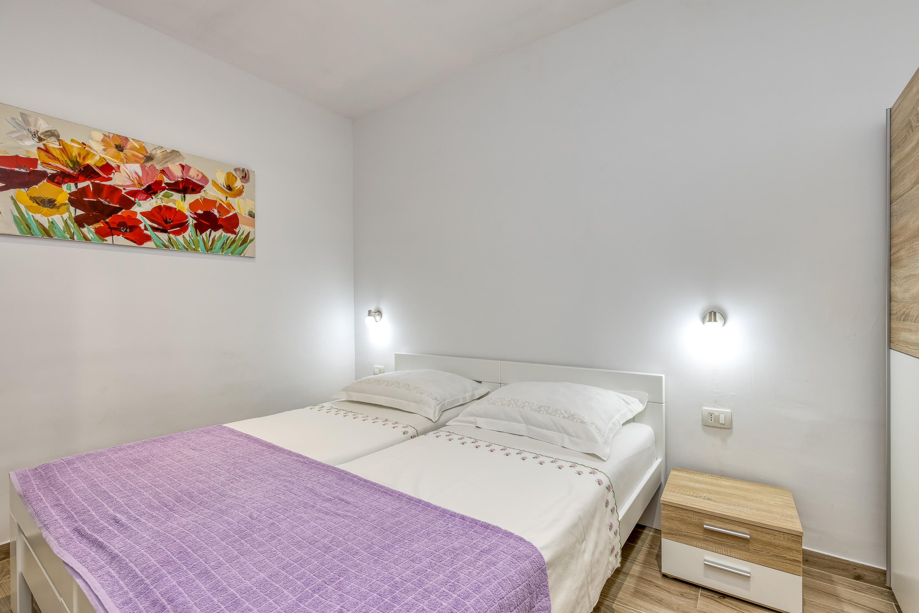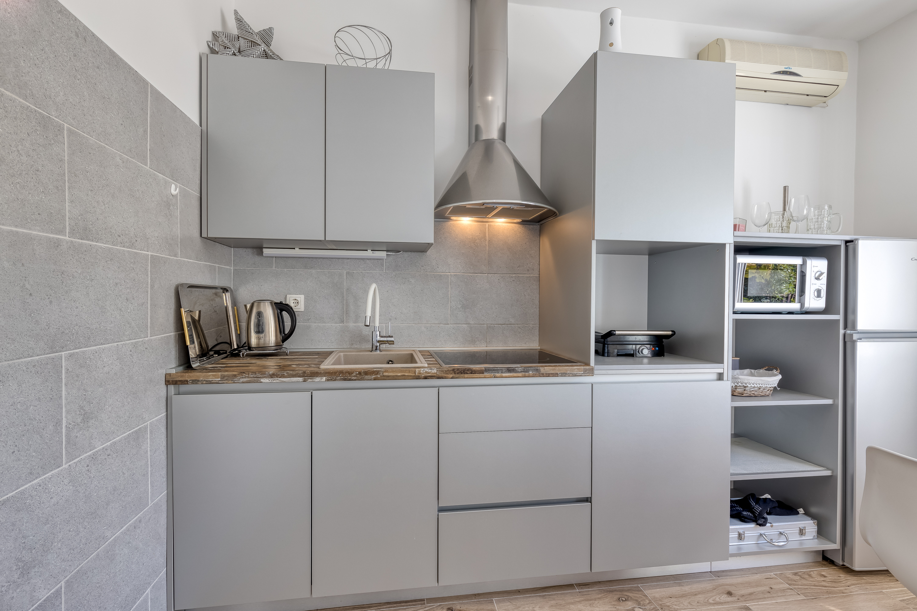 Binnen is het kindvriendelijke appartement nieuw ingericht en voorzien van airconditioning en een volledig uitgeruste, geavanceerde open keuken voor een zorgeloze vakantie. De woonkamer met uitzicht op zee heeft een tweepersoons slaapbank, een eethoek aan het raam en de keuken van het appartement. U vindt er een vaatwasser, magnetron, oven en koelkast met vriezer.