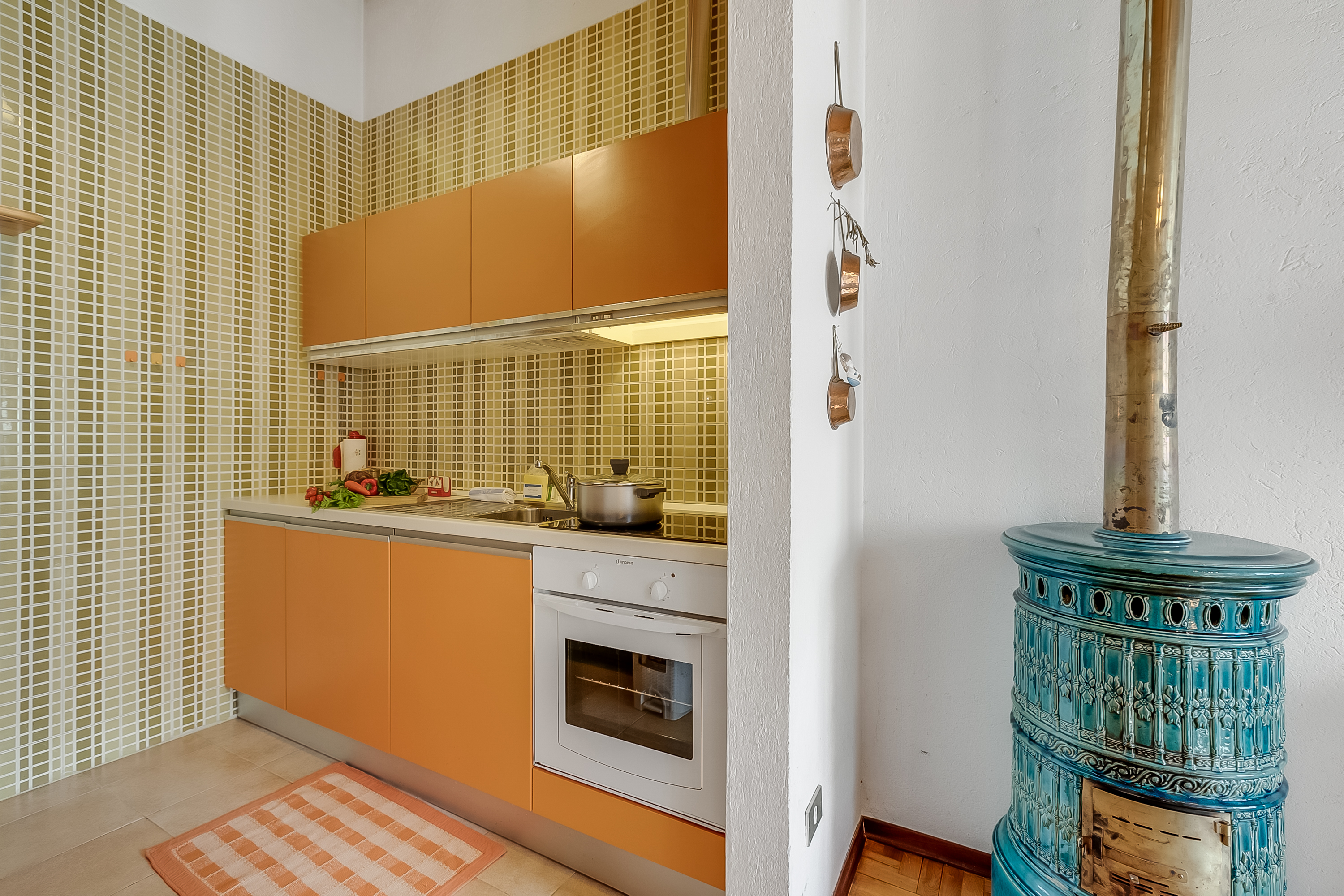 De uitnodigende interieurs zijn licht en hebben overal houten vloeren. De open leefruimte is ingericht met een bank en fauteuils, terwijl de eetruimte een tafel voor zes personen en houten kasten biedt. Een glazen deur opent naar een privébalkon met uitzicht op de voortuin en de bergen. Direct naast de eetruimte ligt de keuken, uitgerust met een inductiekookplaat, oven, vaatwasser, koffiezetapparaat en koelkast.