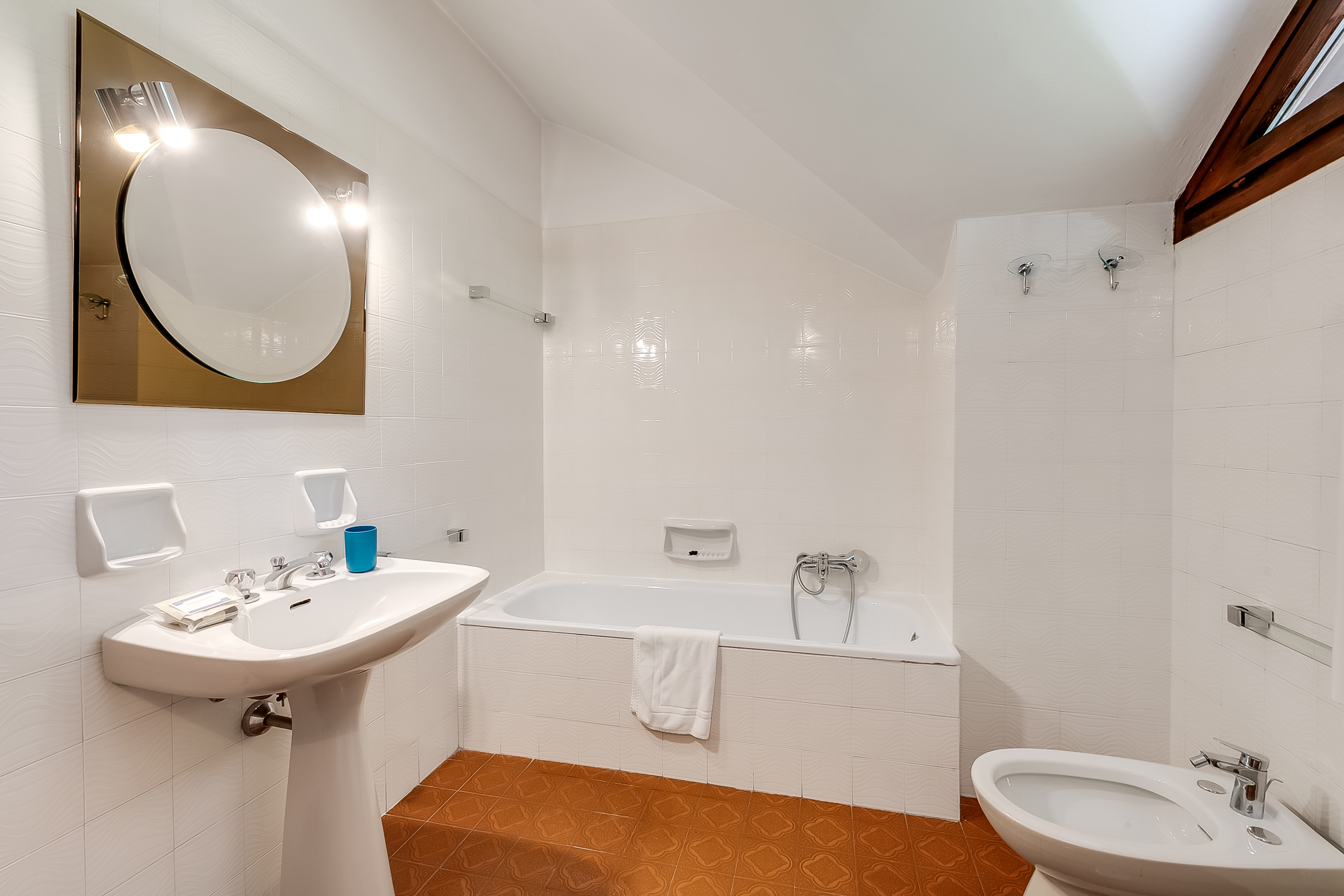 De wit betegelde badkamer is voorzien van een bad met douchekop, een wastafel, bidet, toilet en wasmachine.