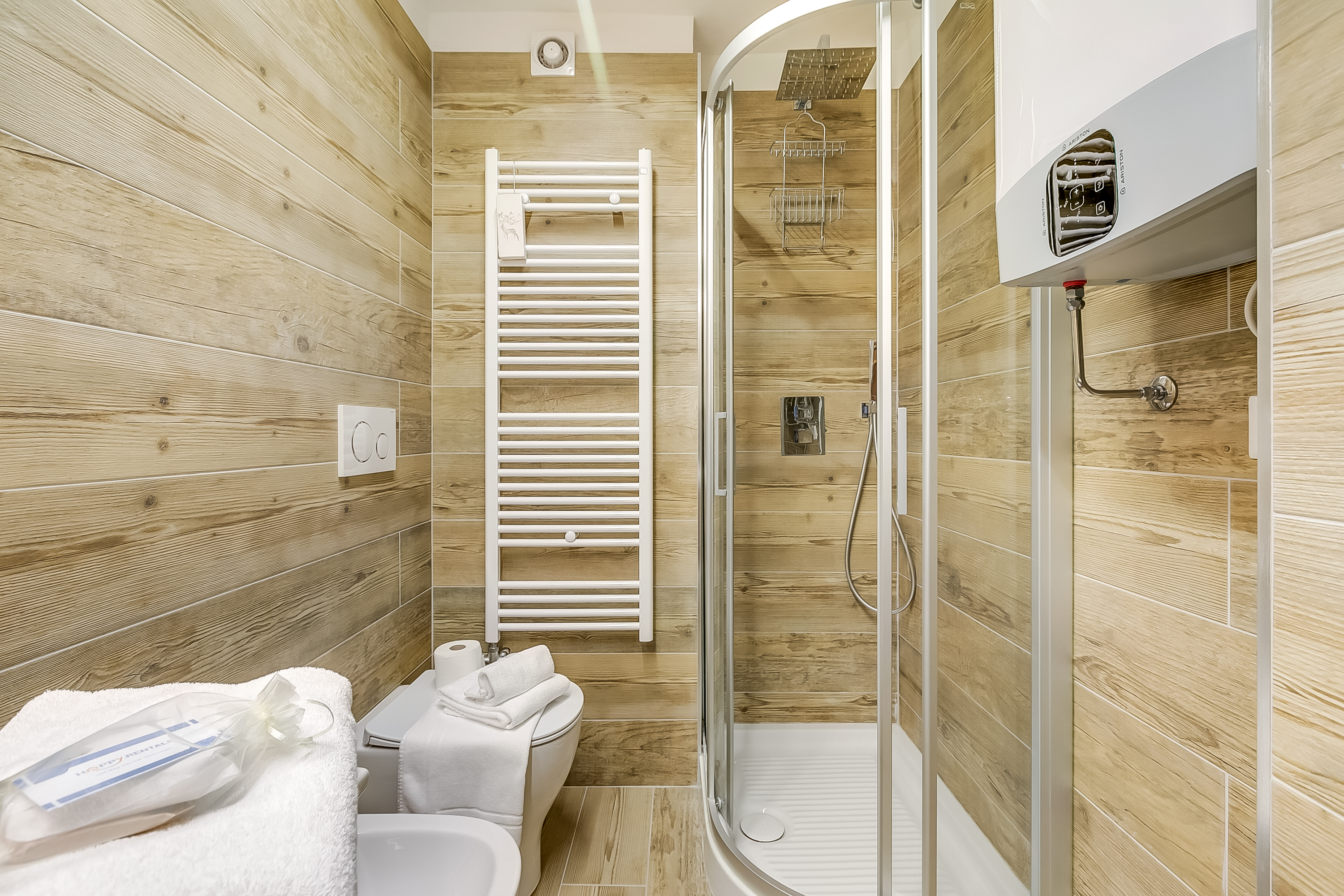 De aparte badkamer heeft een douche, een wastafel, een bidet en een toilet.