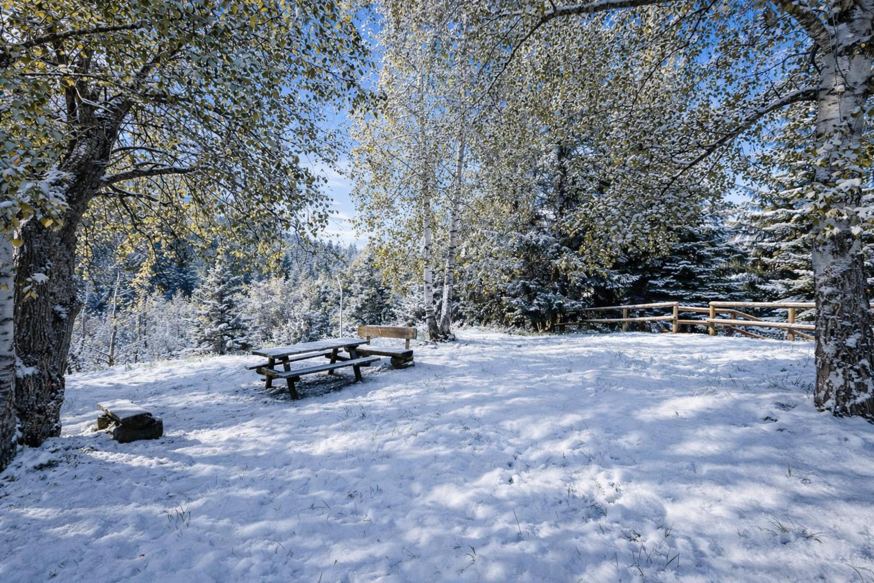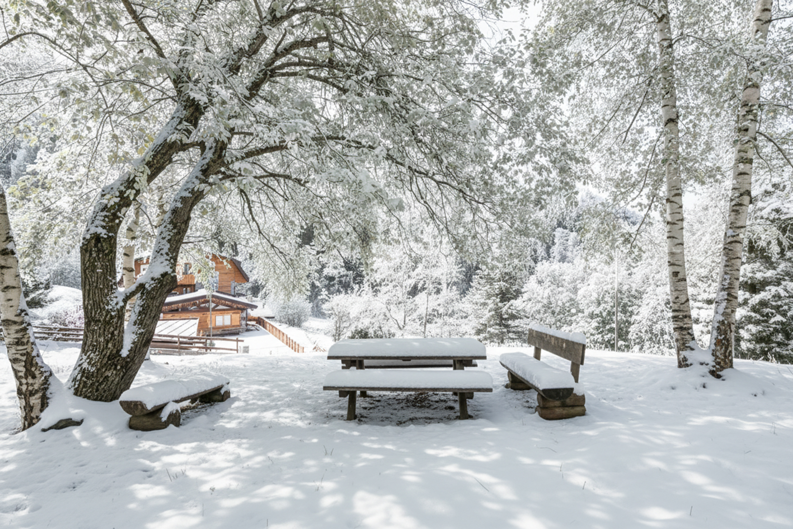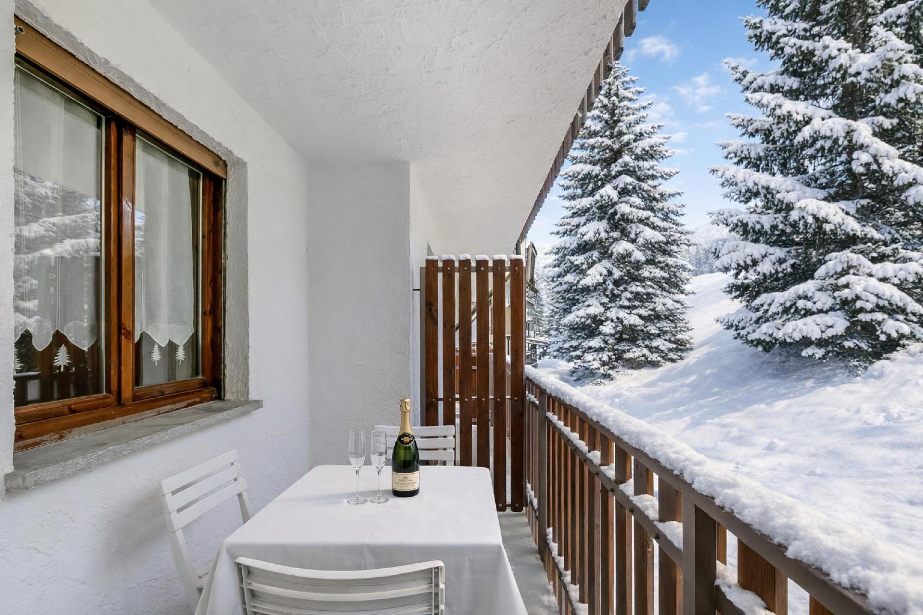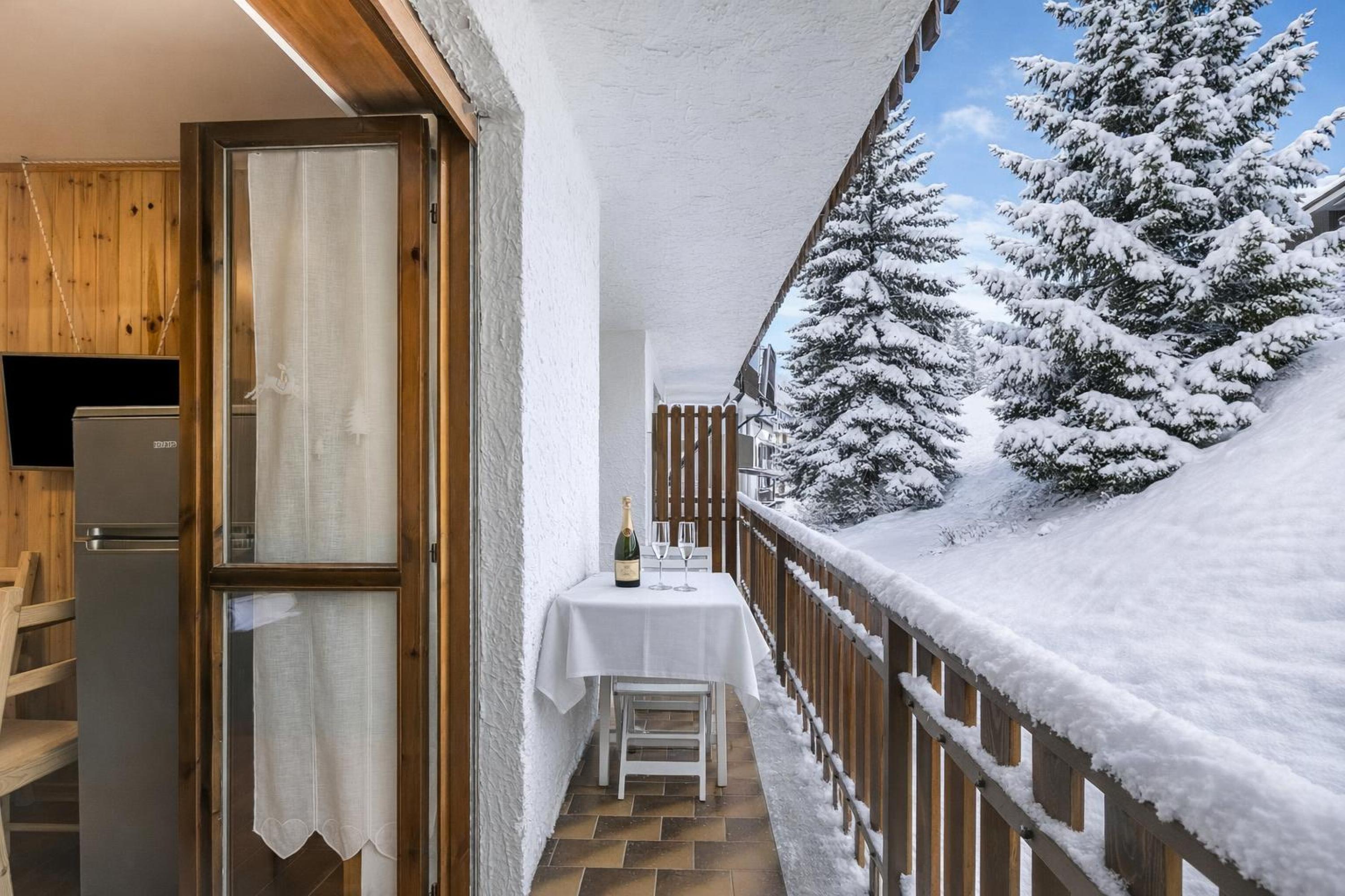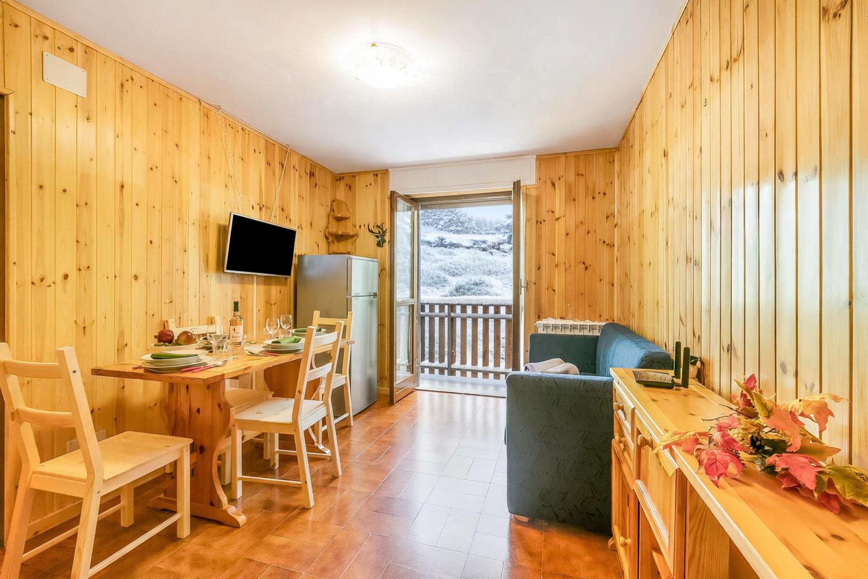 De open woonkamer heeft lichte houten lambrisering die een warme, hut-achtige sfeer creëert. Natuurlijk licht stroomt de ruimte binnen via openslaande deuren die toegang geven tot een privébalkon. Binnen vindt u een comfortabele bank, een tv en een eettafel voor vier personen. Grenzend aan de woonkamer bevindt zich een kitchenette met een inductiekookplaat, een koffiezetapparaat en een koel-vriescombinatie. De residentie beschikt ook over een charmante gedeelde tuin met volwassen bomen en picknicktafels, perfect om buiten te eten in de frisse berglucht.