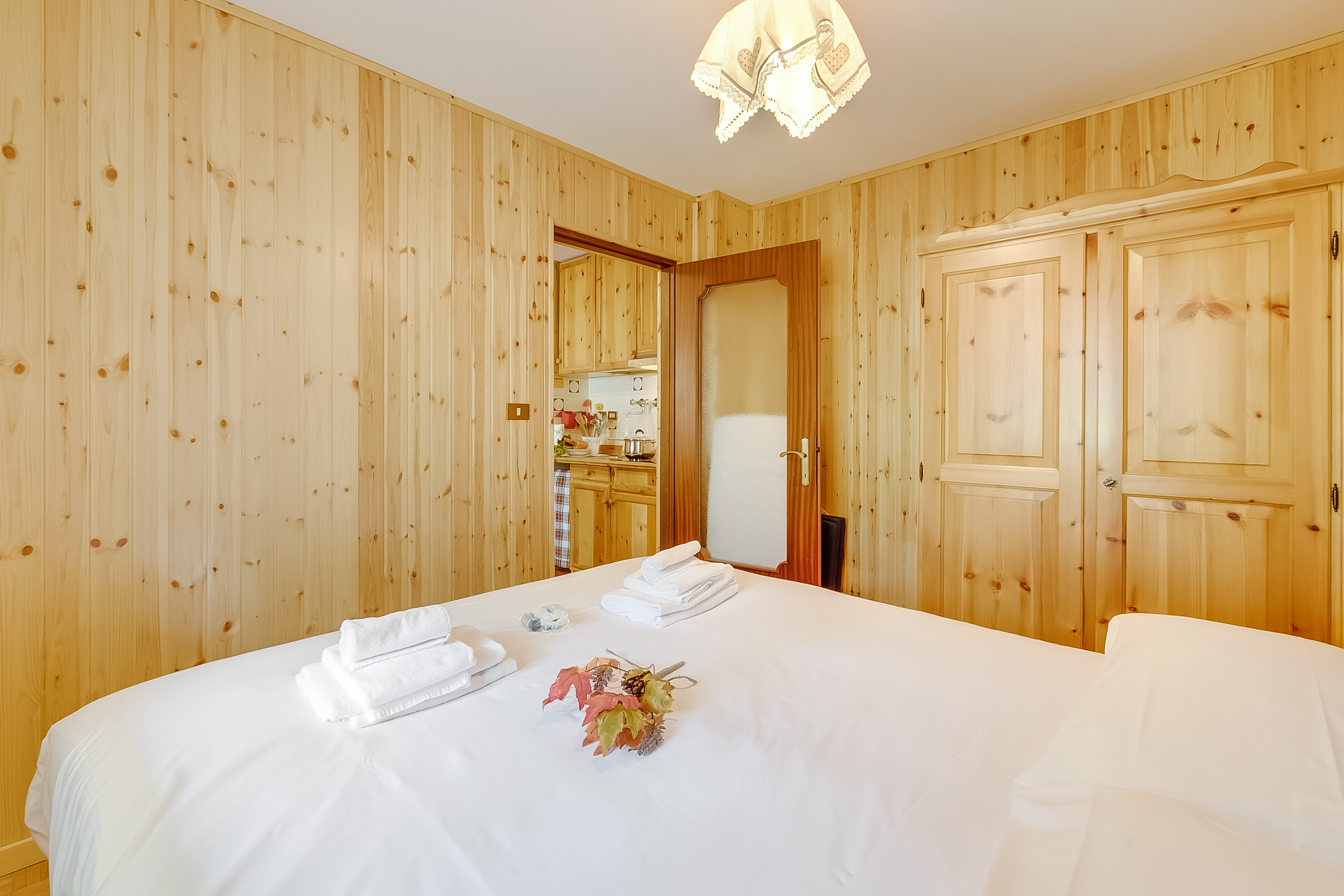 Slaapkamer: De slaapkamer, die eveneens met hout is bekleed, heeft een king-size tweepersoonsbed en een kledingkast.