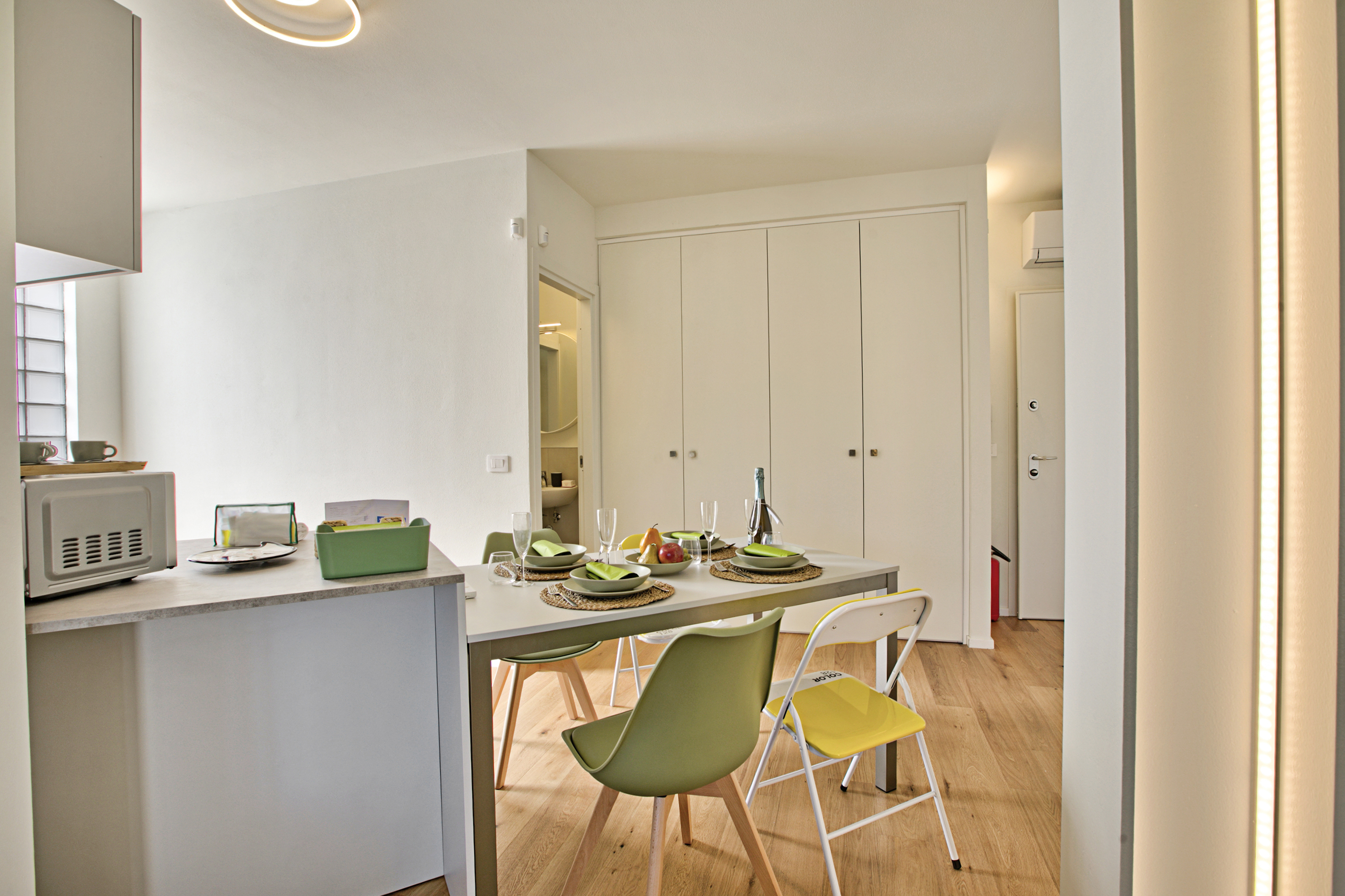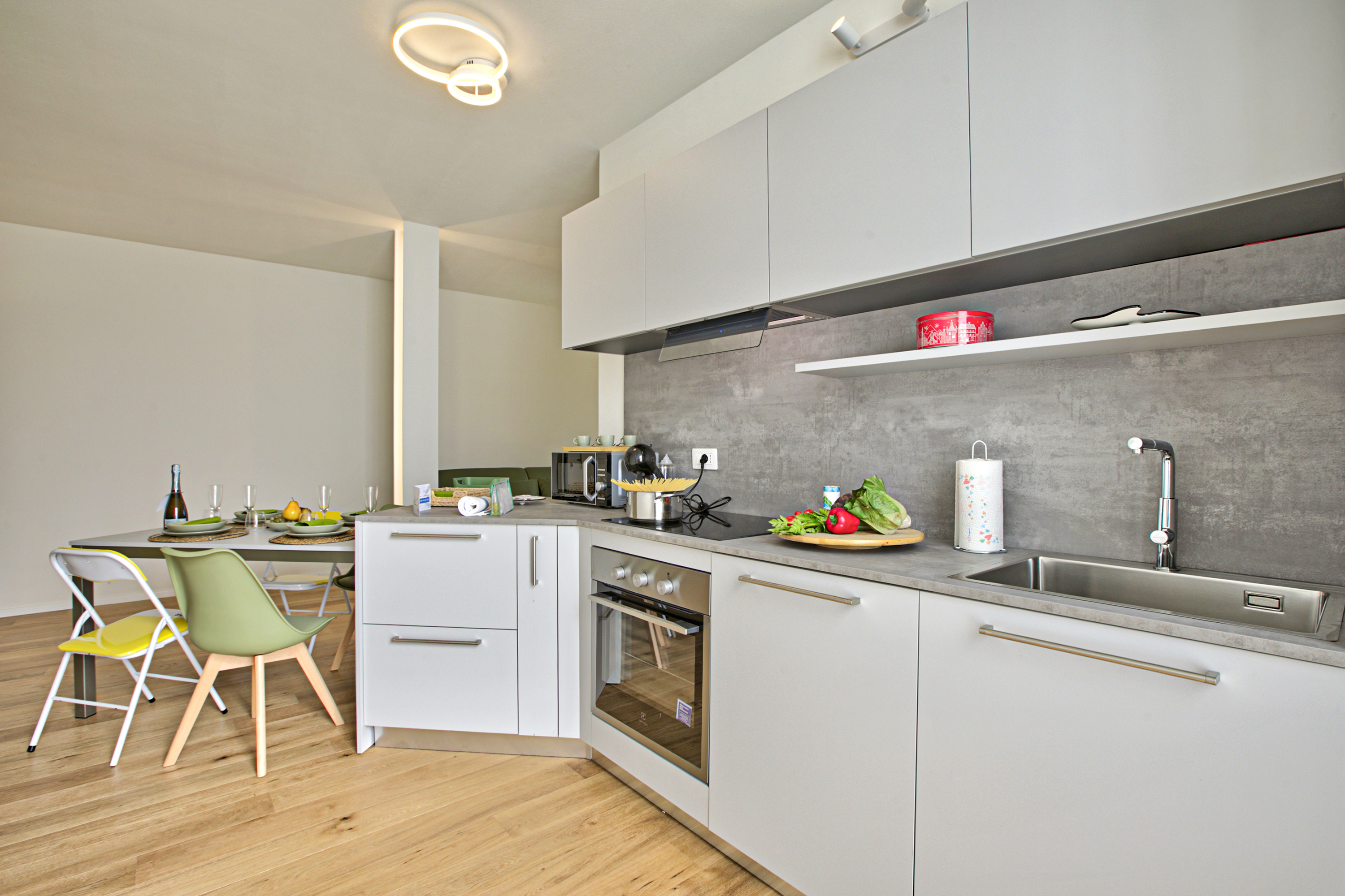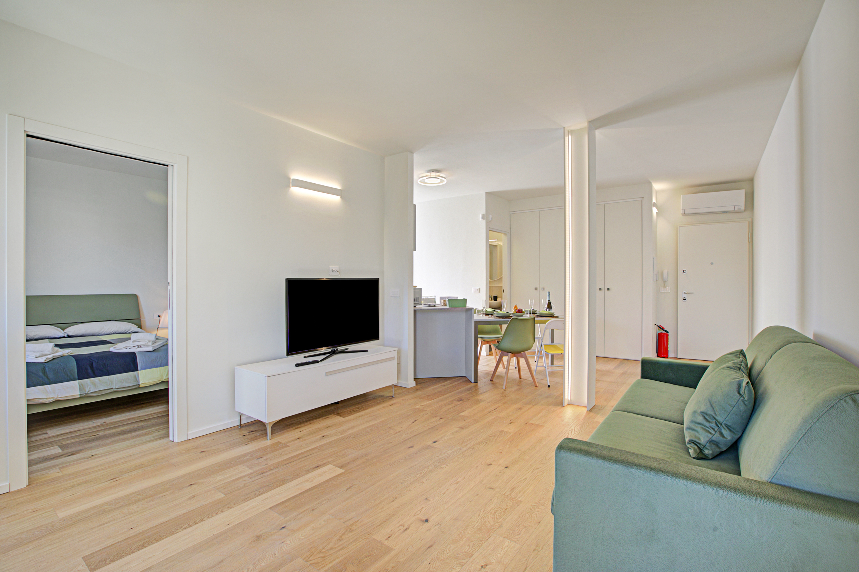 Dit ruime en prachtig ontworpen appartement heeft een lichte entree die leidt naar de airconditioned woonkamer. De woonkamer heeft een comfortabele tweepersoons slaapbank en een Smart TV met toegang tot je favoriete streamingplatforms. De keuken is volledig uitgerust voor je gemak, met een eettafel perfect voor maaltijden of sociale bijeenkomsten, en een keuken met koelkast, vriezer, inductiekookplaat, gootsteen, vaatwasser, oven, magnetron en koffiezetapparaat. De woonkamer heeft ook toegang tot een klein balkon.