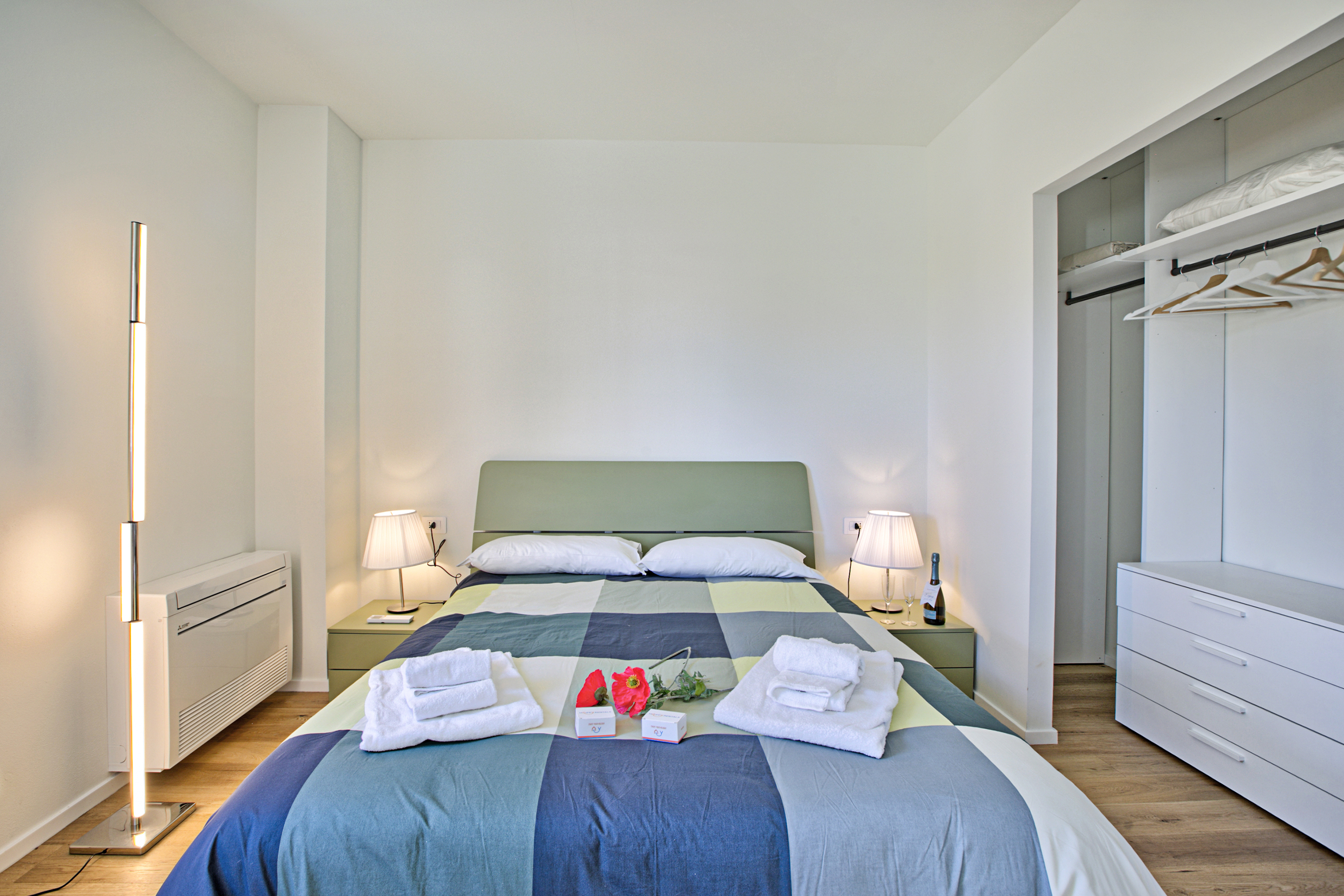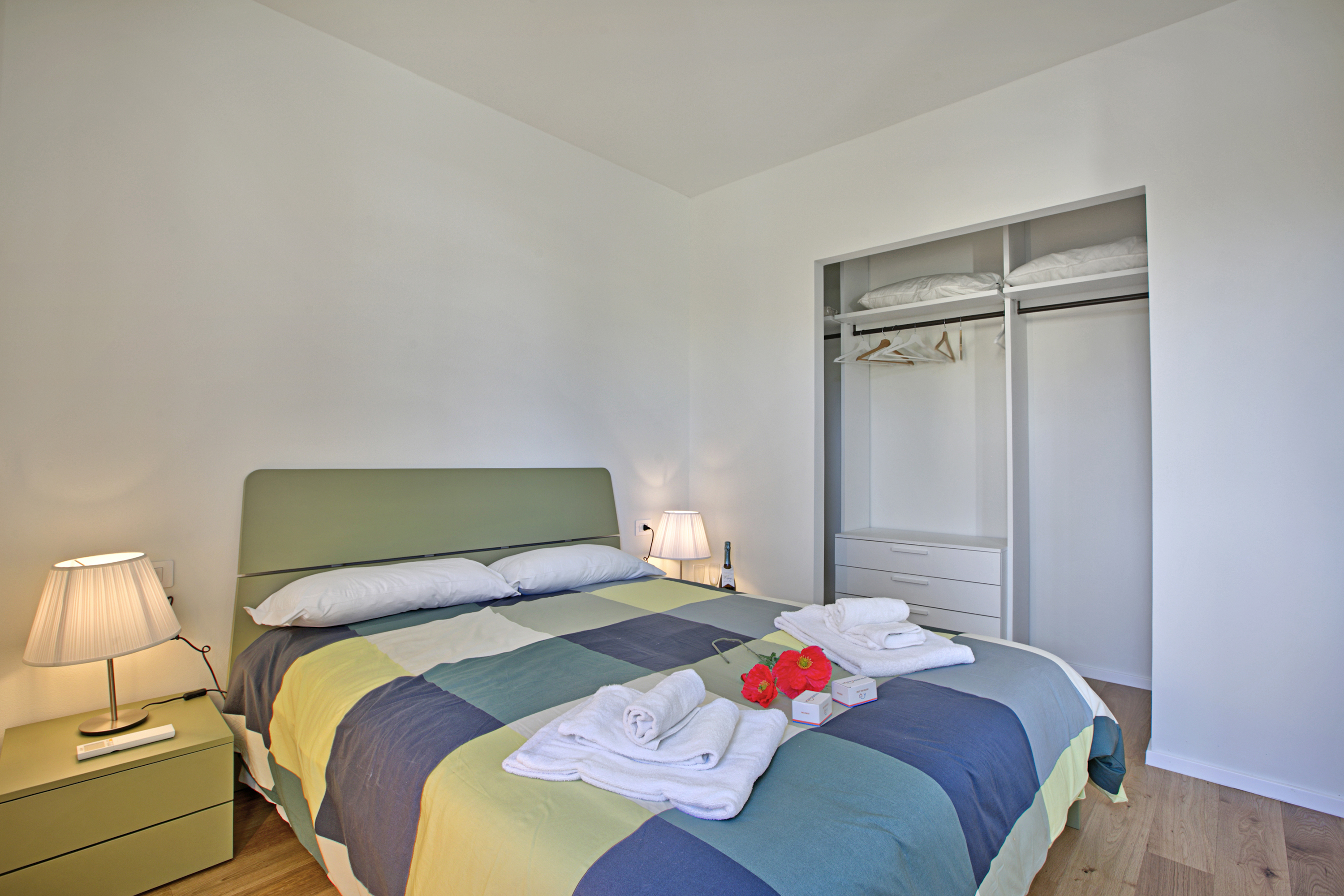 De slaapruimte omvat een mooie slaapkamer, ook met airconditioning. Deze beschikt over een tweepersoonsbed en een slank, modern inbouwkast met veel opbergruimte. Het appartement heeft ook een volledig uitgeruste badkamer met toilet, bidet, wastafel en een moderne douchecabine.