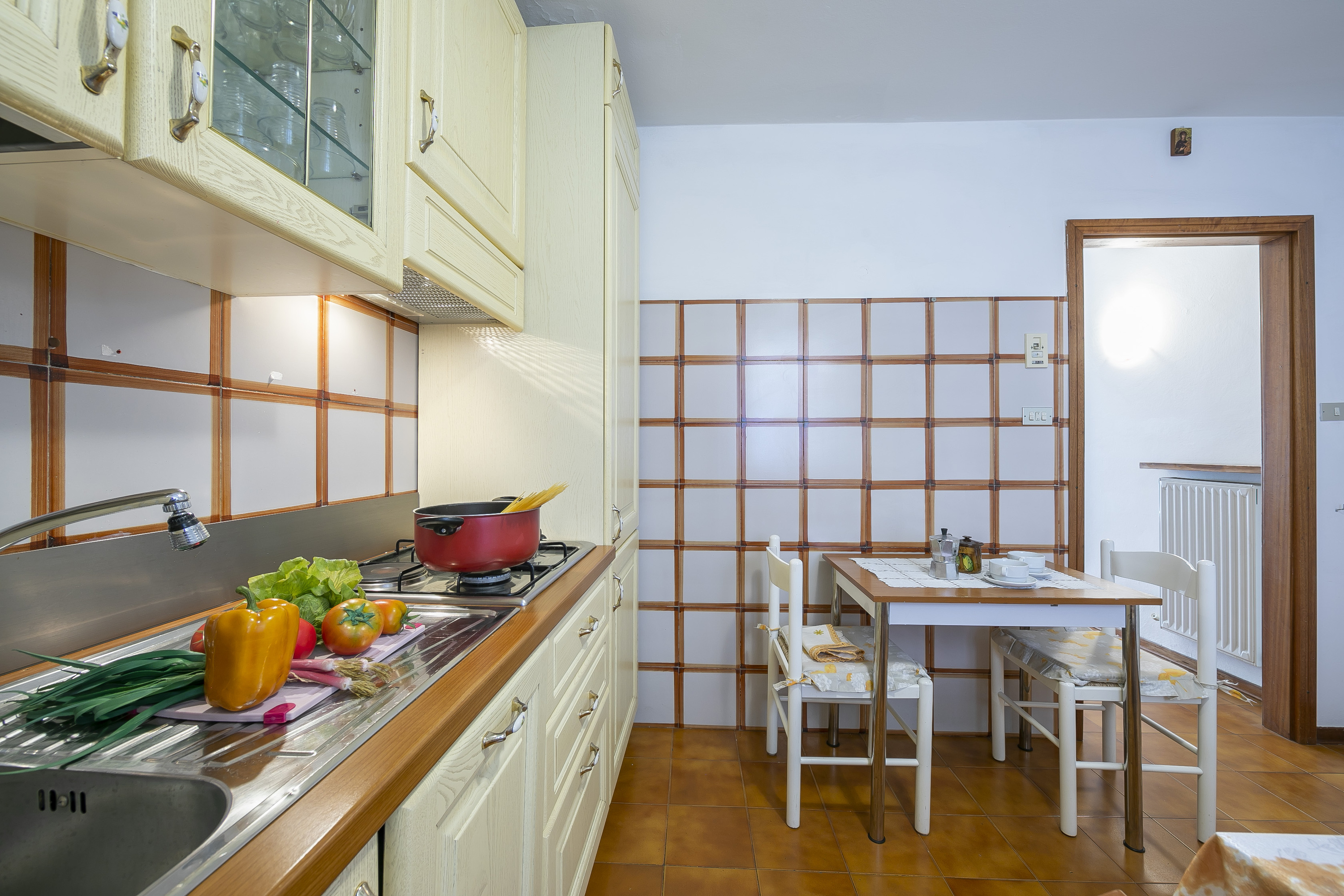 De eet- en keukenruimte van het duplexappartement is gescheiden van de woonkamer en is uitgerust met alle essentiële apparaten, evenals een eettafel voor 6 personen, zodat u tijdens uw vakantie gemakkelijk kunt genieten van zelfgemaakte maaltijden. Een vaatwasser, oven, koelkast, broodrooster en koffiezetapparaat staan tot uw beschikking. Het slaapgedeelte en de badkamer bevinden zich op de bovenverdieping.