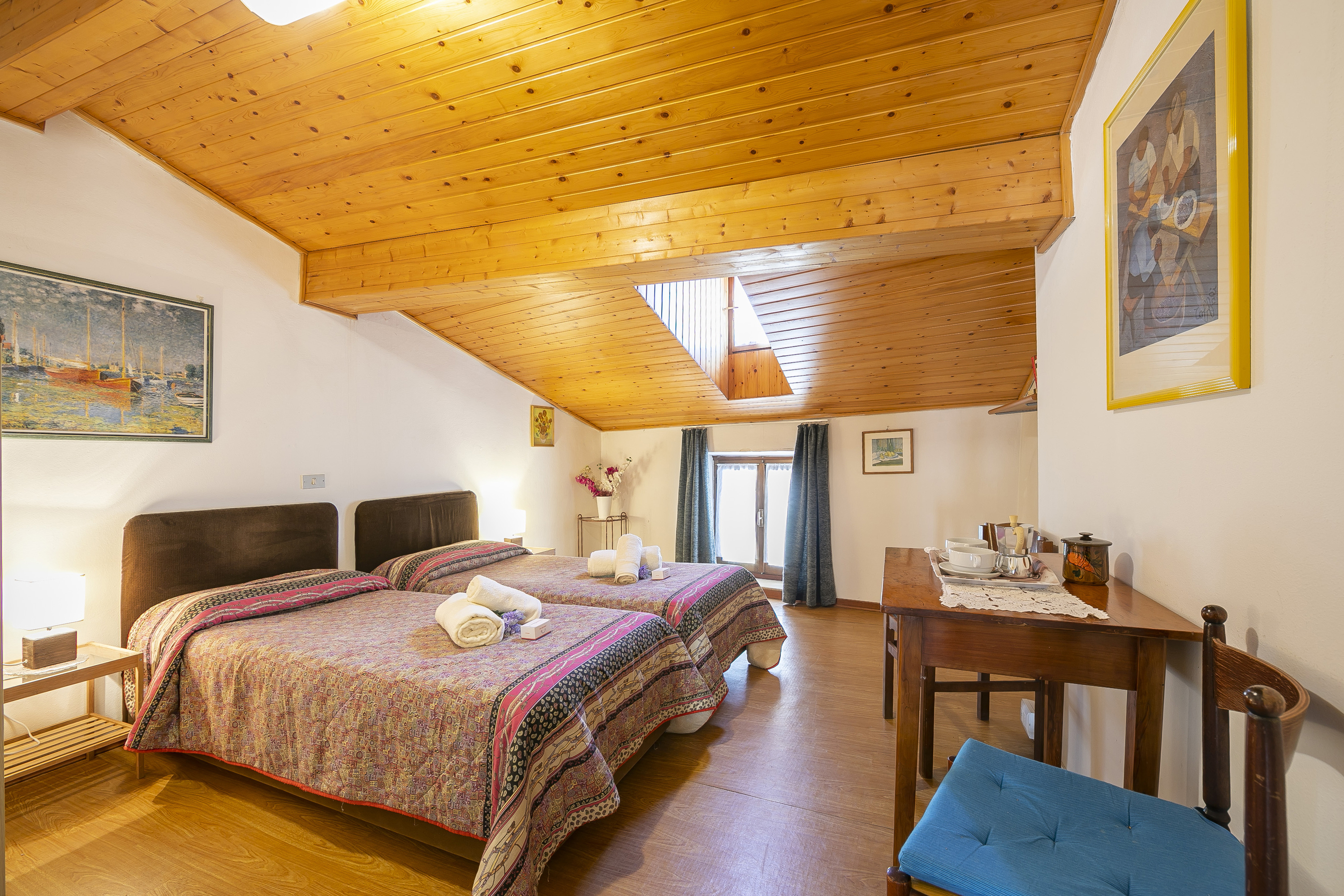 - Slaapkamer 2: Een ruime tweepersoonskamer met charmante zichtbare balken en twee eenpersoonsbedden.