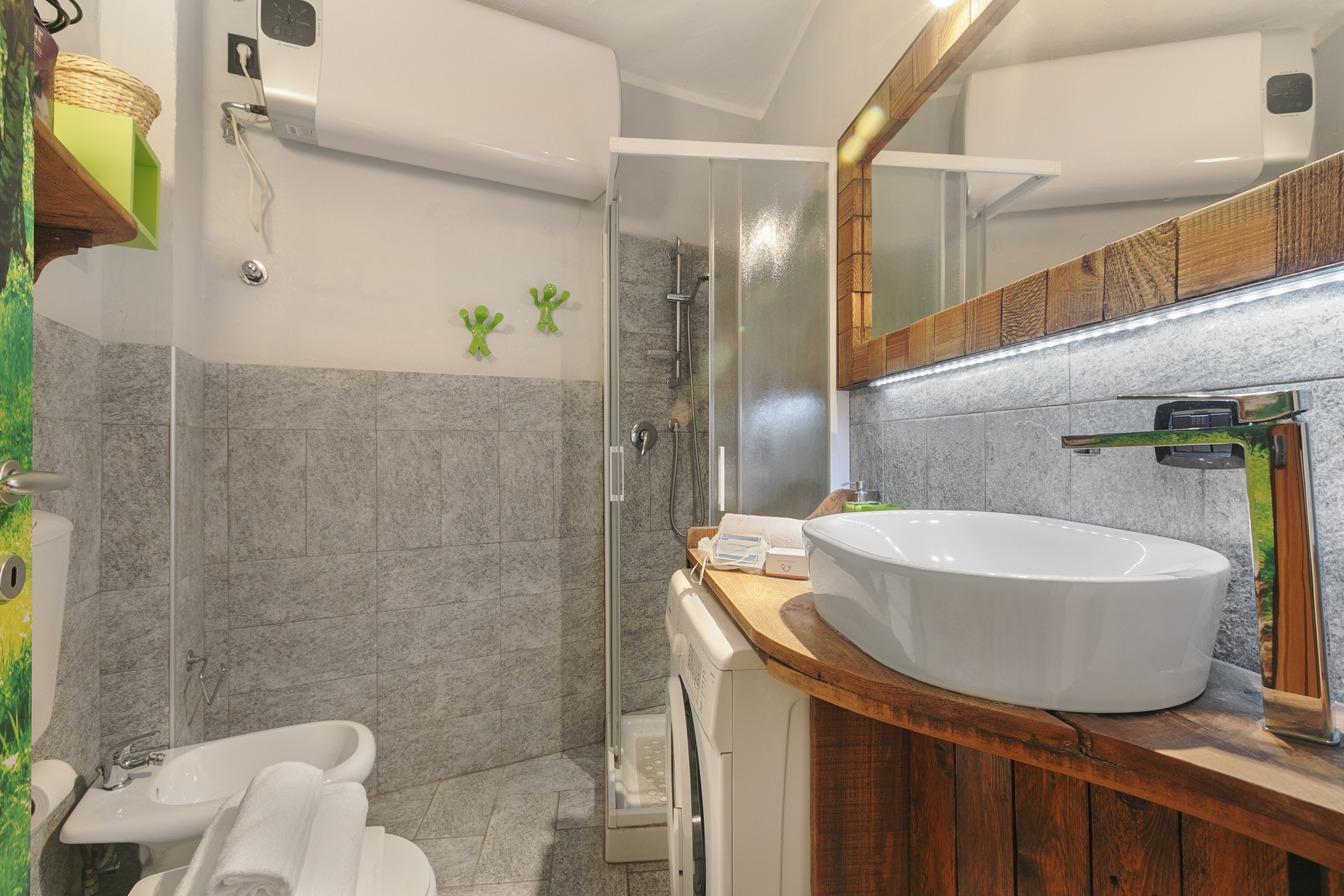 De aparte badkamer heeft een douche, wastafel, bidet, wasmachine en toilet.