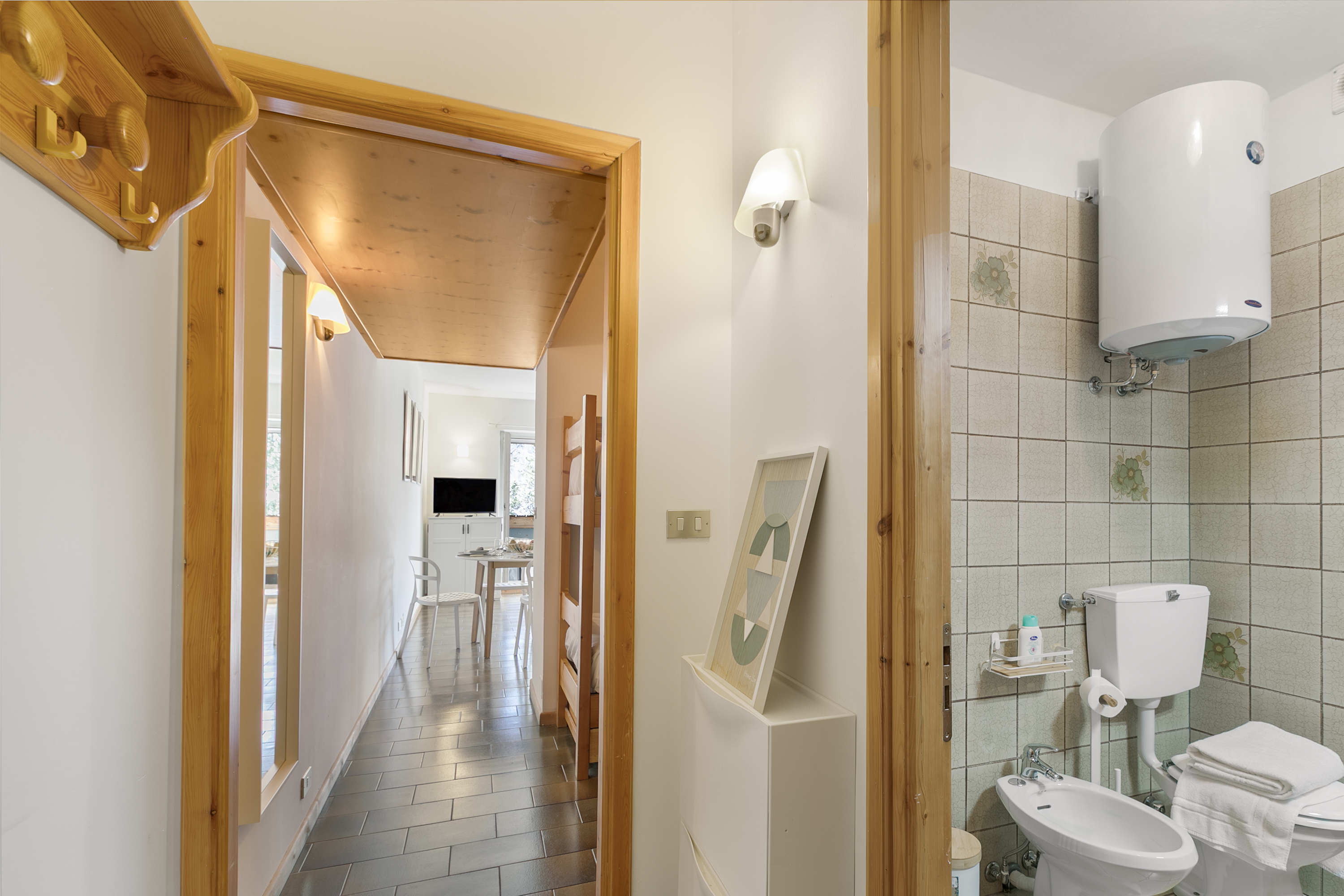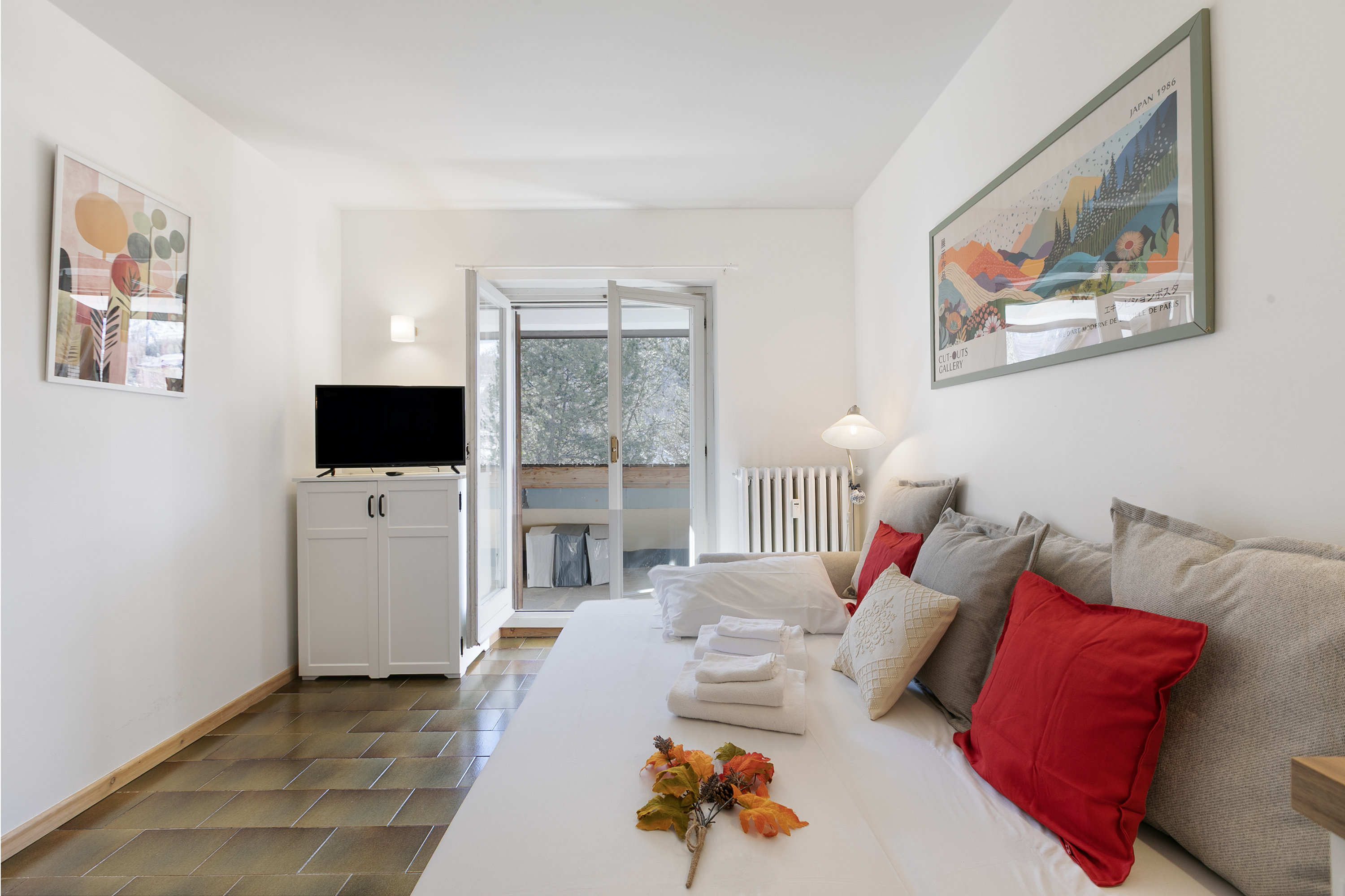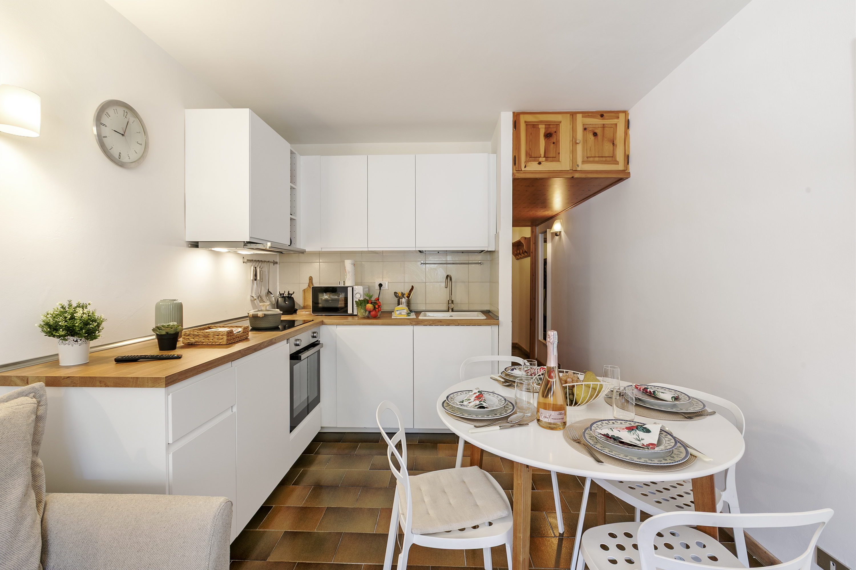 Dit gezellige appartement op de eerste verdieping biedt een modern en uitnodigend interieur. De woonkamer is stijlvol ingericht met een tweepersoonsbank en geeft toegang tot een zonnig balkon, ideaal om van het schilderachtige uitzicht te genieten. De woonkeuken is goed uitgerust met een inductiekookplaat, oven, magnetron en broodrooster, wat zorgt voor alle benodigdheden voor een comfortabel verblijf.