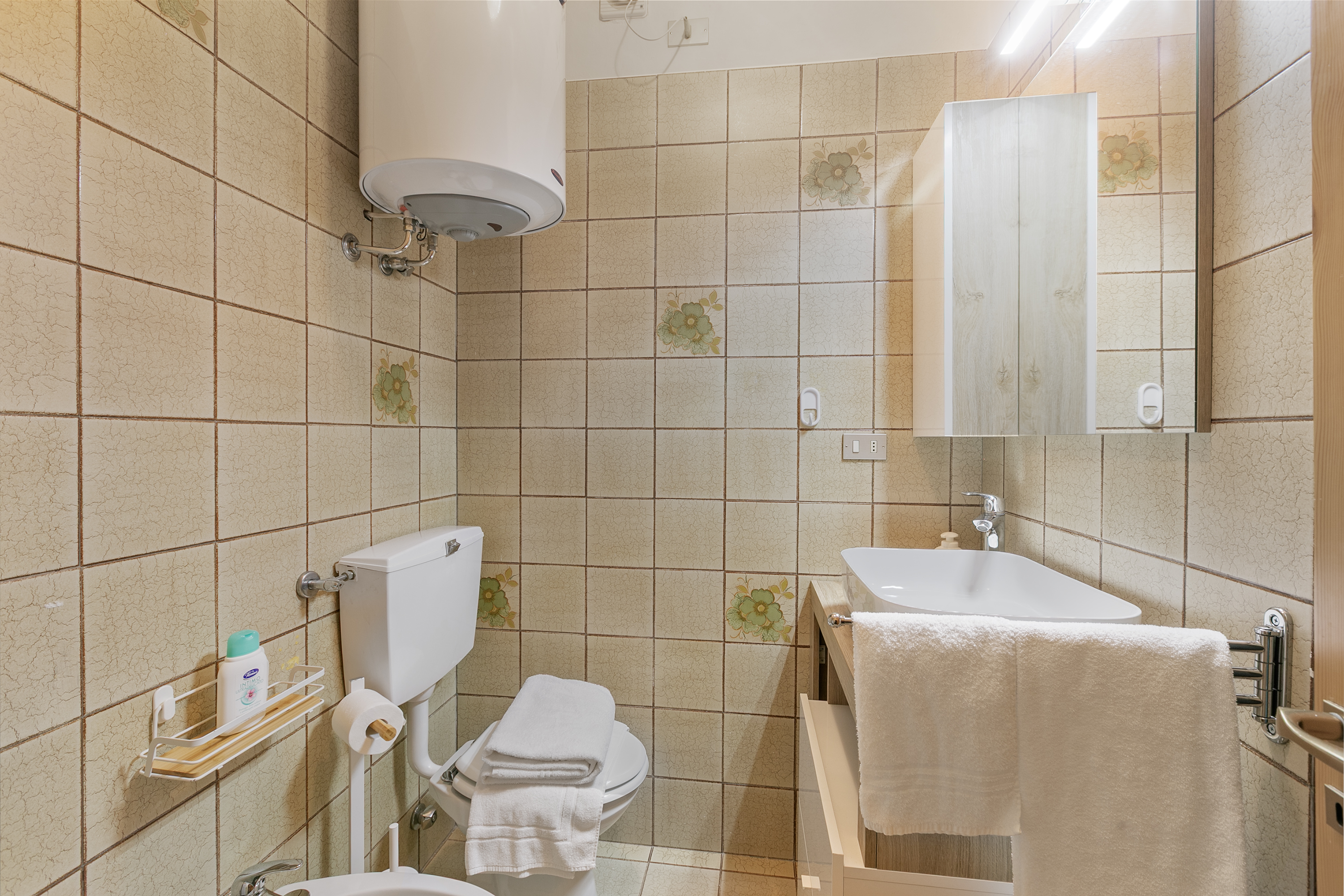 De badkamer is uitgerust met een bidet, een douche en een toilet.