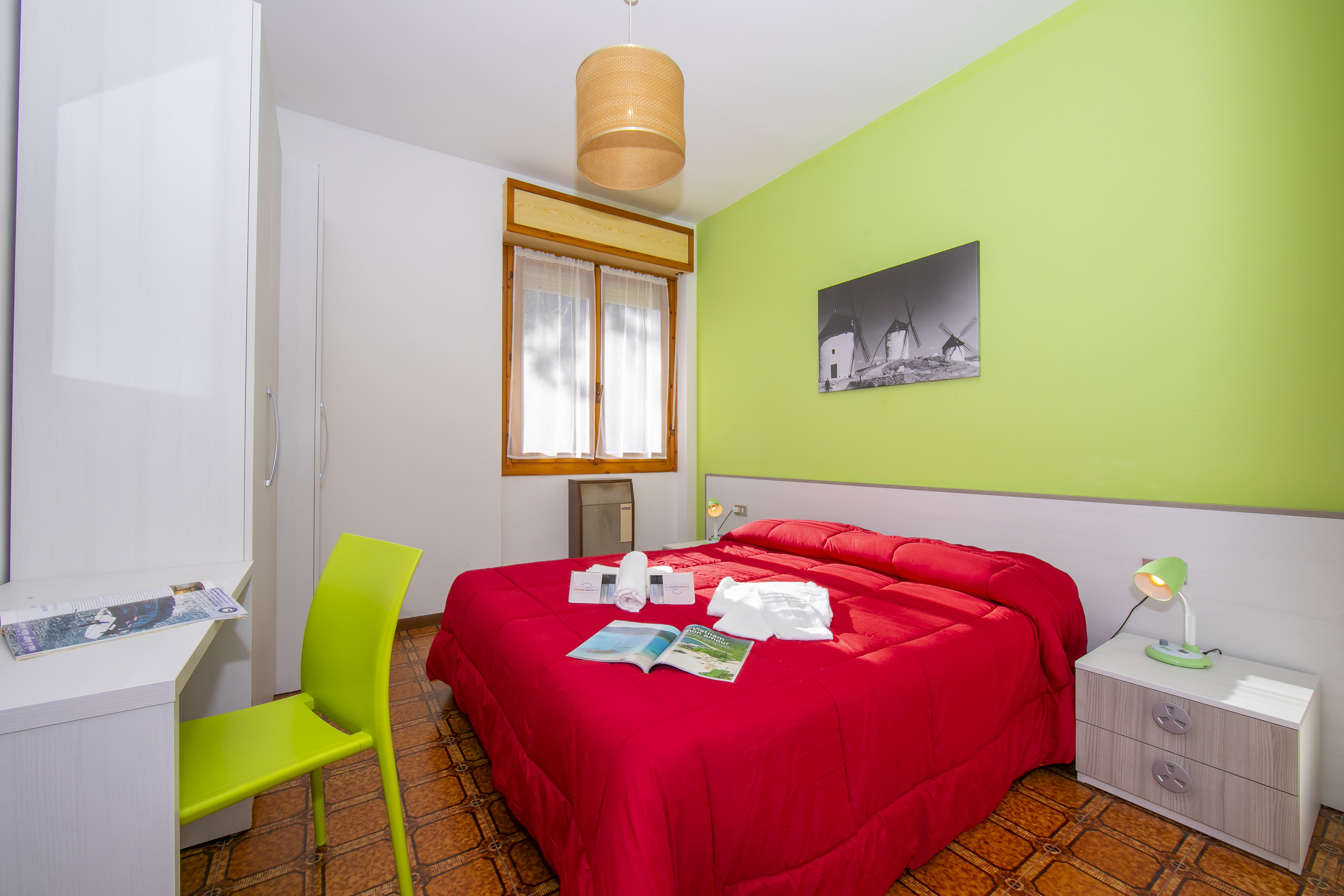 Het appartement op de eerste verdieping heeft twee slaapkamers en biedt plaats aan maximaal vier gasten. De woonkamer heeft een levendige sfeer, een eettafel met uitzicht op het balkon, een bank, een tv en een volledig uitgeruste keuken met een koffiezetapparaat, broodrooster, kookplaat en koelkast. Slaapkamer 1 heeft een tweepersoonsbed, een kledingkast en een werkplek, terwijl slaapkamer 2 een stapelbed heeft. De badkamer is voorzien van een douche, bidet en toilet.