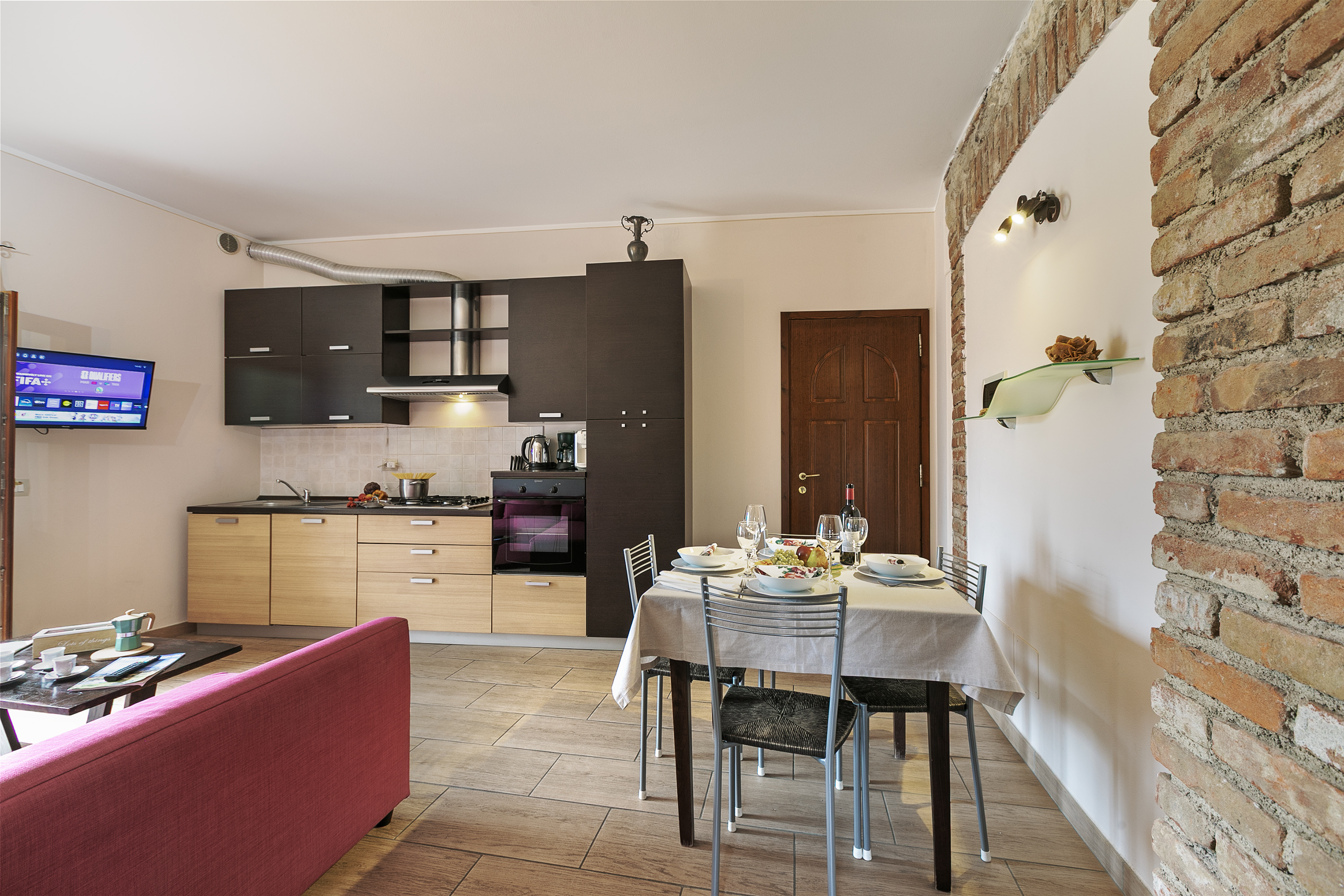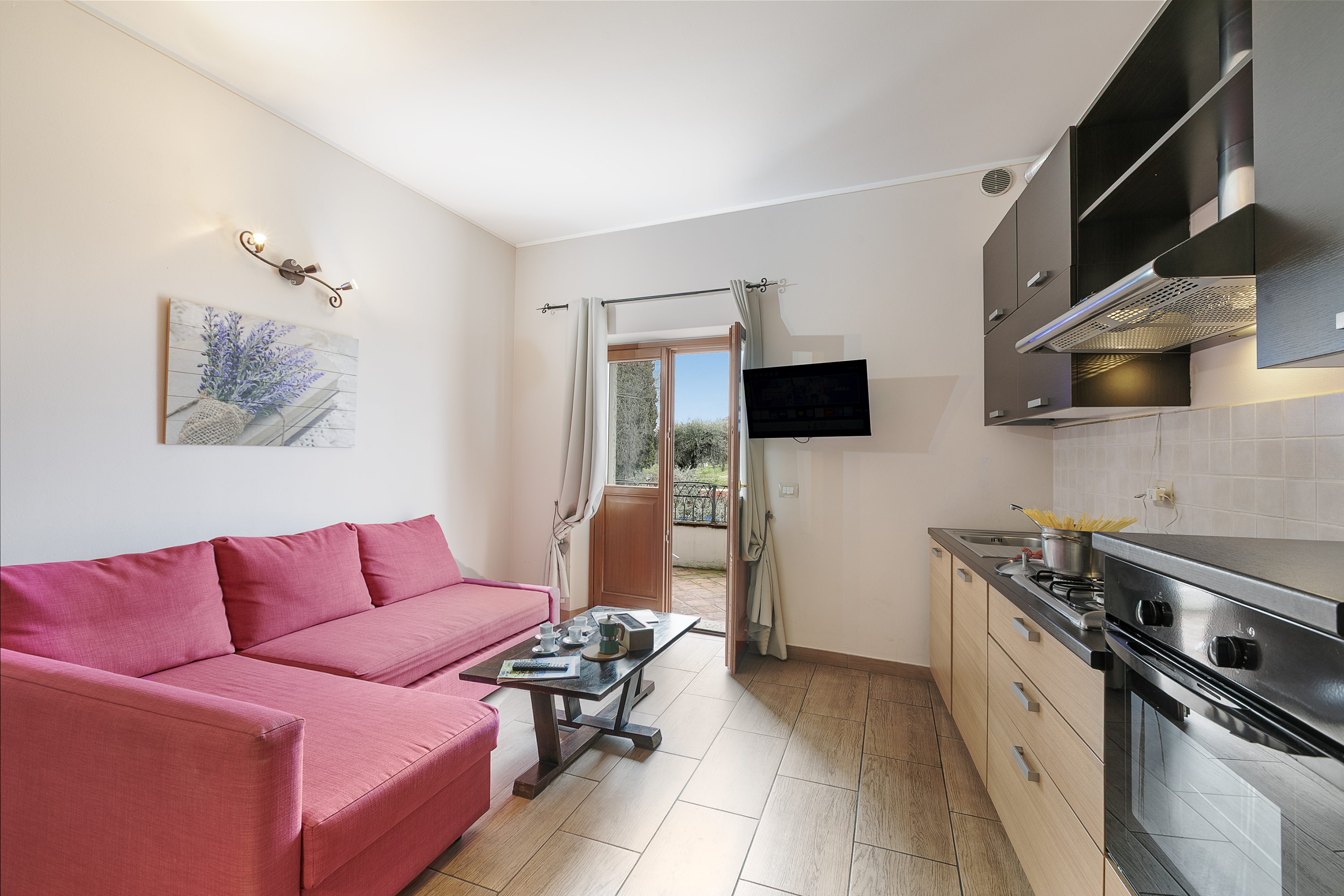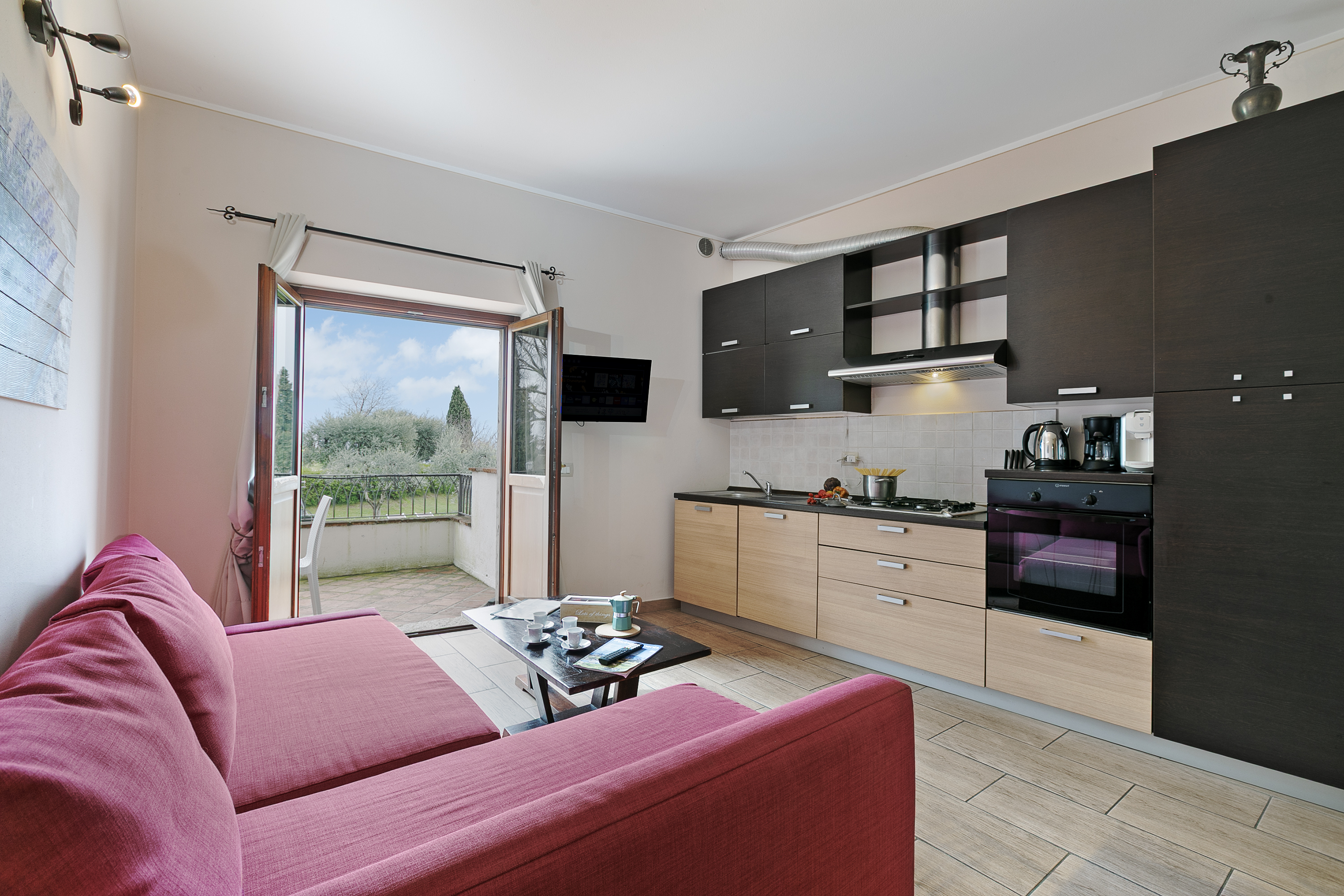 De woonkamer is ingericht met een comfortabel tweepersoonsslaapbank, airconditioning en geeft toegang tot een privébalkon met adembenemend uitzicht op het meer. Het appartement beschikt ook over een ruime en lichte open keuken met eethoek, volledig uitgerust met een koffiezetapparaat, vaatwasser, elektrische waterkoker, oven, kookplaat, koelkast en alle essentiële keukengerei voor een zorgeloos verblijf. Het appartement ligt op de eerste verdieping van een gebouw met twee verdiepingen en biedt een warme, uitnodigende sfeer – perfect voor een ontspannen vakantie.