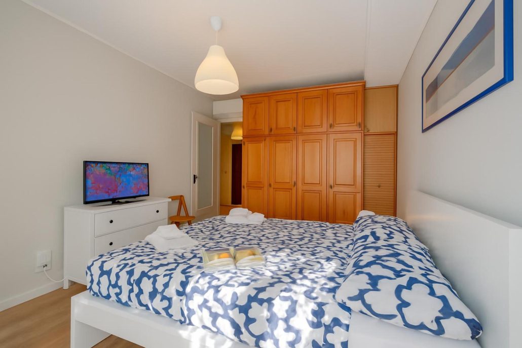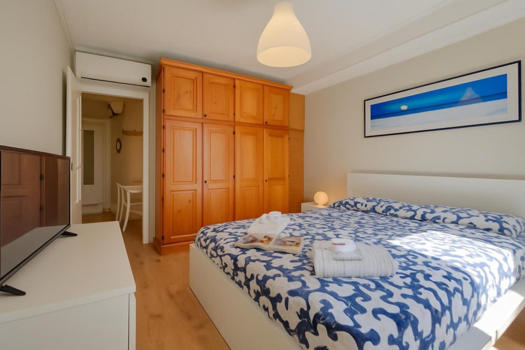 Slaapkamer: De slaapkamer heeft een tweepersoonsbed, een flatscreen-tv en ruime kasten.