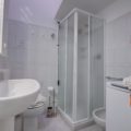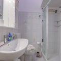 De betegelde badkamer is uitgerust met een douche, wastafel, bidet, wasmachine en toilet.