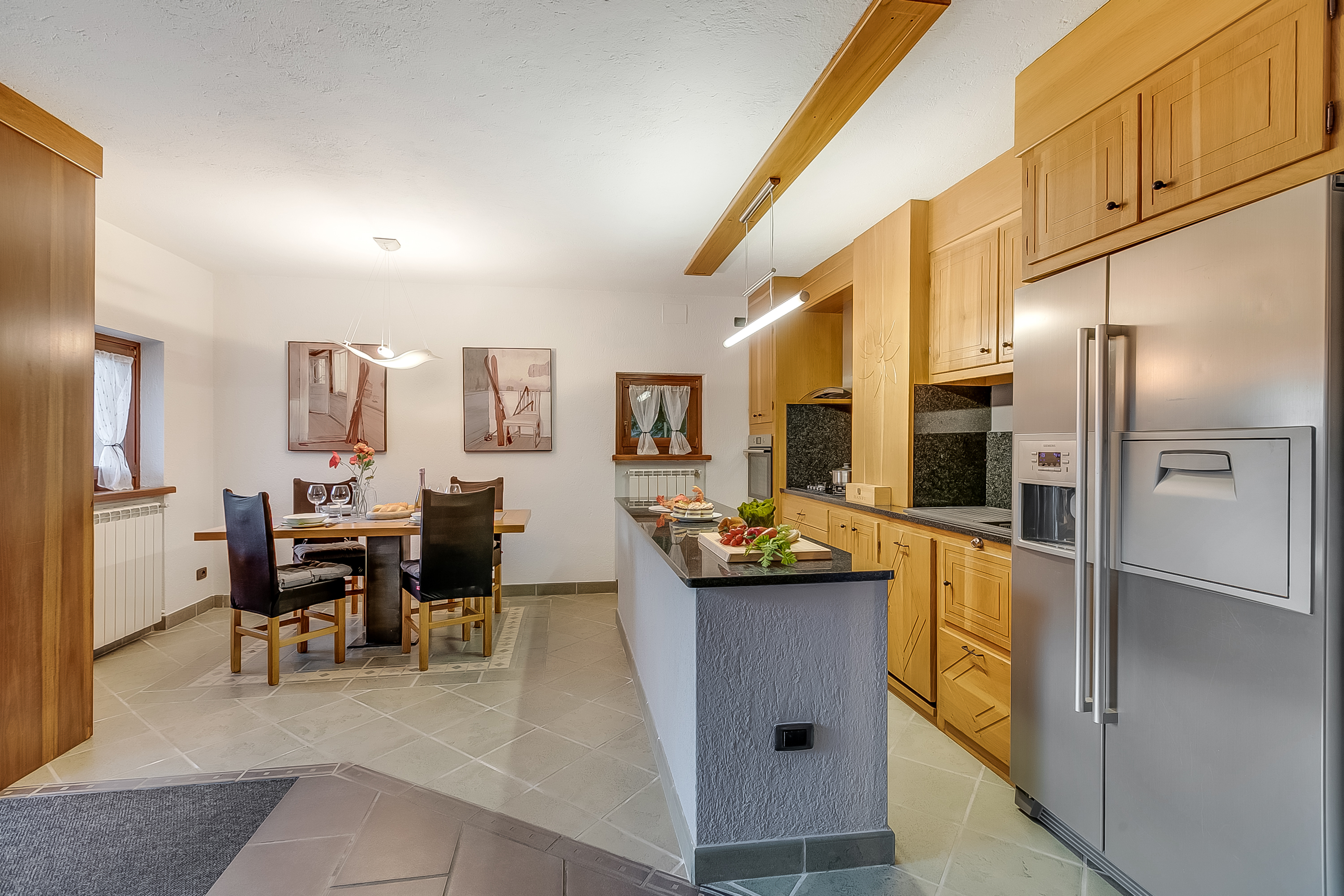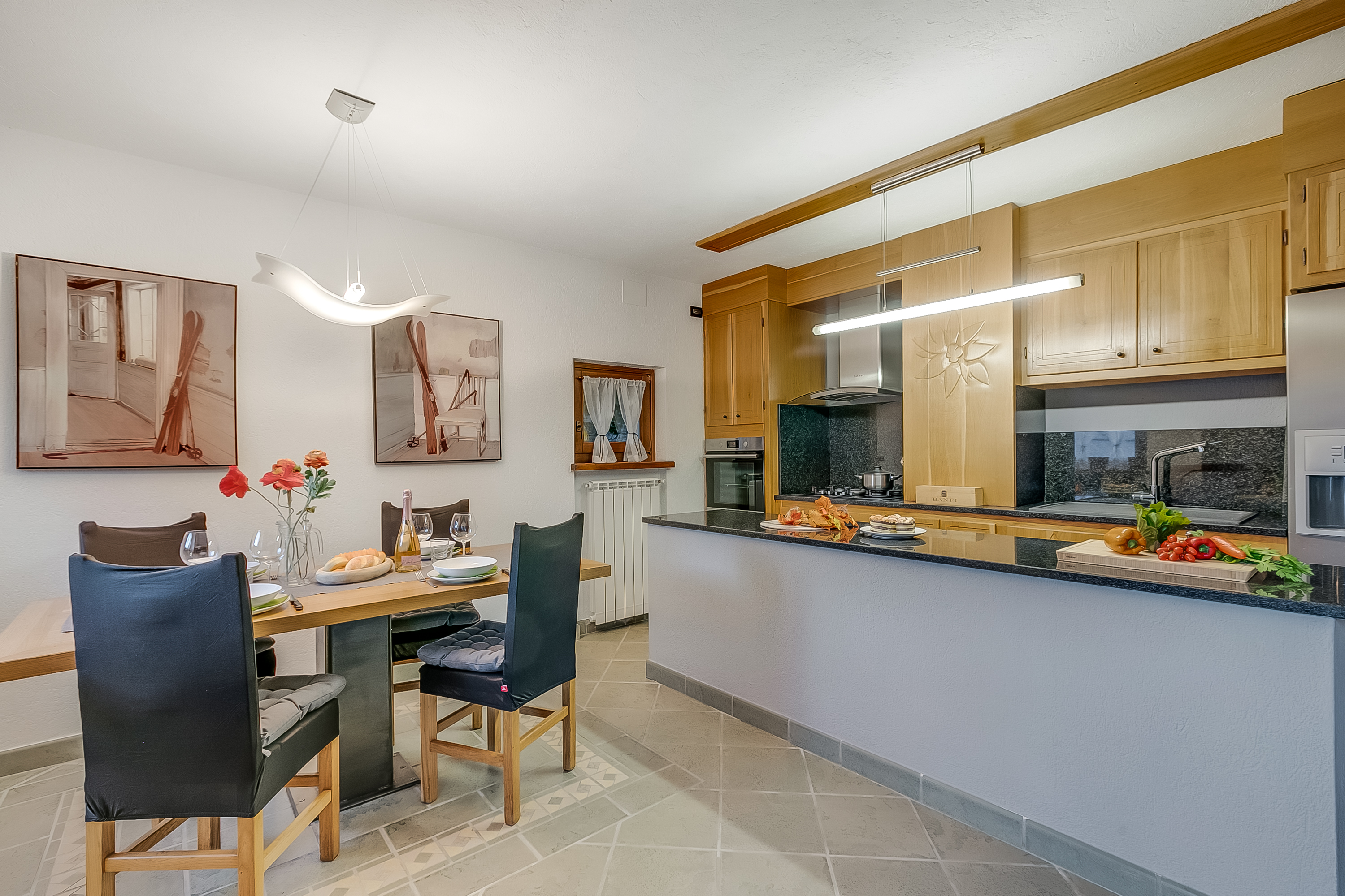 De open woonruimte beschikt over een bank, een fauteuil, een HD-smart-tv en een moderne haard. De eethoek ligt aan de andere kant van de kamer, naast de moderne keuken. De eettafel biedt plaats aan 4 personen en wordt door een eiland van de keuken gescheiden. De stijlvolle keuken is uitgerust met een inductiekookplaat, oven, magnetron, vaatwasser, koffiemachine en een koel-vriescombinatie.