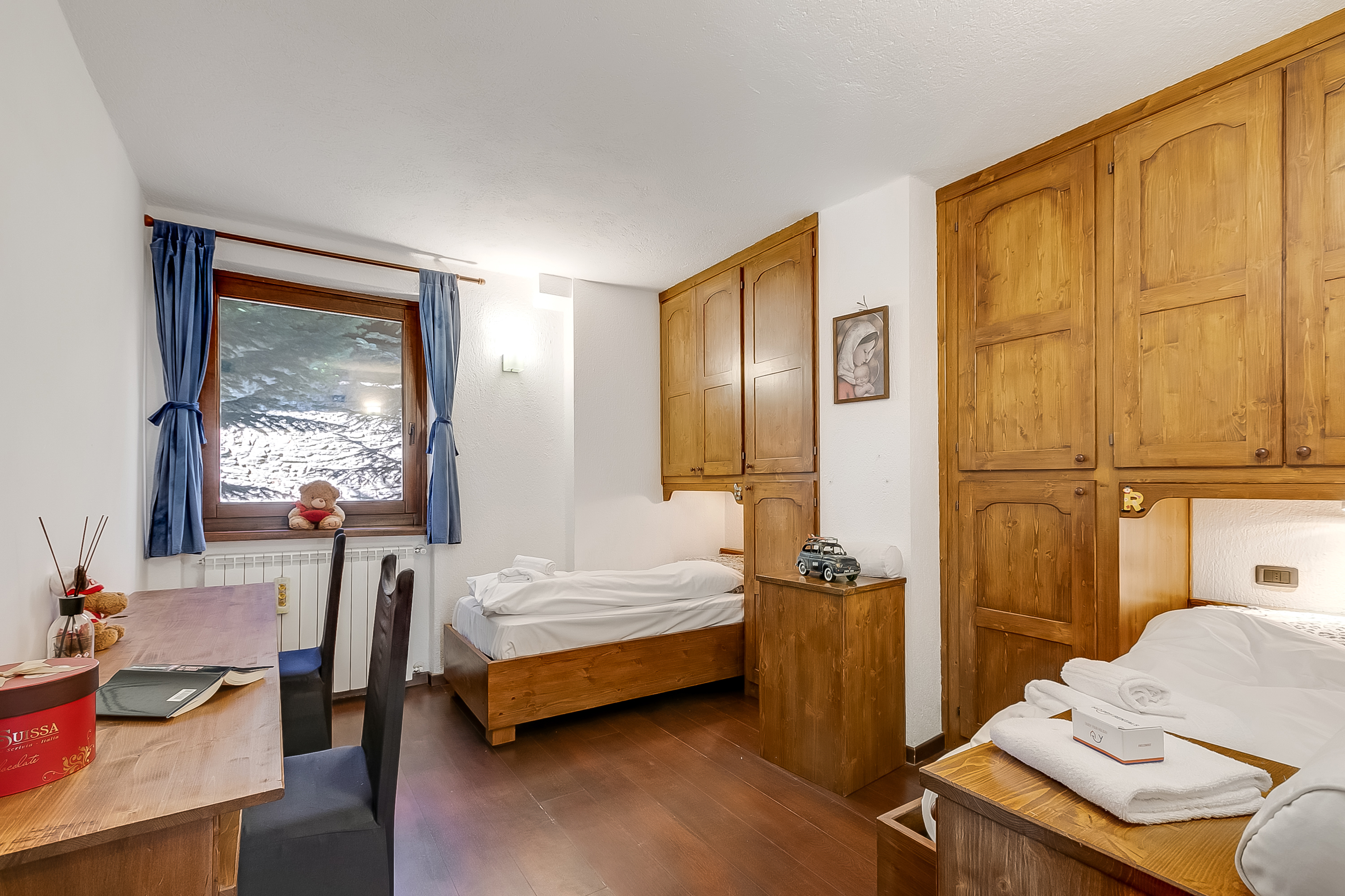 Slaapkamer 2: De tweede slaapkamer heeft aantrekkelijke houten opbergruimte, twee eenpersoonsbedden en een ruime werkplek die geschikt is voor laptops.