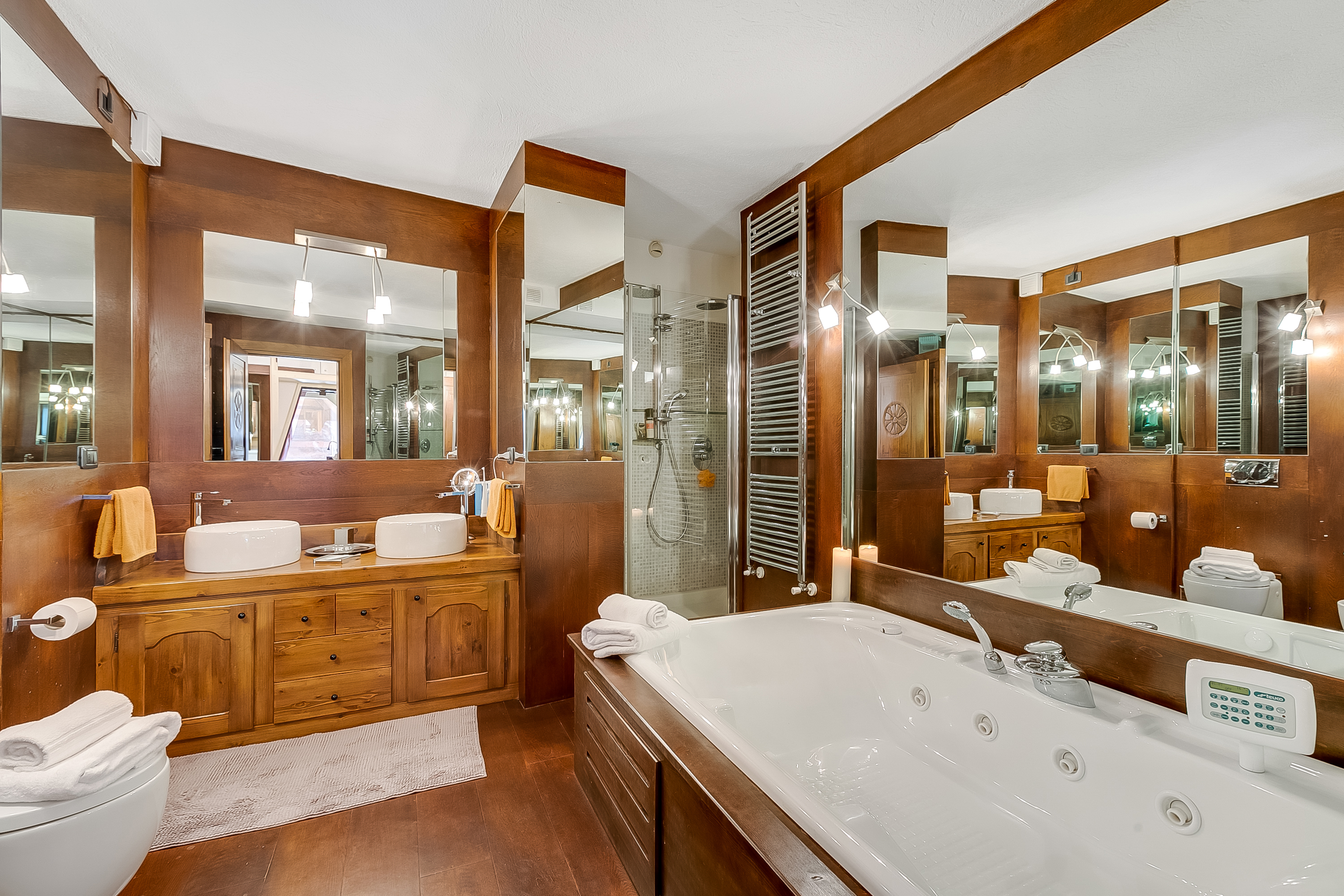 Badkamer 1: Deze luxe, met hout afgewerkte badkamer beschikt over een ligbad/jacuzzi, een aparte douche, dubbele wastafels, bidet en toilet.