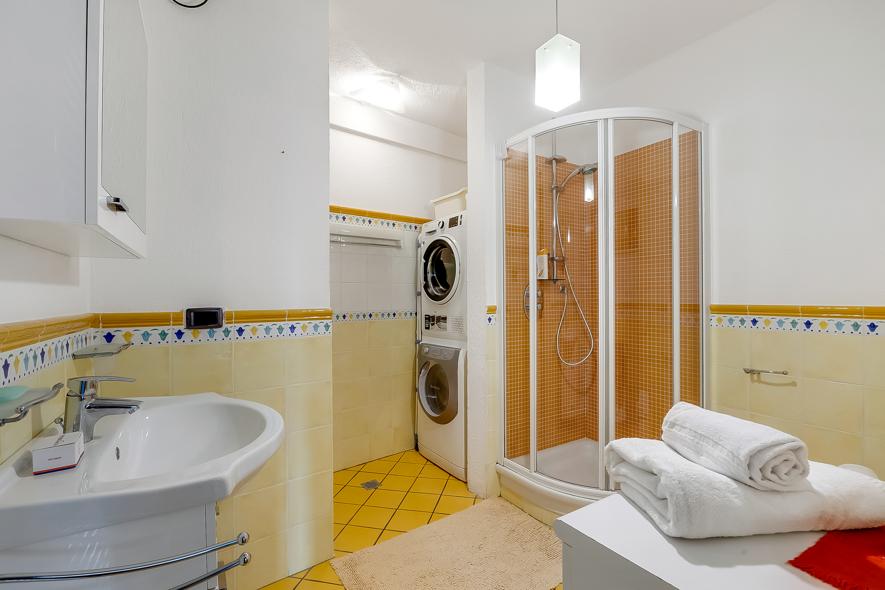 Badkamer 2: Een helder betegelde badkamer met glazen douche, wastafel, bidet, toilet, wasmachine en wasdroger.