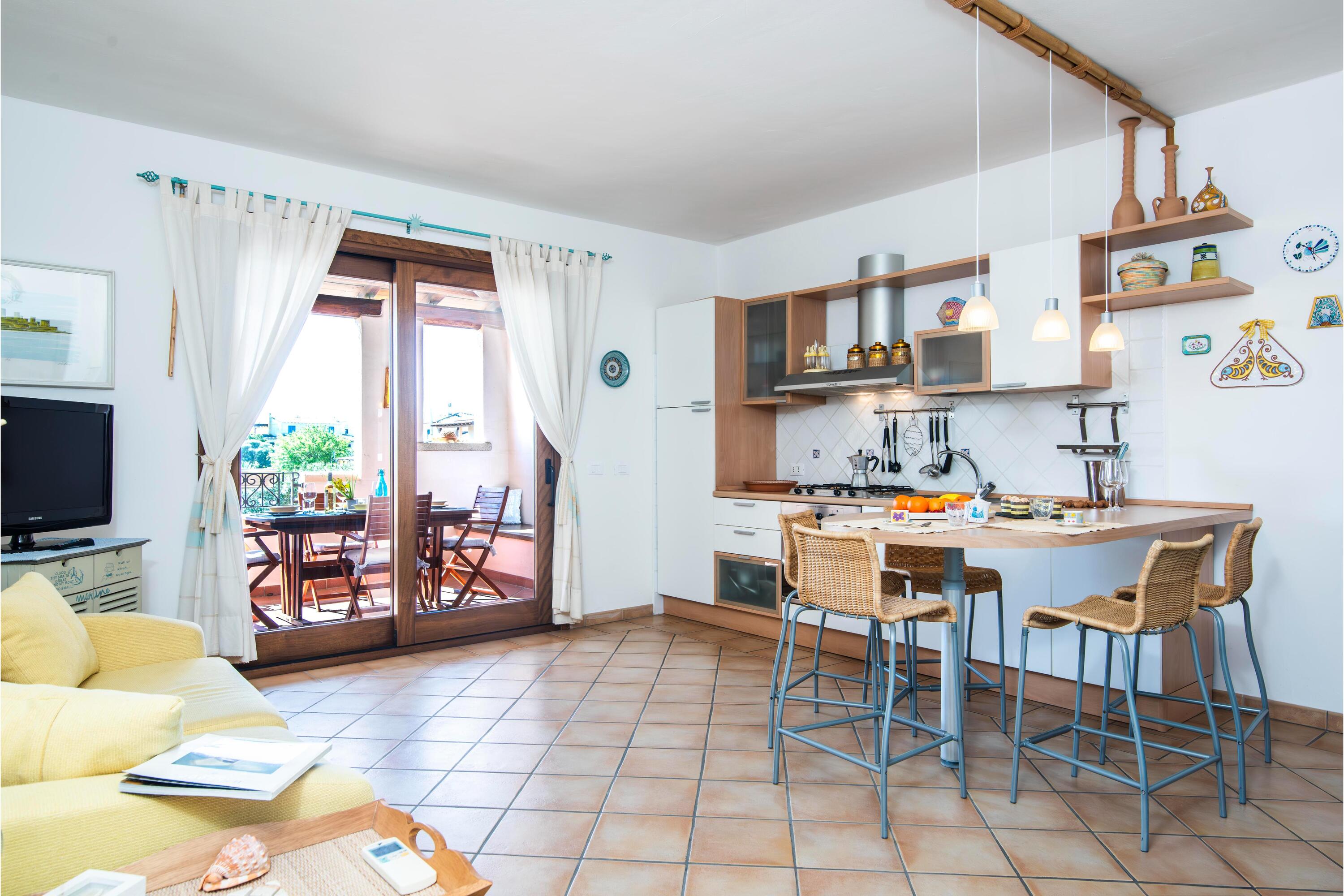 Het appartement heeft een eigentijds interieur, verfraaid met charmante rustieke details. De ruime open woonkamer is doordacht ontworpen met een moderne bank, flatscreen-tv en een verhoogde eettafel met krukken, wat een comfortabele en stijlvolle ruimte creëert om te ontspannen. De strakke, goed uitgeruste keuken beschikt over een kookplaat, oven, koffiezetapparaat en koel-/vriescombinatie – ideaal om gemakkelijk maaltijden te bereiden. Openslaande deuren leiden naar een schaduwrijk terras dat dienstdoet als een uitnodigende buiten eetruimte. Ingericht met een tafel en stoelen, is het de perfecte plek om buiten te eten in een rustige omgeving.