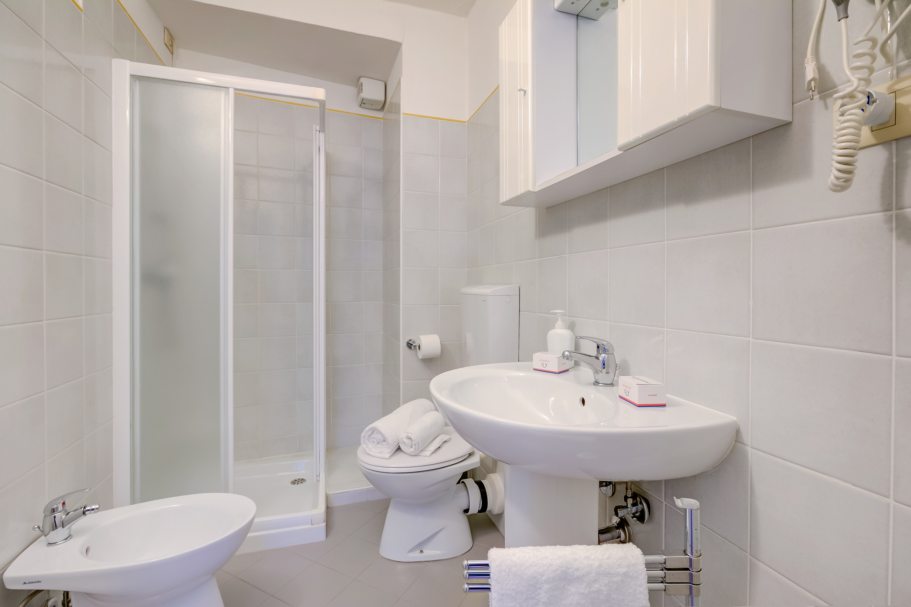 Een badkamer met een bidet, een douche en een toilet.