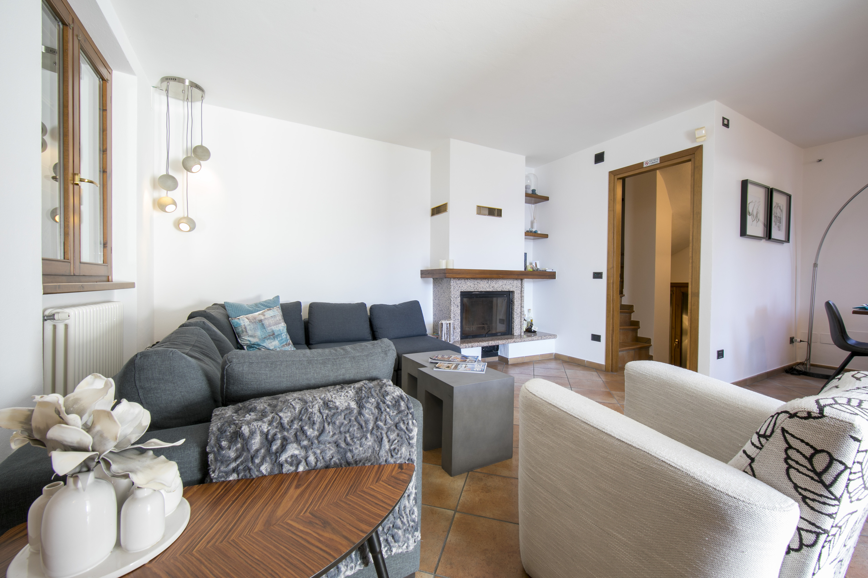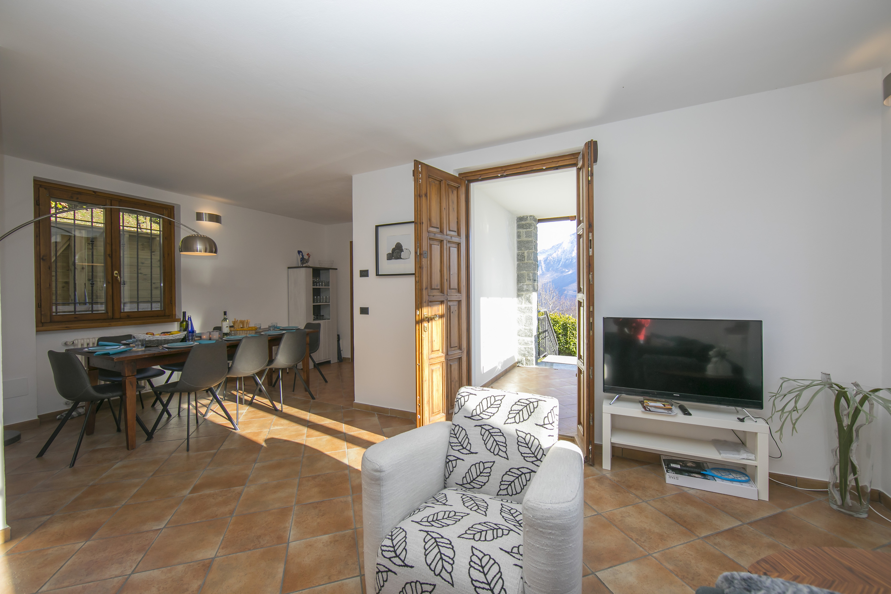 De begane grond beschikt over een lichte en ruime woonkamer, ingericht met een L-vormige bank, een gezellige open haard en een flatscreen-tv. Een stijlvolle eetruimte voor 8 personen completeert de ruimte. Bovendien bevindt zich op deze verdieping een aparte keuken met uitzicht op het meer, die volledig is uitgerust met een gasfornuis, oven, vaatwasser en koelkast met vriezer. Vanuit de woonkamer kunnen gasten naar een overdekt terras in alfresco-stijl. Eén kant van het terras is open, terwijl de andere is afgesloten met een groot panoramisch raam, wat een beschutte ruimte biedt om te genieten van het uitzicht op het meer en de bergen tijdens onvergetelijke maaltijden in de buitenlucht.