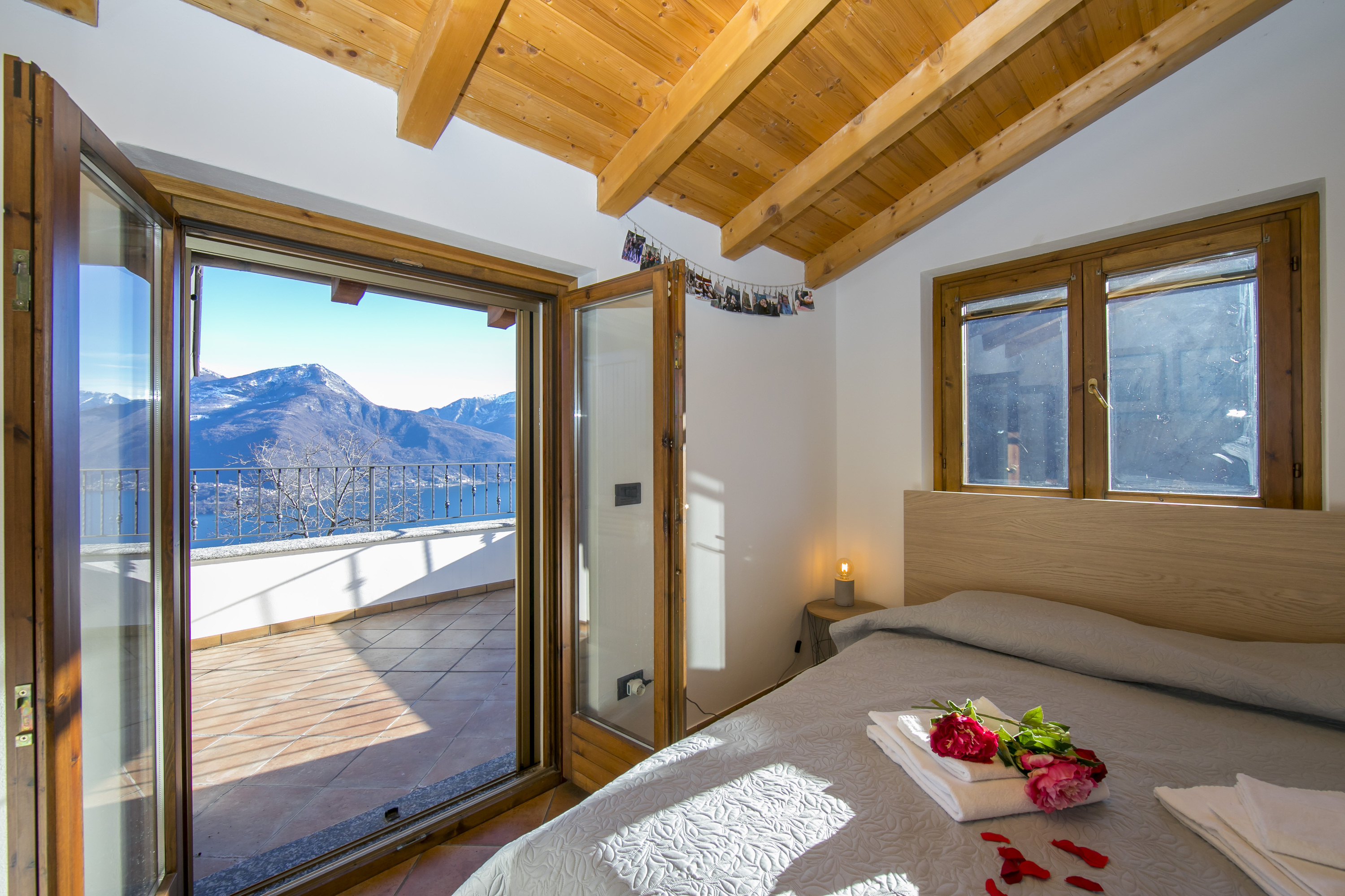 Slaapkamer 2: Een even aantrekkelijke tweepersoonskamer met uitzicht op het meer, kast en toegang tot het terras