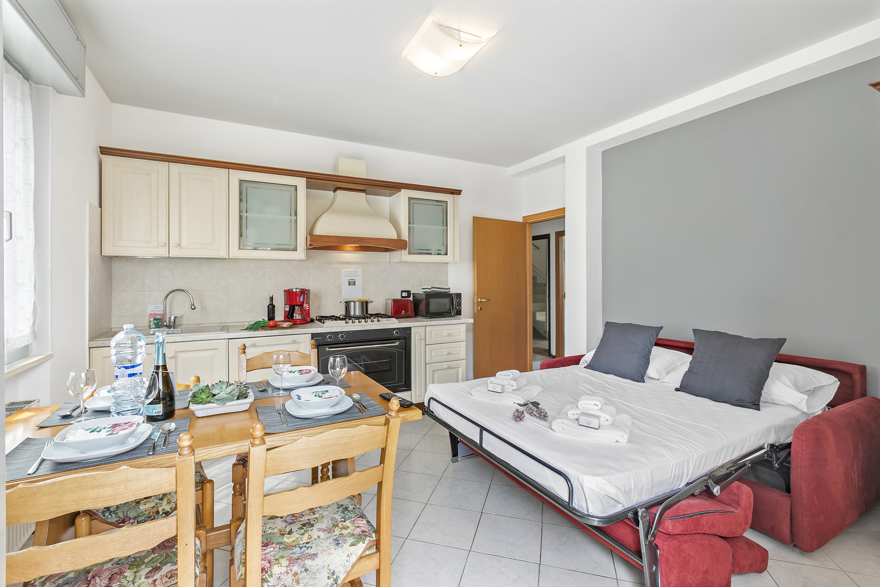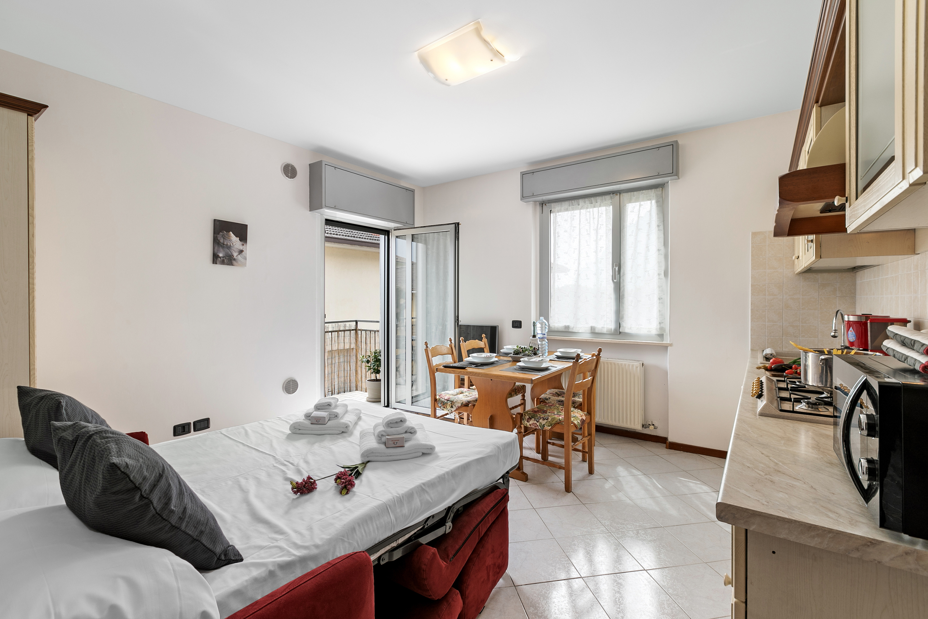 Binnen heeft het toevluchtsoord met één slaapkamer een moderne, ruime indeling met een open woonkamer met een smart-tv en een volledig uitgeruste kitchenette. Voorzieningen zoals een Melita koffiezetapparaat, magnetron, vaatwasser, broodrooster en koelkast staan tot uw beschikking voor een geheel zorgeloze zelfbedieningsvakantie in Riva del Garda.