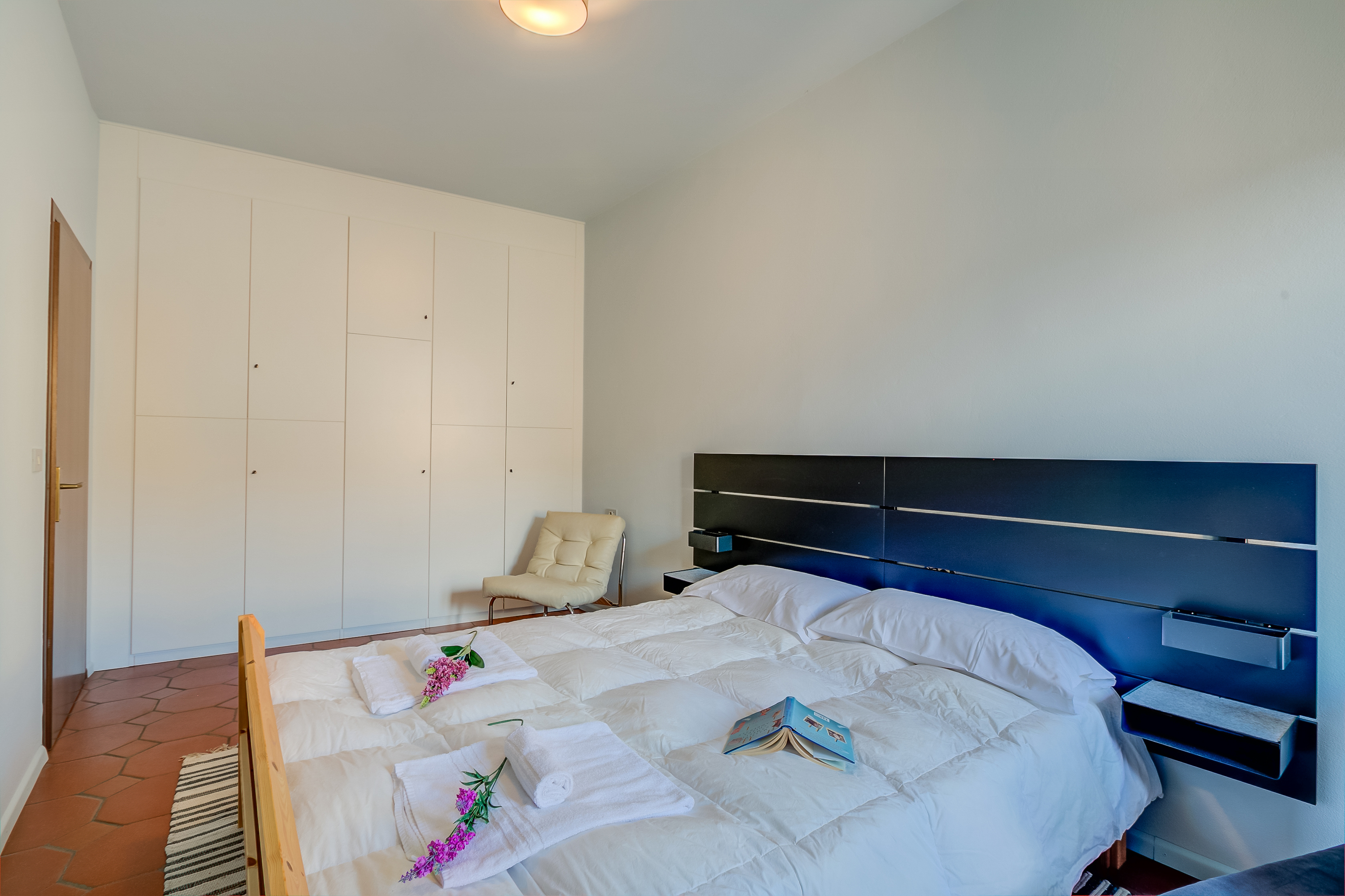 De luchtige hoofdslaapkamer is voorzien van een tweepersoonsbed, een chaise longue en een uitgebreide kledingkast.