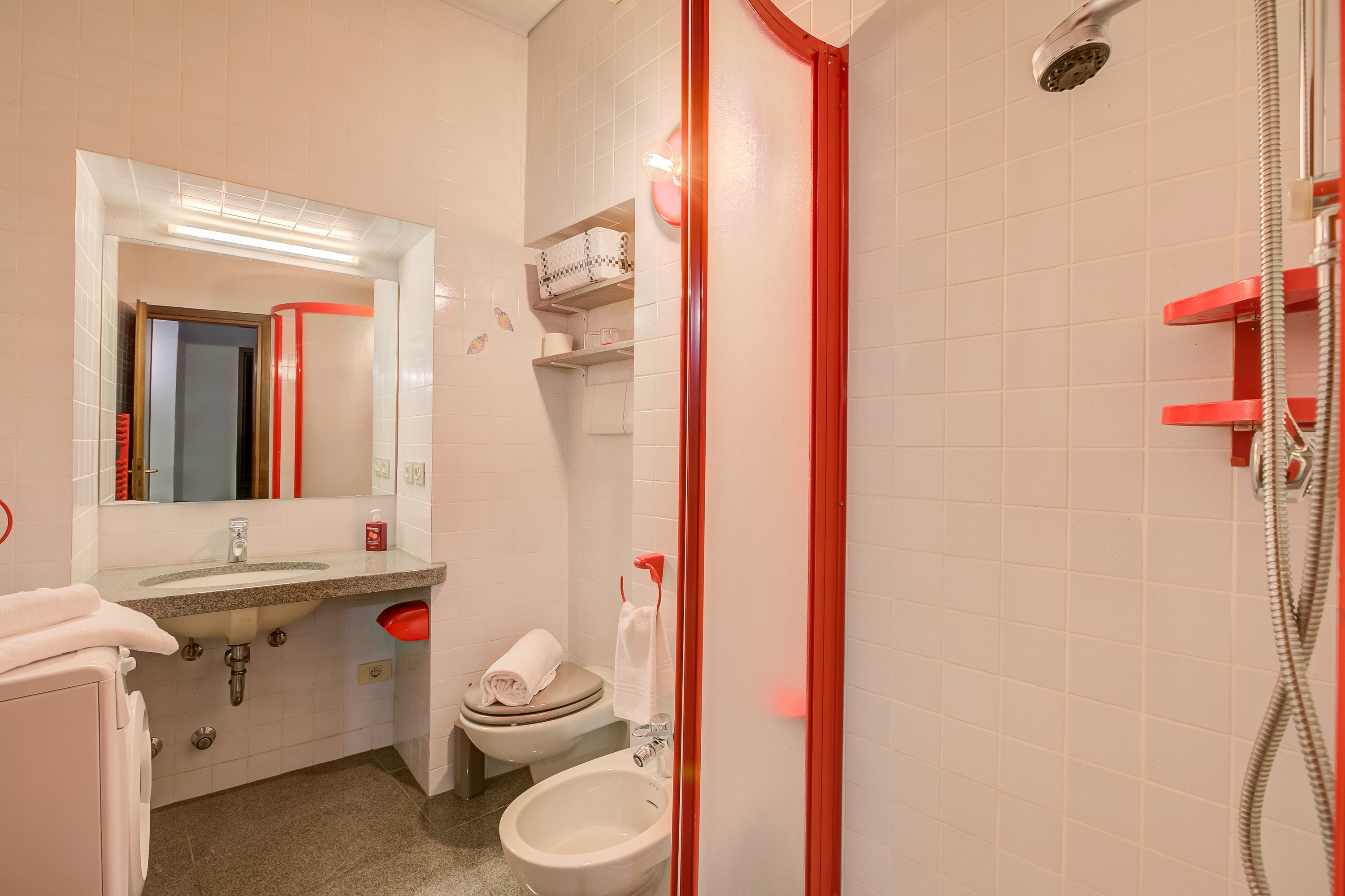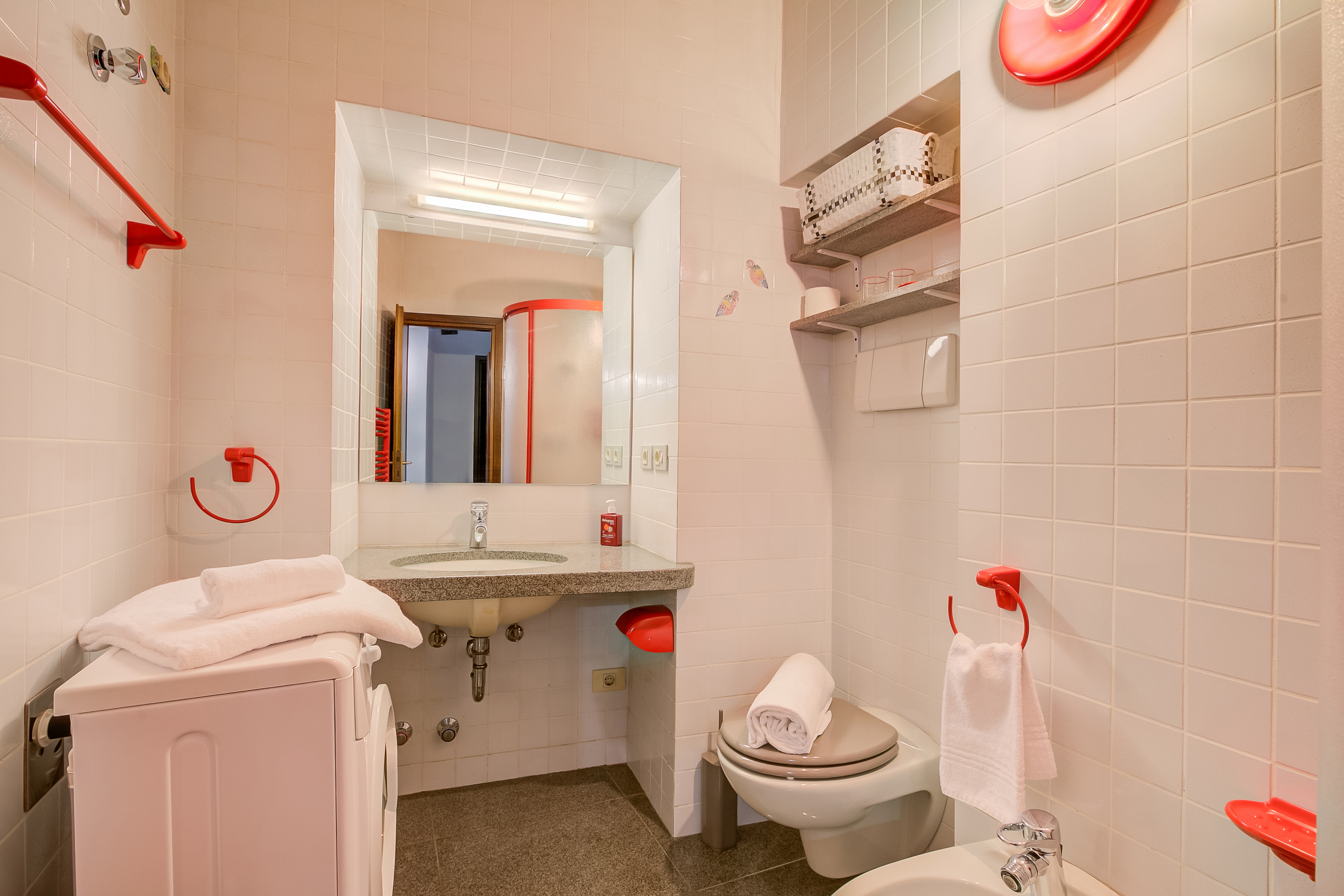 De vrolijke moderne badkamer is voorzien van een inloopdouche, wastafel, toilet, bidet en wasmachine