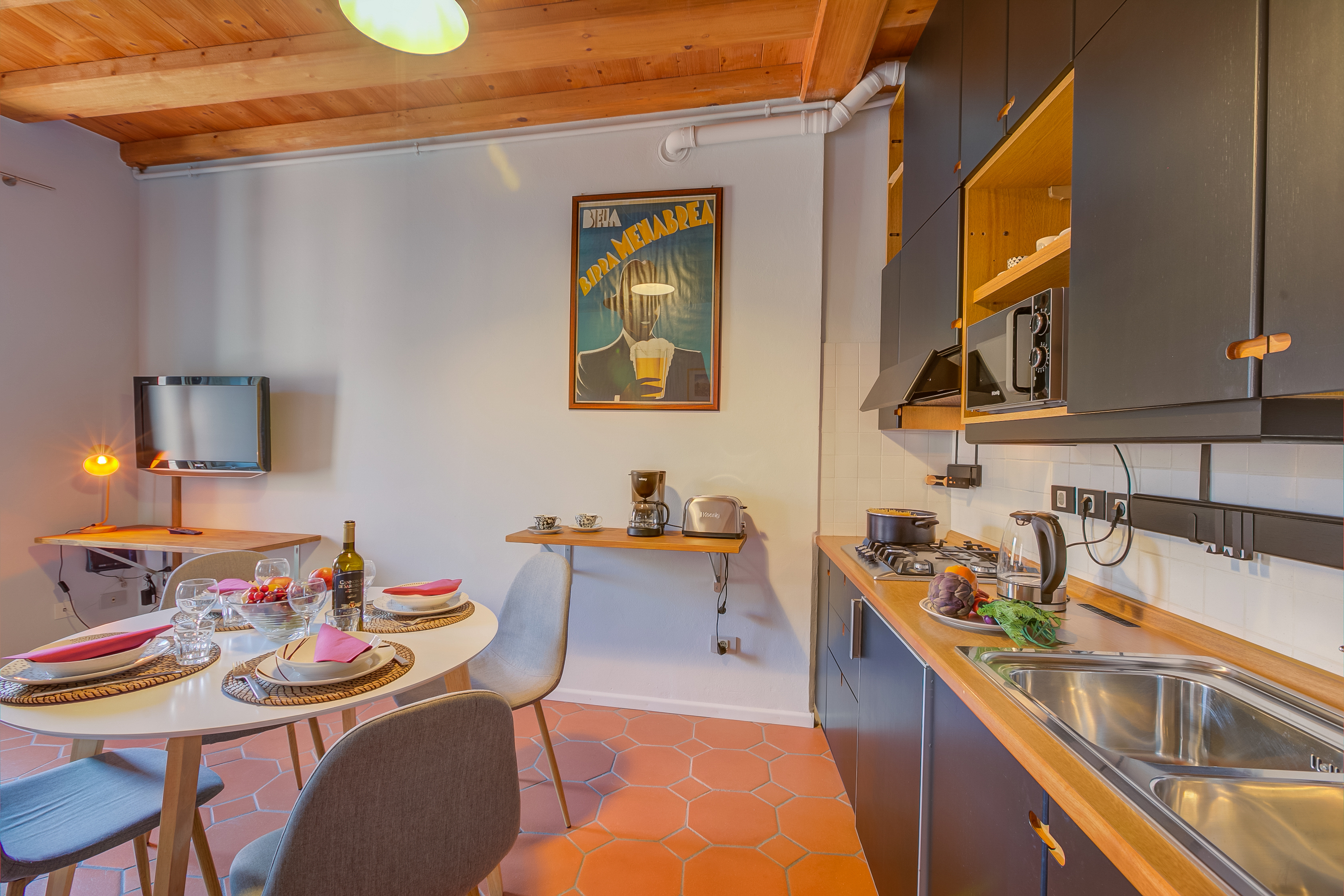 Hoewel het gebouw enkele honderden jaren oud is, heeft het appartement een eigentijds interieur. Het bestaat uit een ruime woonkamer met houten balkenplafonds, die is ingericht met een elegante bank, een smart-tv en een eettafel en stoelen. Daarnaast is er een ingerichte kitchenette. Deze is voorzien van een kookplaat, magnetron, koffiezetapparaat, koelkast/vriezer en een waterkoker.
