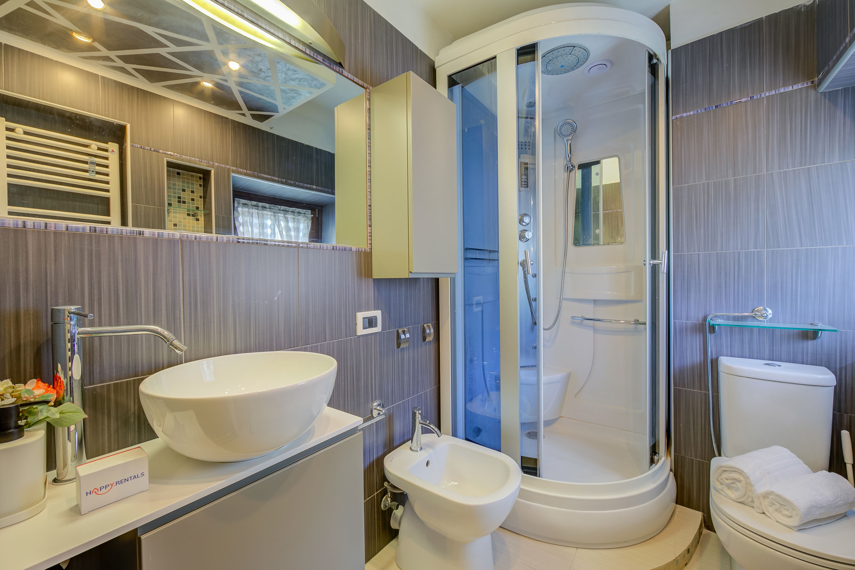 Badkamer: De moderne badkamer is voorzien van een douche, een bidet, een wastafel en een toilet.