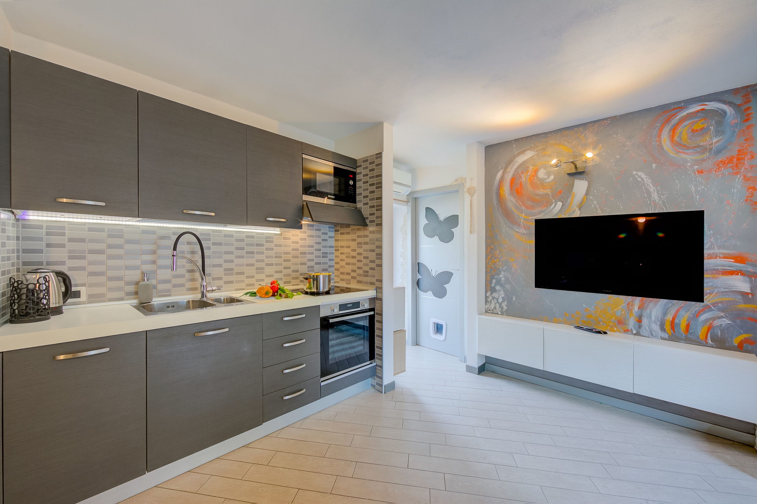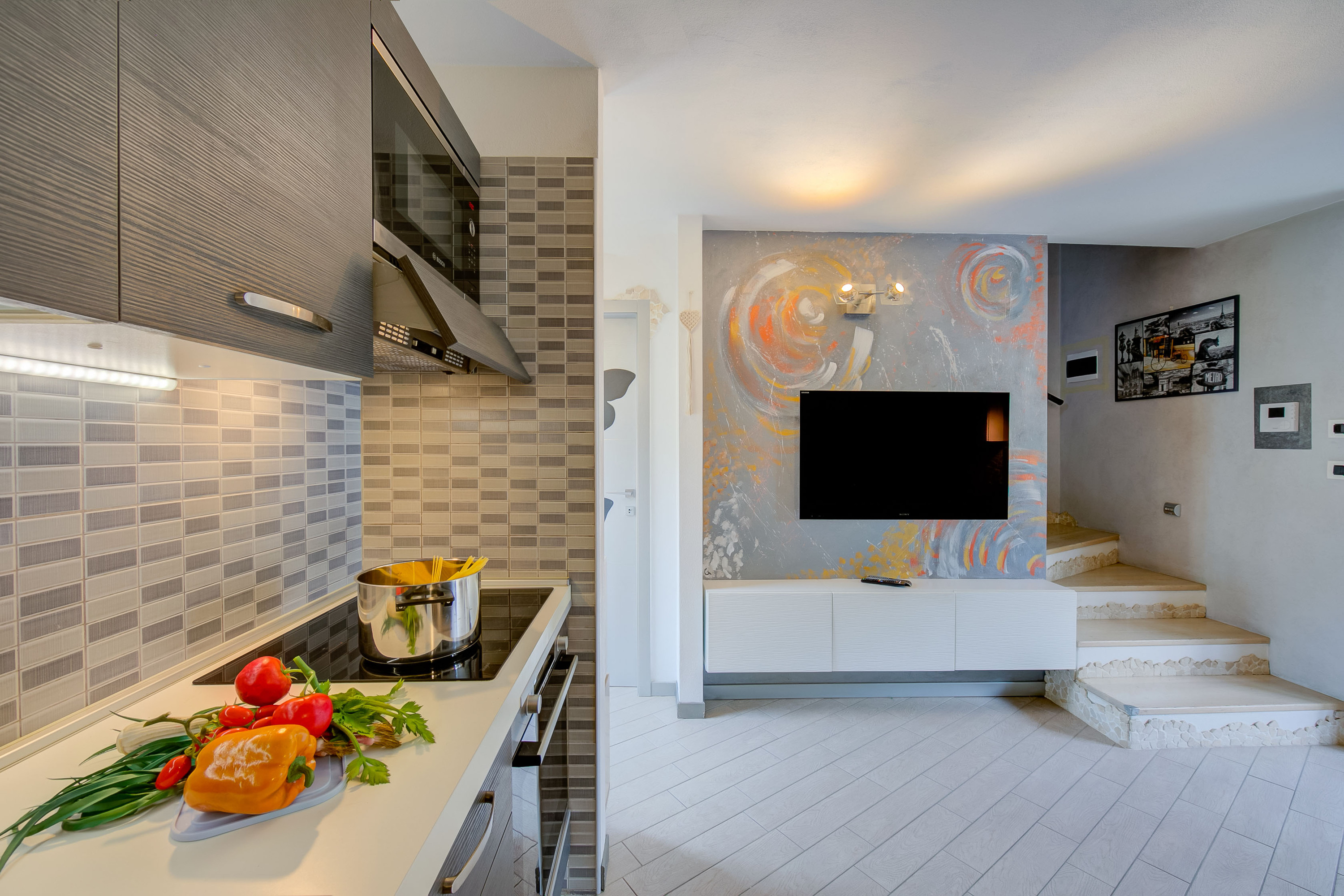 Het pand is verdeeld over twee verdiepingen en het interieur is onlangs gerenoveerd en stijlvol ingericht. De ruime open woonkamer is voorzien van een moderne keuken en is ingericht met een flatscreen-HD-satelliet-tv en een comfortabele bank. De keuken is voorzien van; een oven, inductiekookplaat, koffiezetapparaat, magnetron, vaatwasser, koelkast met vriesvak en een eiland met vier krukken.