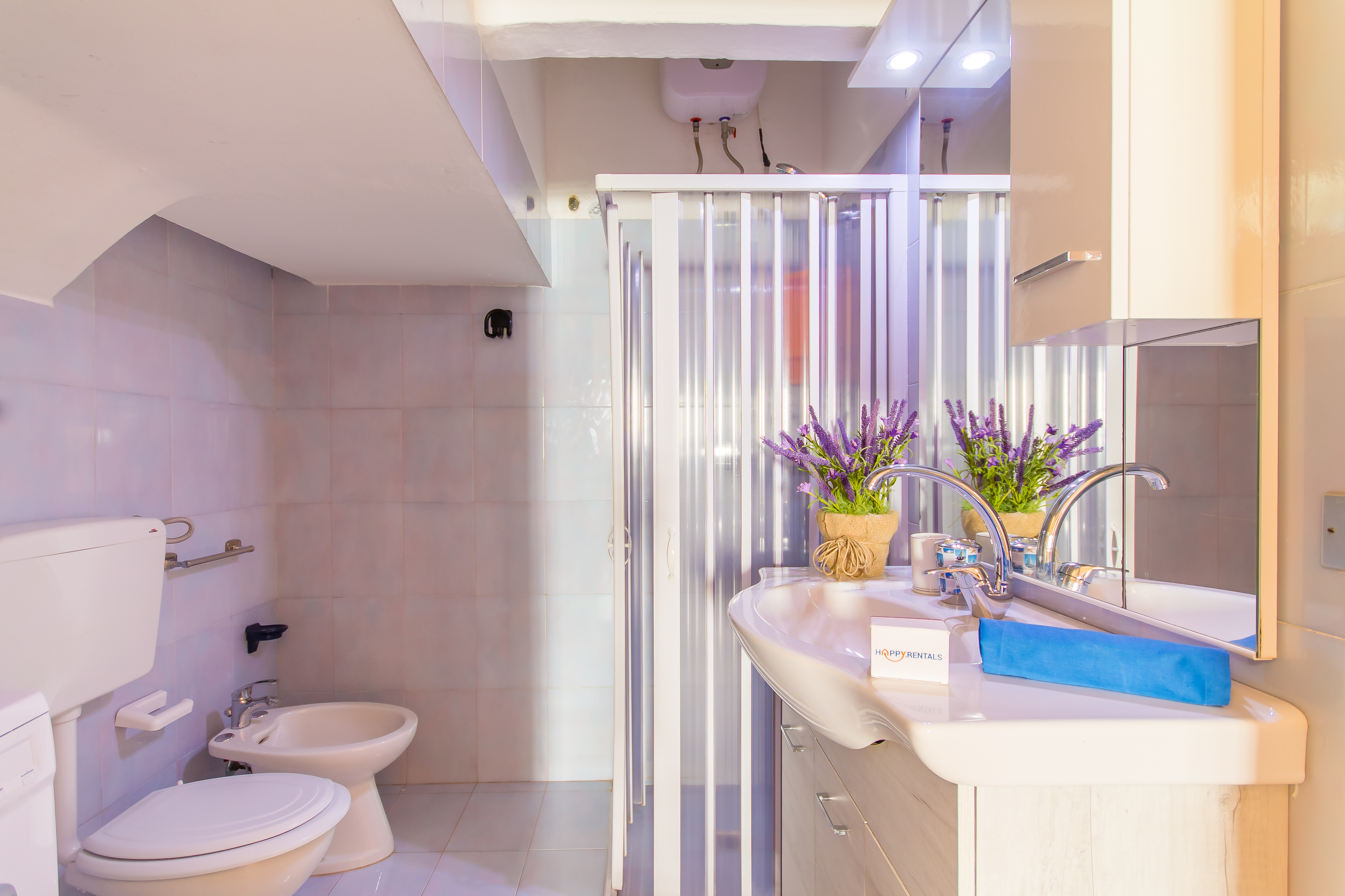 - Badkamer 1: Een betegelde badkamer met een douche, bidet en WC.