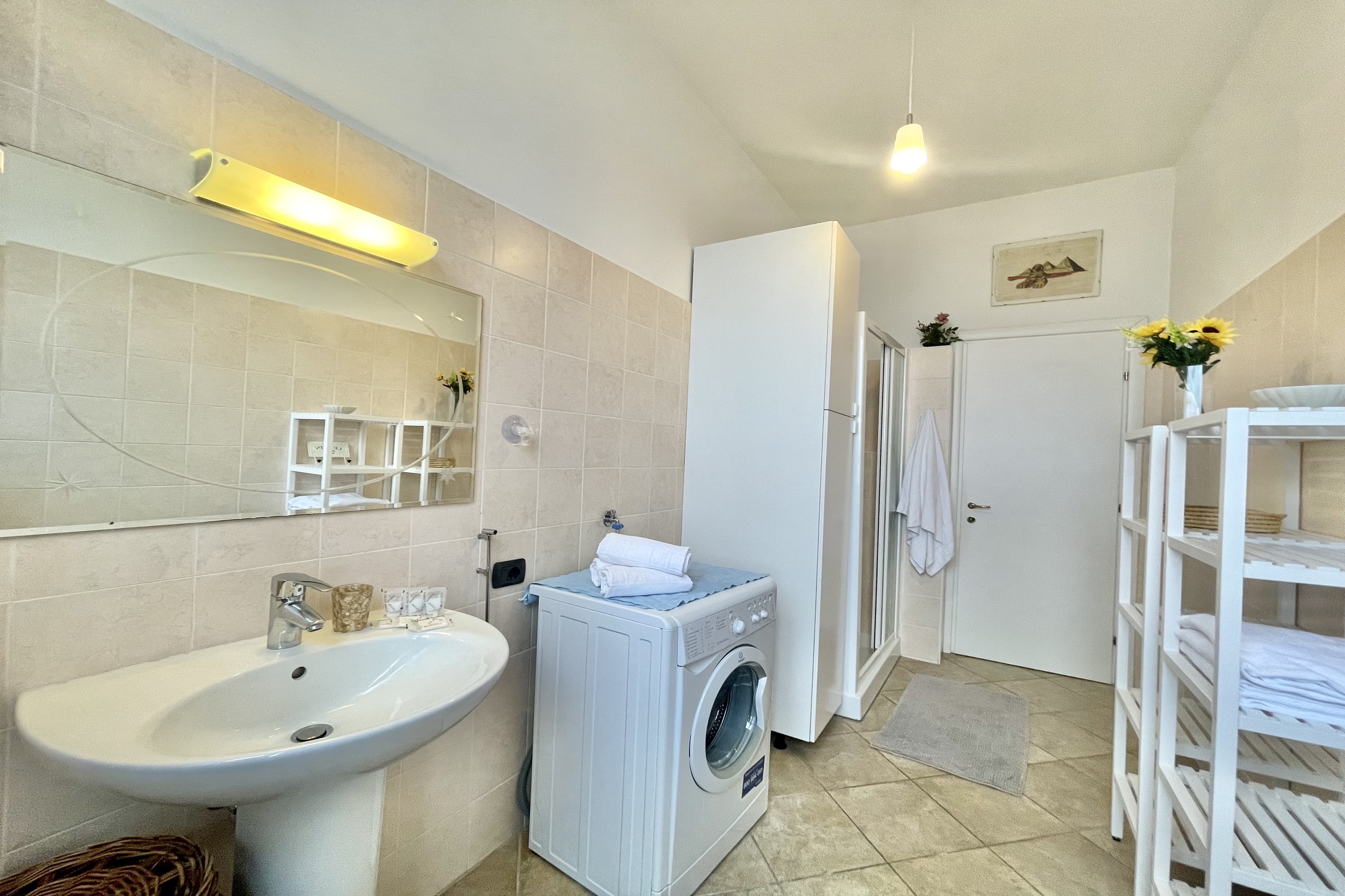 De volledige gezinsbadkamer heeft een douche, wc, bidet, haardroger en een wasmachine.
