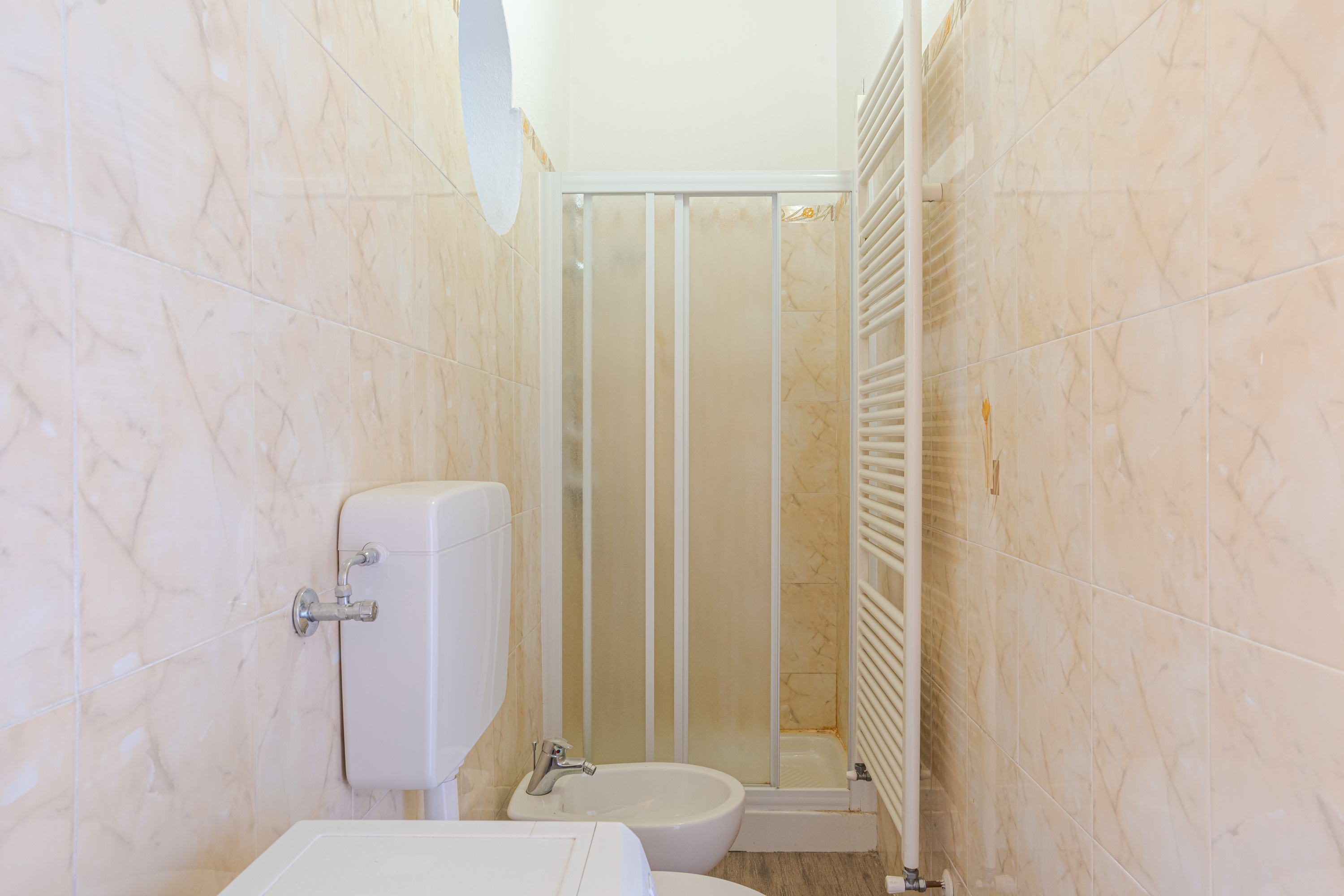 Vanuit de master slaapkamer is er toegang tot een moderne en-suite badkamer, uitgerust met een douchecabine, wastafel, toilet en bidet.