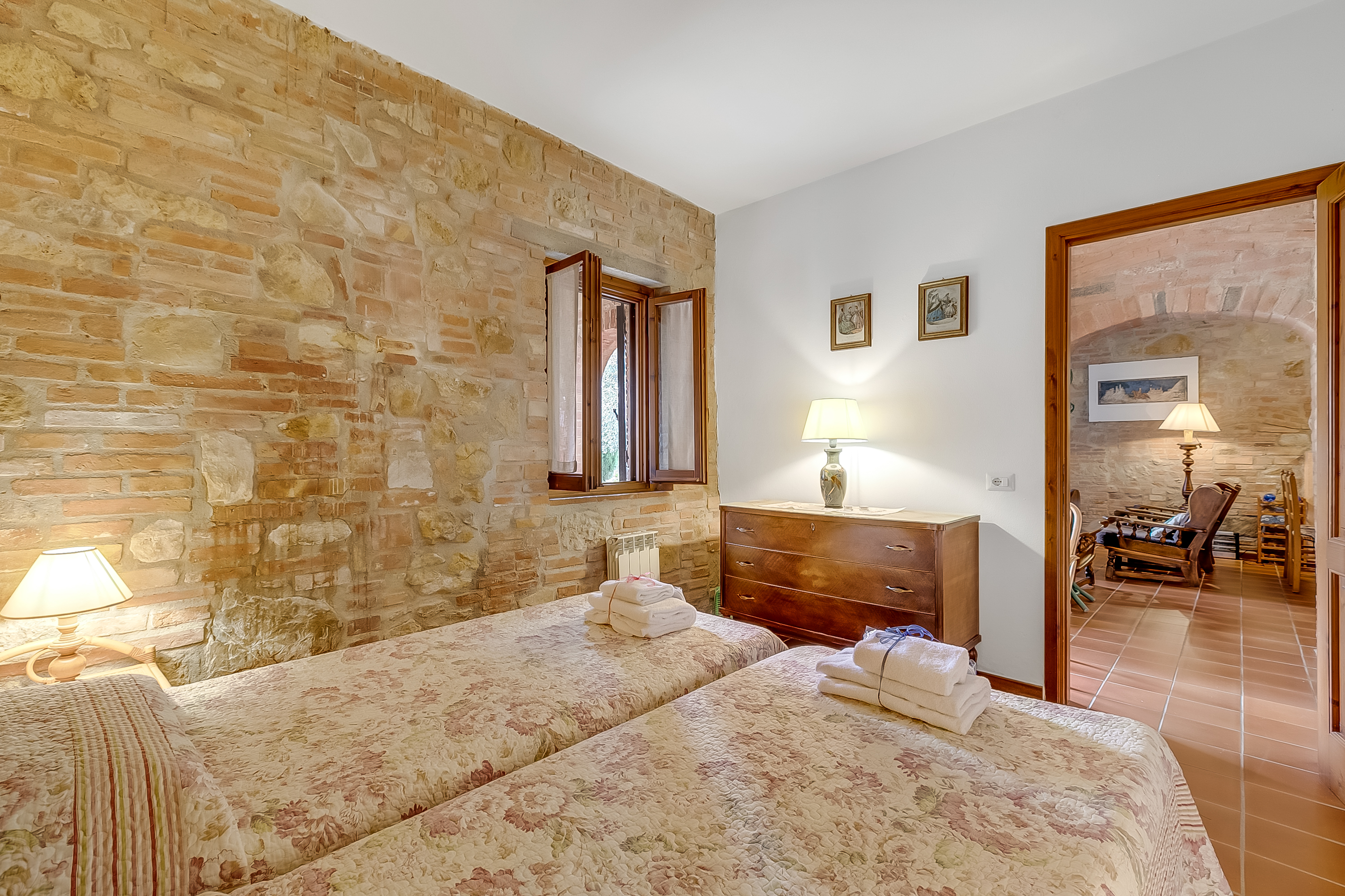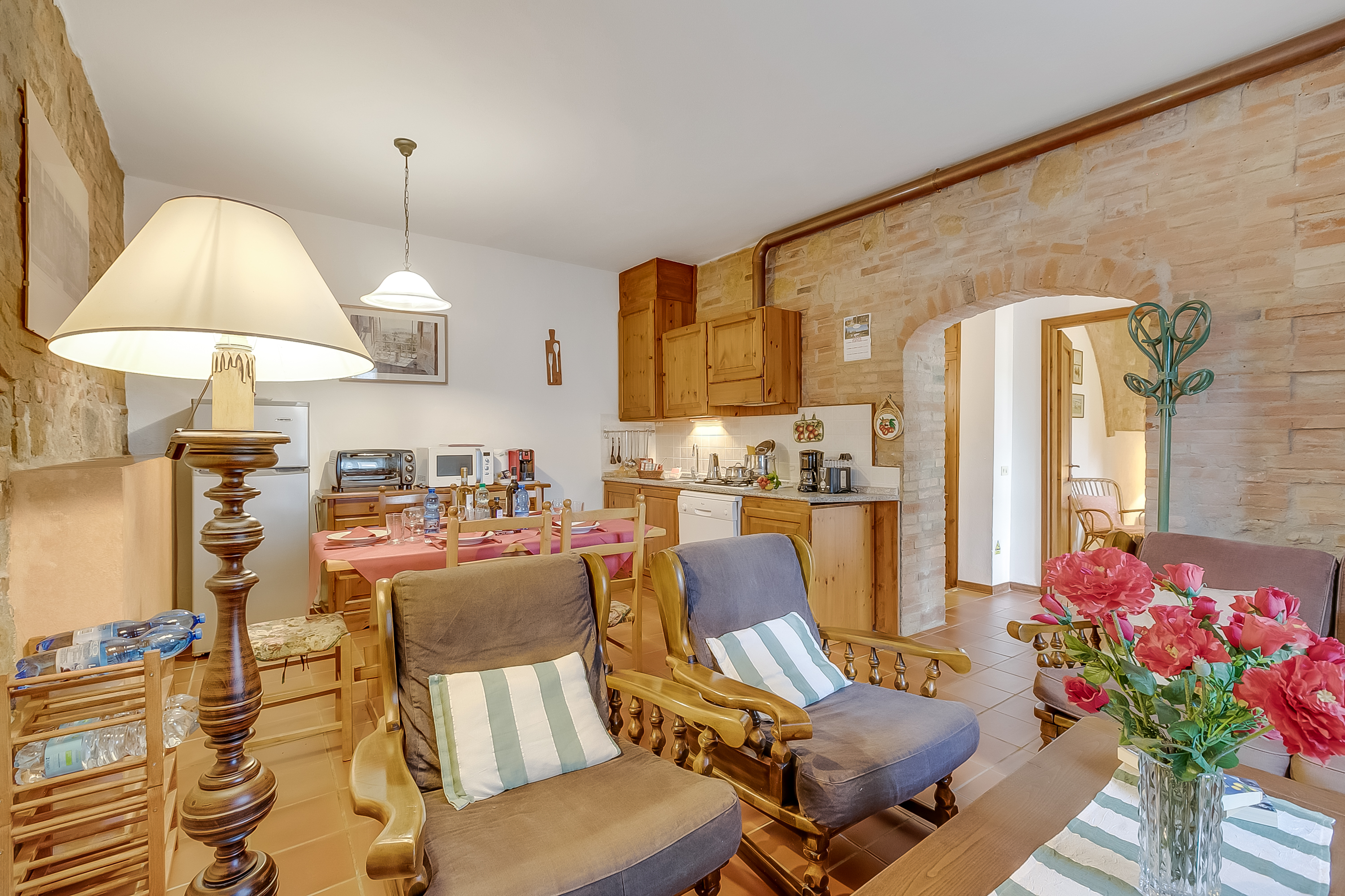 Het appartement op de begane grond (er zijn vijf treden naar de ingang) is traditioneel gebouwd met terracottavloeren en stenen muren. De open woonruimte bestaat uit een bank, fauteuils en een flatscreentelevisie. Naast de goed uitgeruste keuken staat een eettafel voor zes personen. De keuken is voorzien van een kookplaat, oven, vaatwasser, koel-vriescombinatie, koffiezetapparaat en broodrooster. Gasten kunnen ook buiten eten op het privéterras voor de deur.