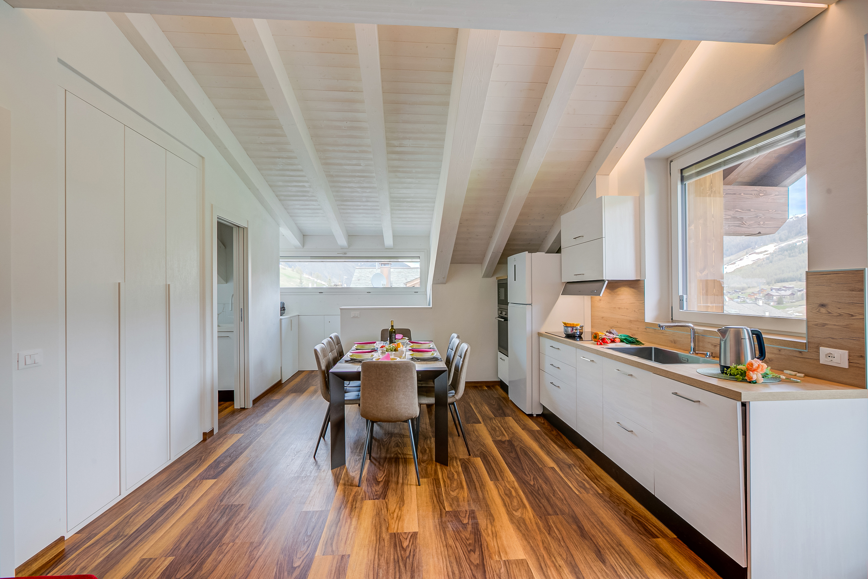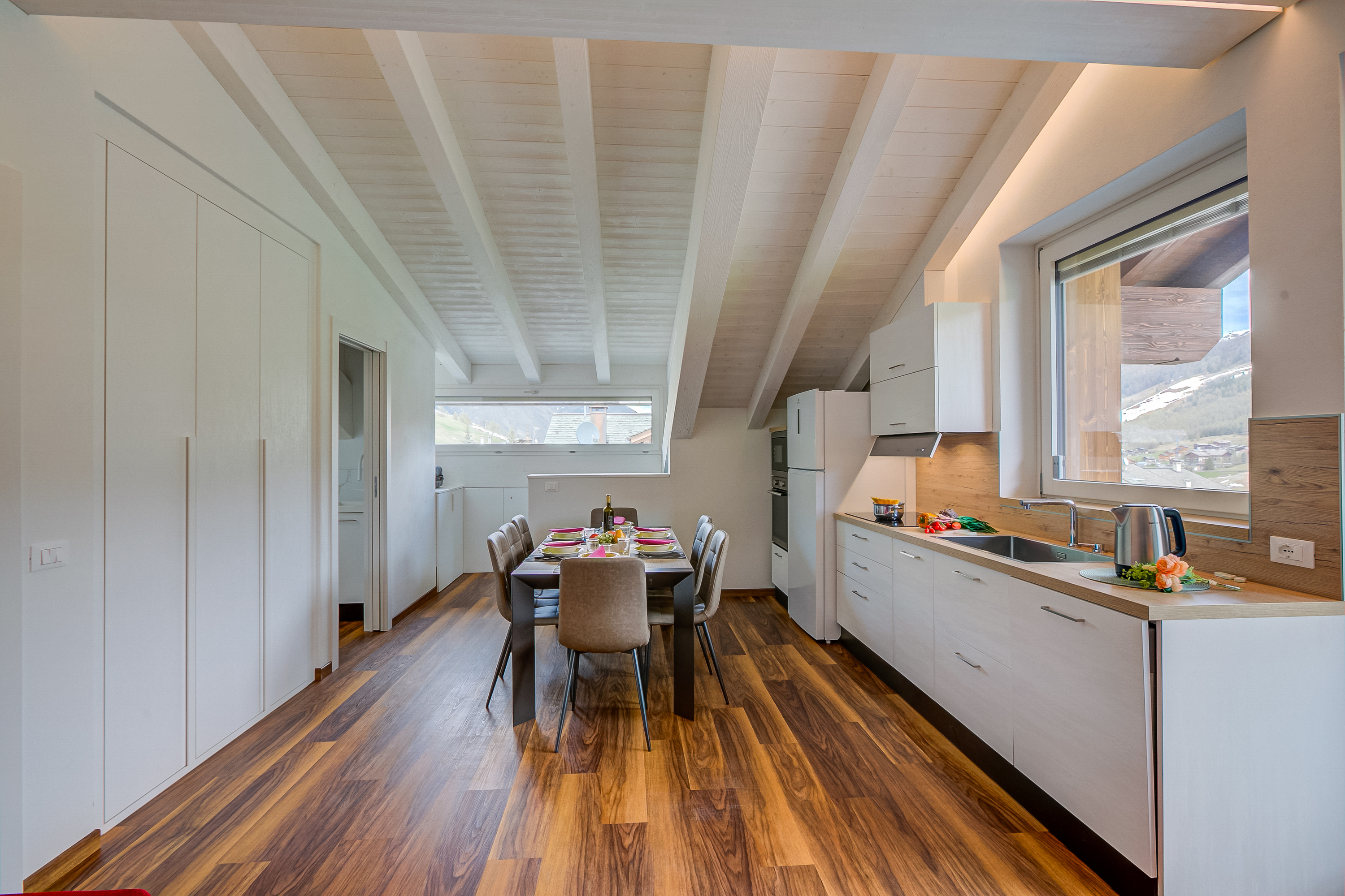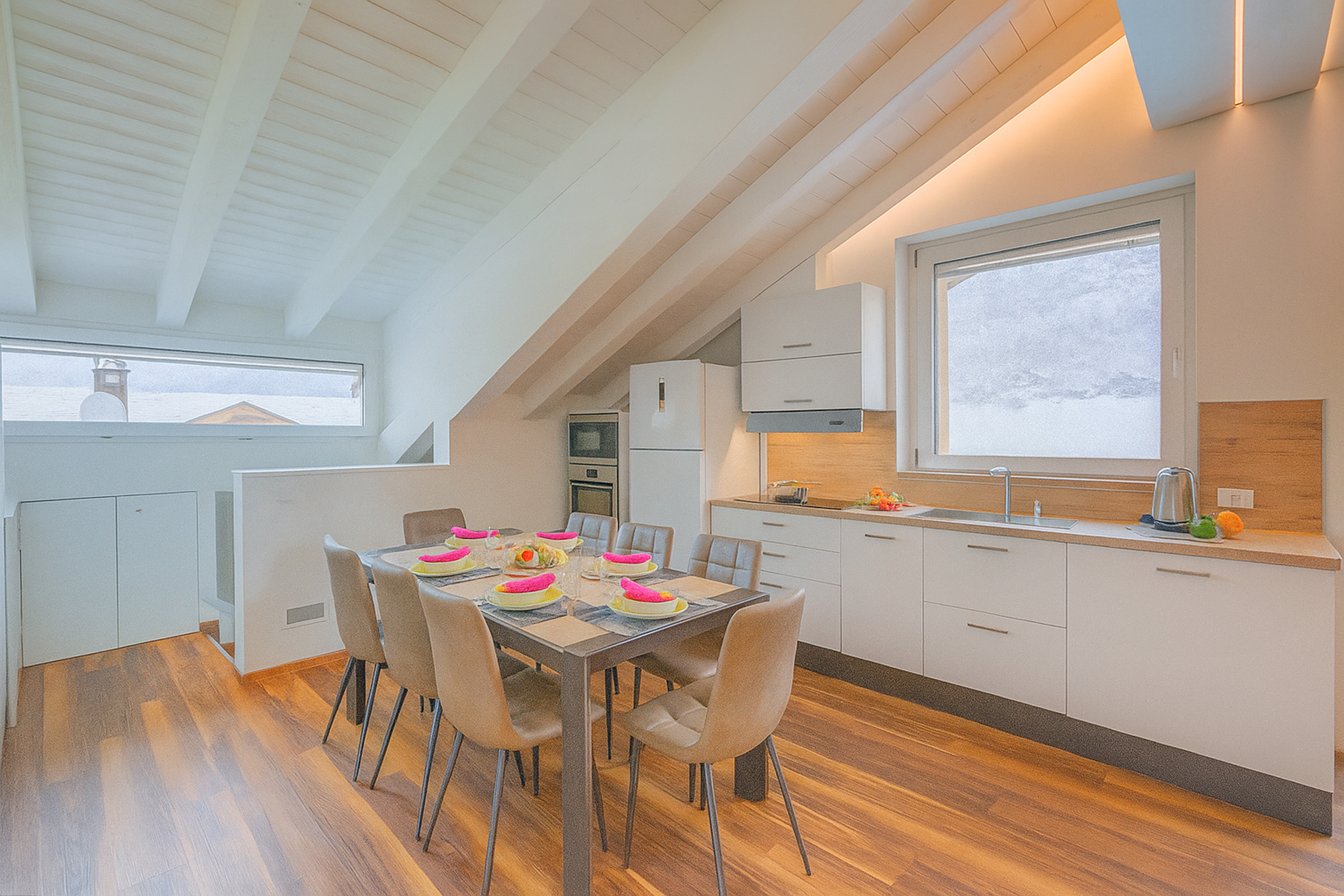 Dit rustige appartement op de bovenste verdieping biedt een prachtig uitzicht op de bergen. De open woon- en eetruimte heeft houten vloeren en grote ramen, met een deur die leidt naar een privébalkon waar gasten kunnen ontspannen. De zithoek beschikt over een stijlvol sofa en een flatscreen-tv, terwijl de eettafel voor zes personen handig is gelegen naast de volledig uitgeruste keuken, die is voorzien van een inductiekookplaat, vaatwasser, magnetron, koelkast/vriezer en koffiezetapparaat.