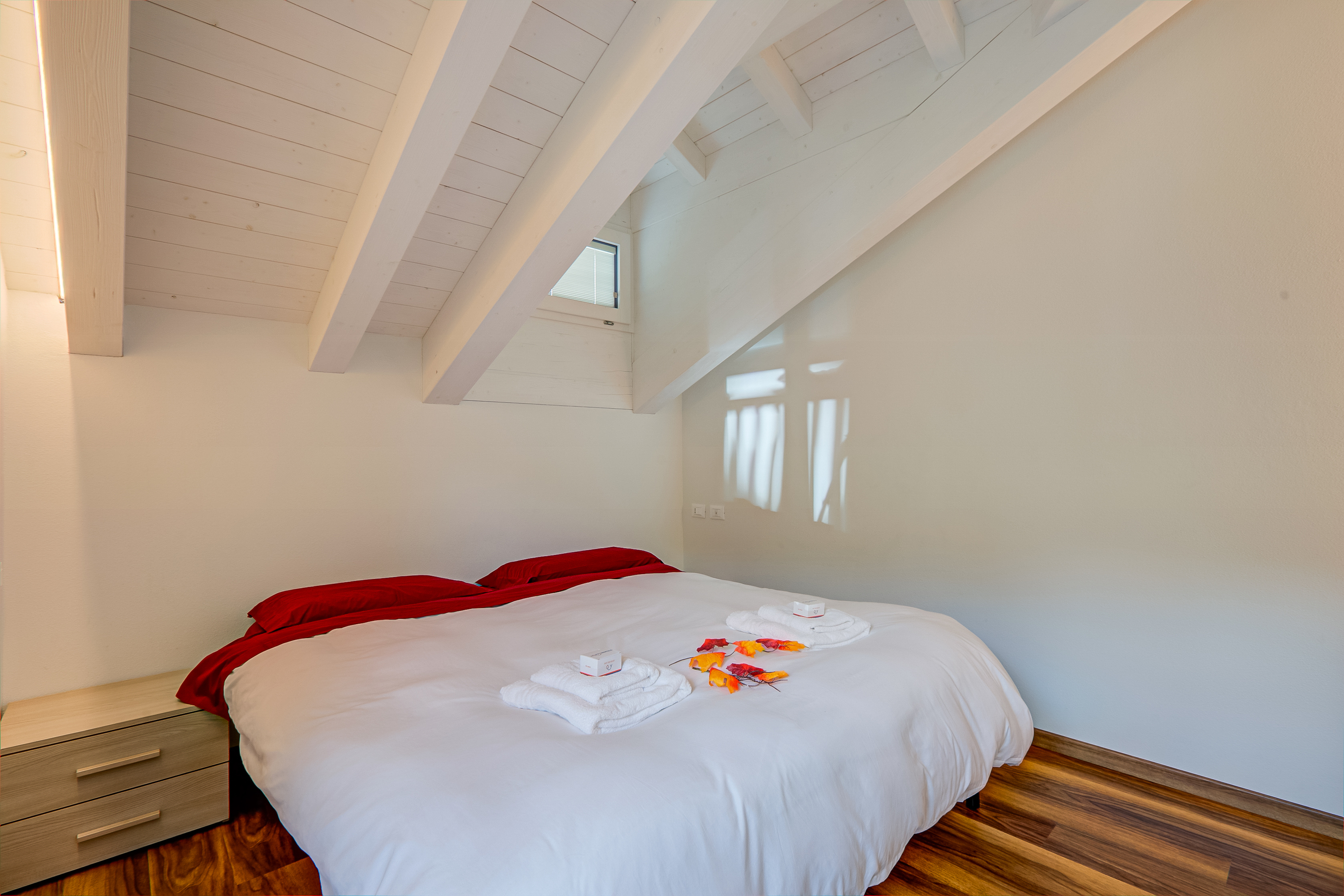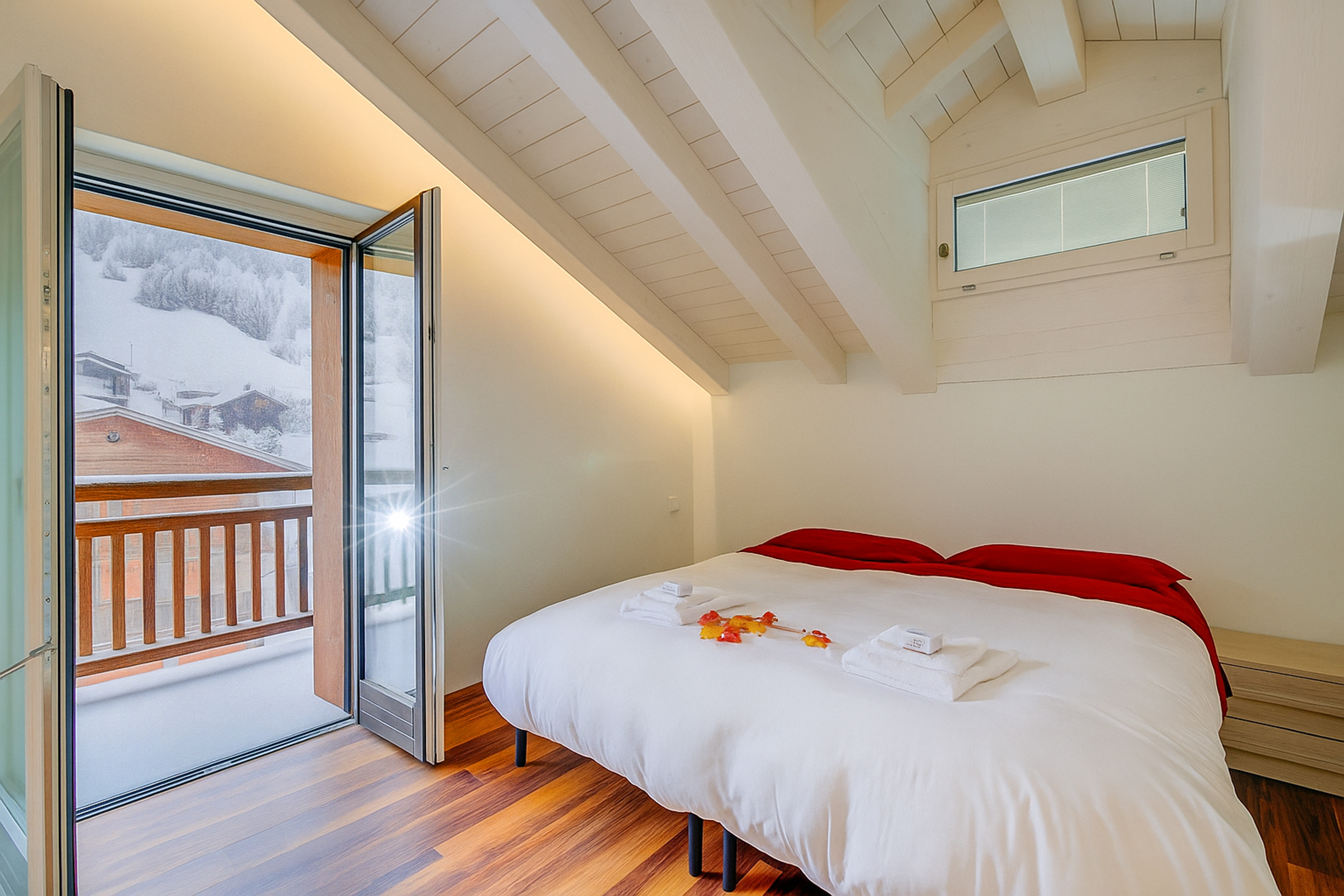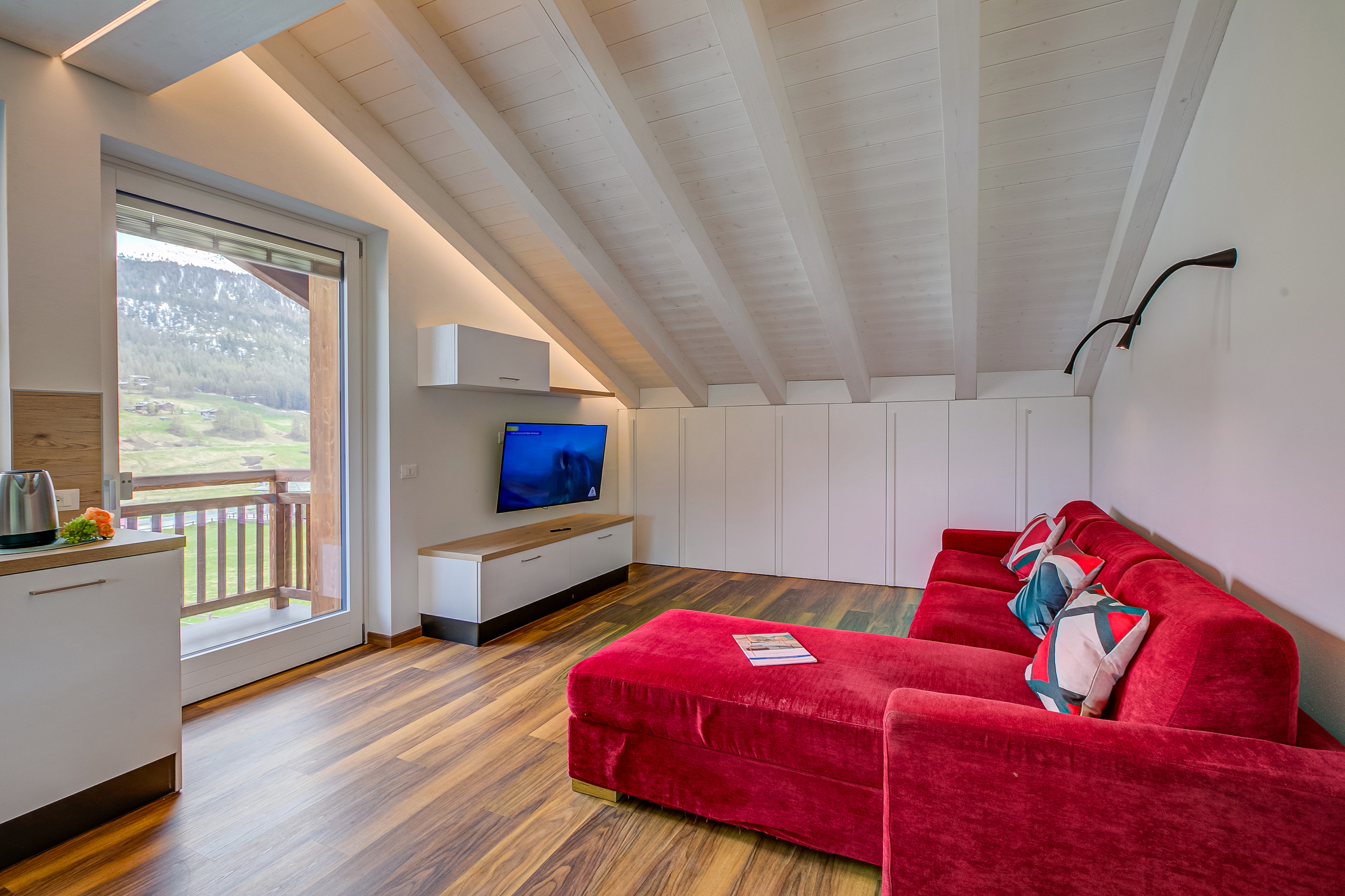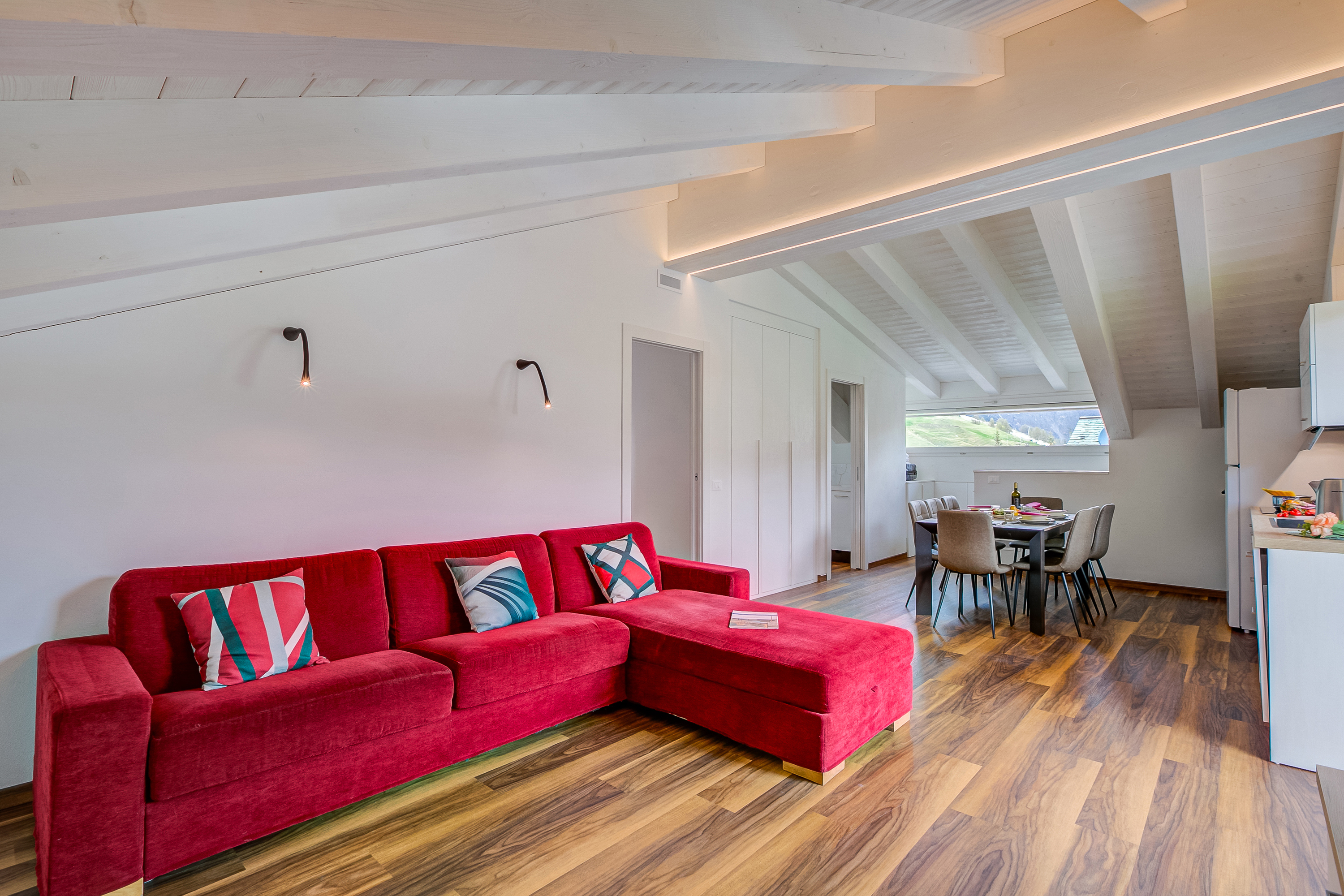 Dit rustige appartement op de bovenste verdieping biedt een prachtig uitzicht op de bergen. De open woon- en eetruimte heeft houten vloeren en grote ramen, met een deur die leidt naar een privébalkon waar gasten kunnen ontspannen. De zithoek beschikt over een stijlvol sofa en een flatscreen-tv, terwijl de eettafel voor zes personen handig is gelegen naast de volledig uitgeruste keuken, die is voorzien van een inductiekookplaat, vaatwasser, magnetron, koelkast/vriezer en koffiezetapparaat.