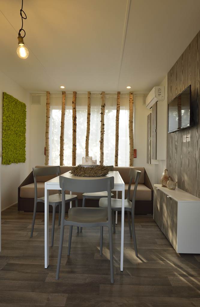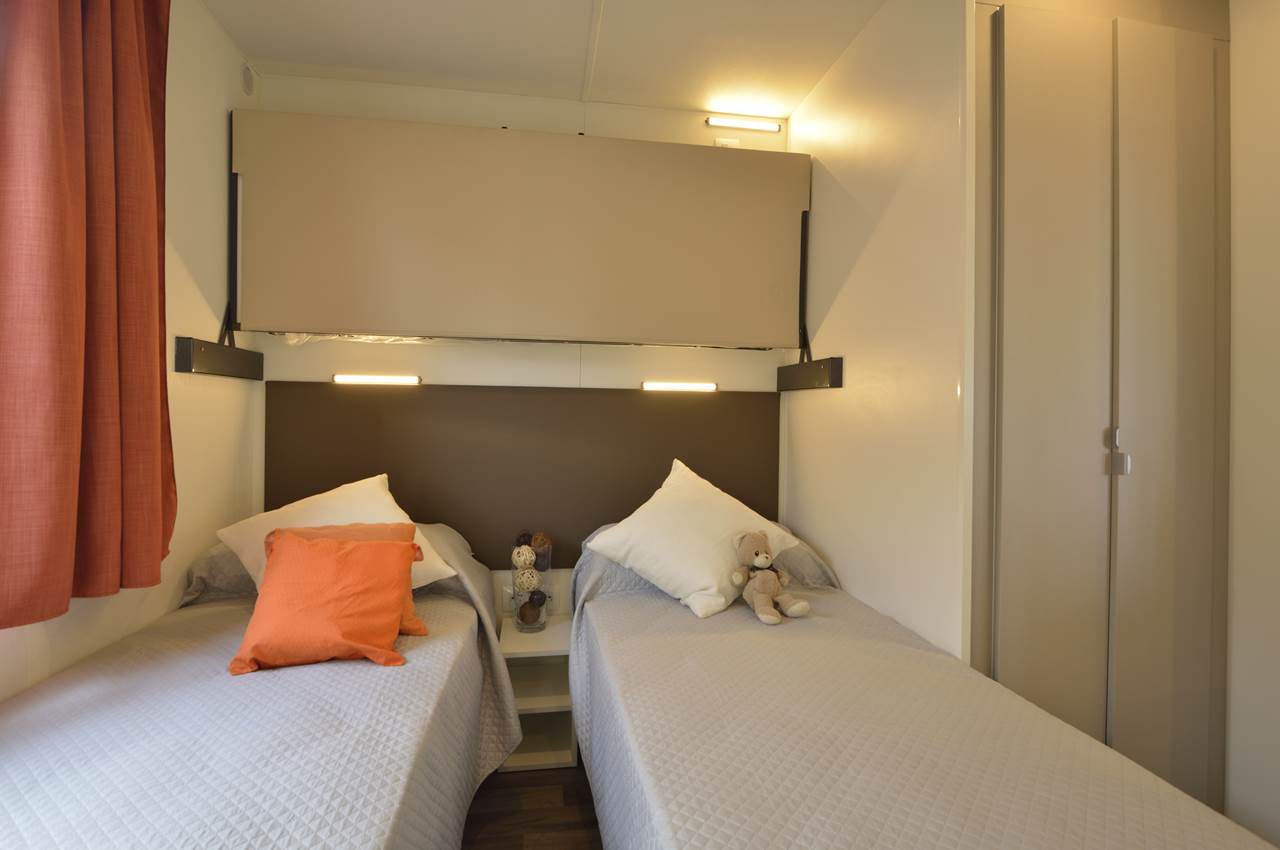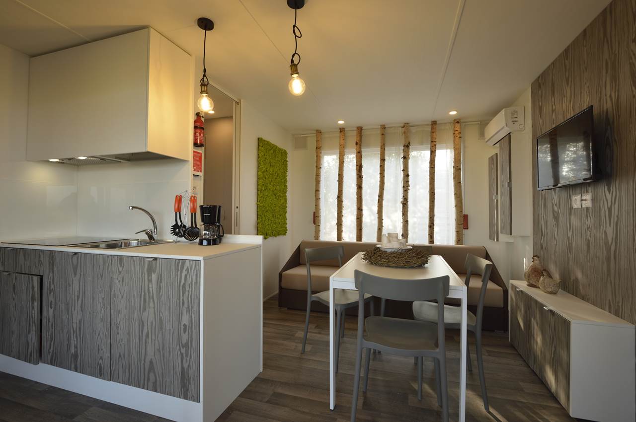 De stacaravan bestaat uit een woonkamer met airconditioning, een kitchenette met inductiekookplaat en vaatwasser, een sofa, één tweepersoonsslaapkamer, één slaapkamer met drie eenpersoonsbedden (waarvan één opklapbed) en twee badkamers, elk met toilet, douche en wastafel.