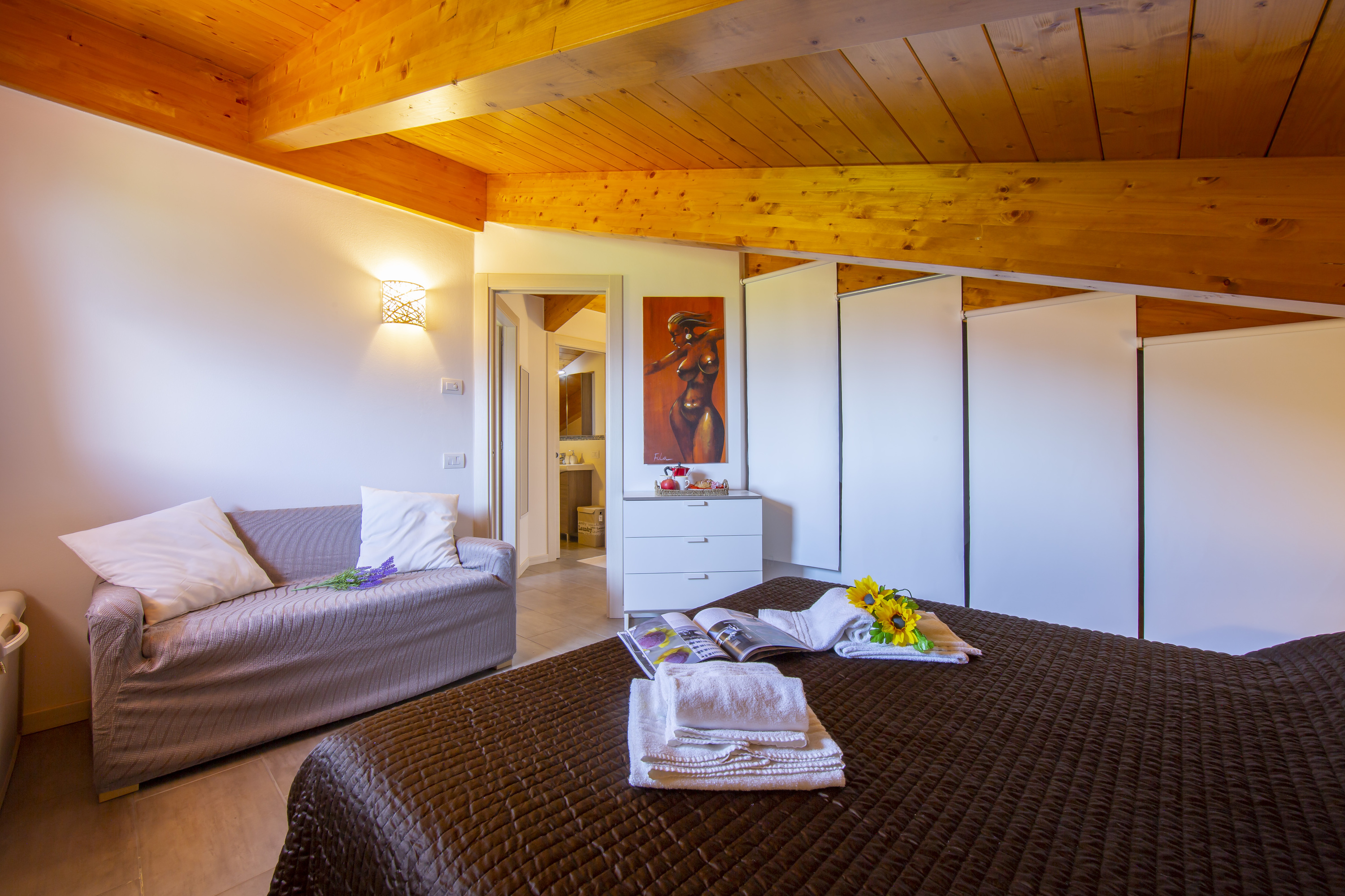 Een ruime loft-stijl slaapkamer met een tweepersoonsbed en een kast