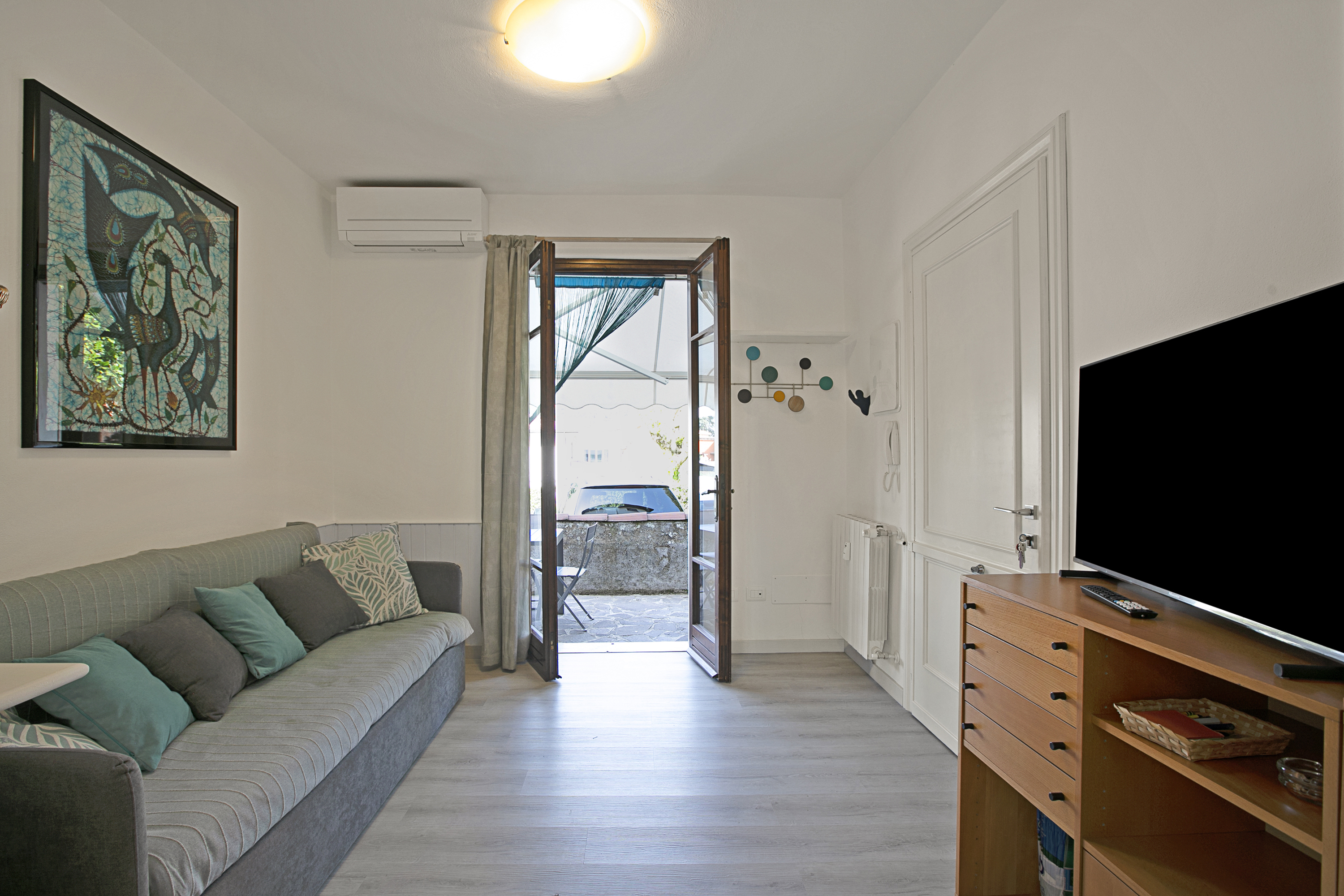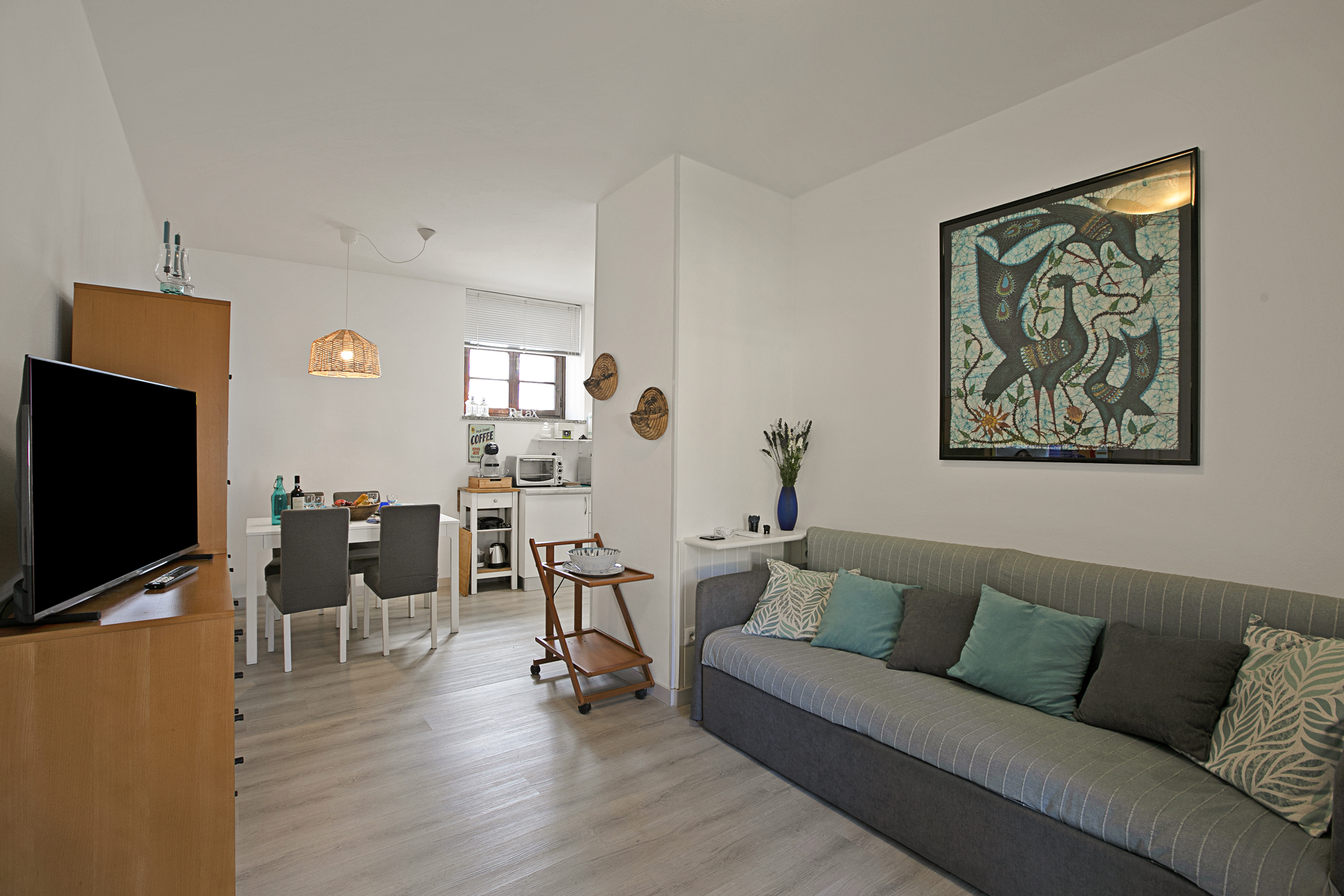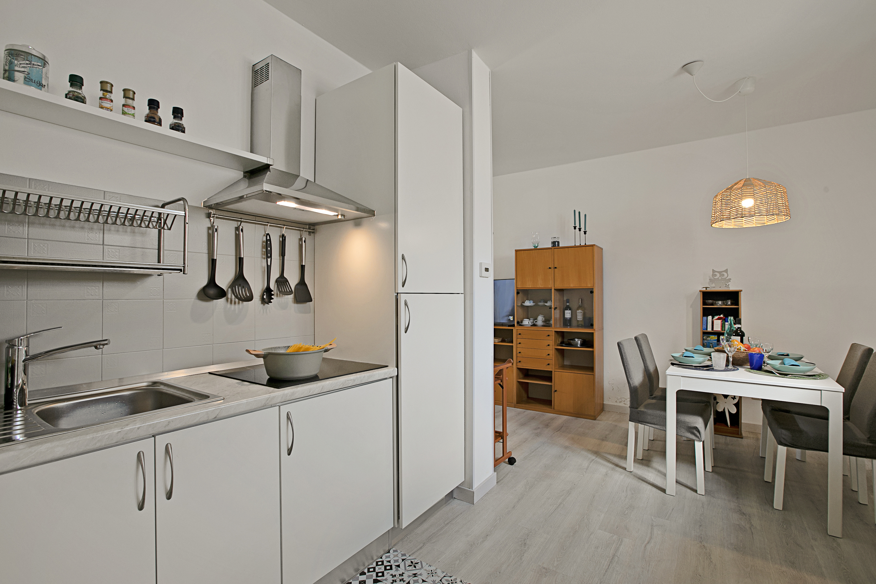 Op de begane grond, met een schaduwrijk terras dat toegankelijk is vanuit de zithoek, bestaat het onlangs gerenoveerde appartement uit een L-vormige woonkamer met een bank, een flatscreen-tv en een eettafel. De open keuken is uitgerust met een inductiekookplaat, oven, magnetron, koelkast/vriezer en een koffiezetapparaat.