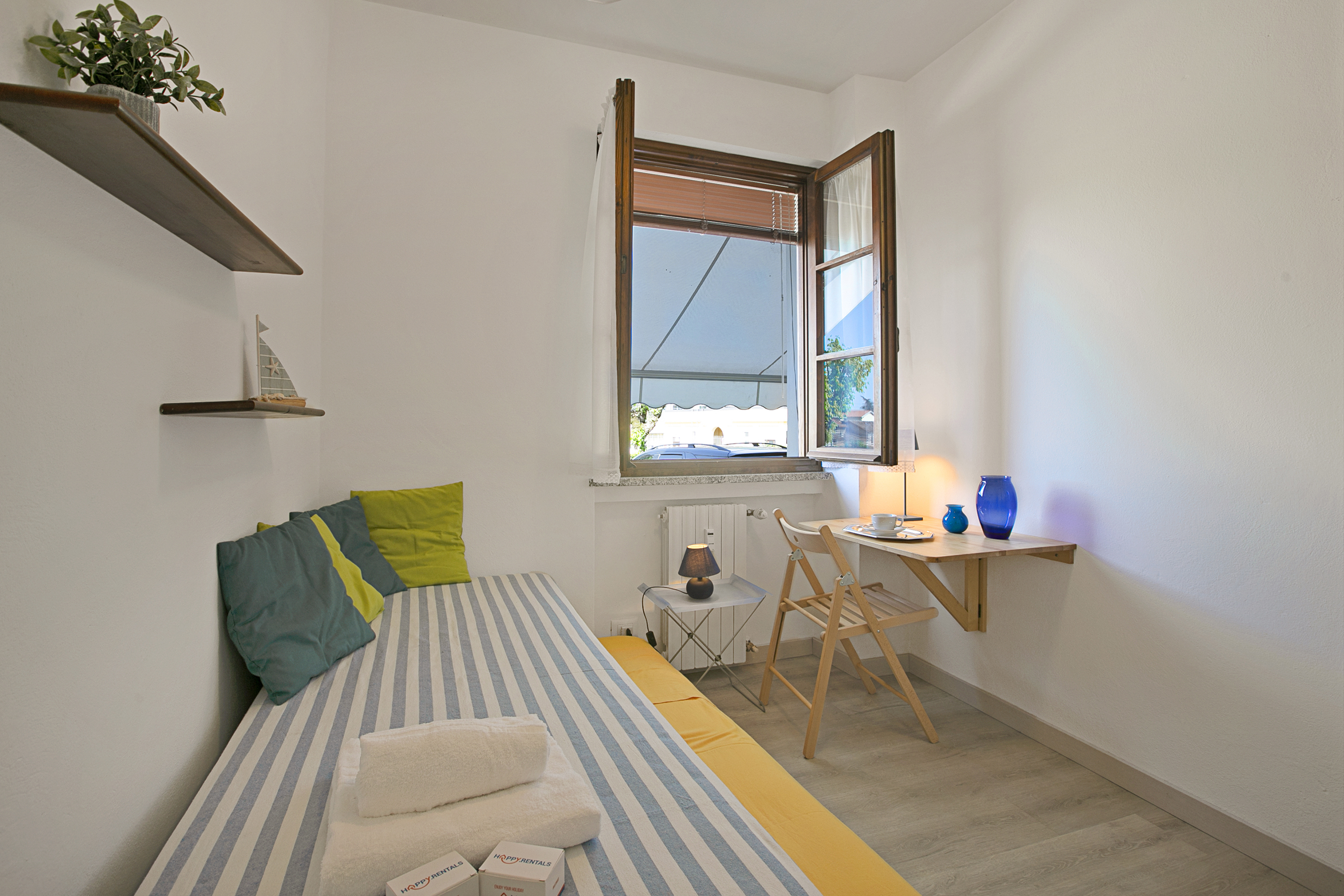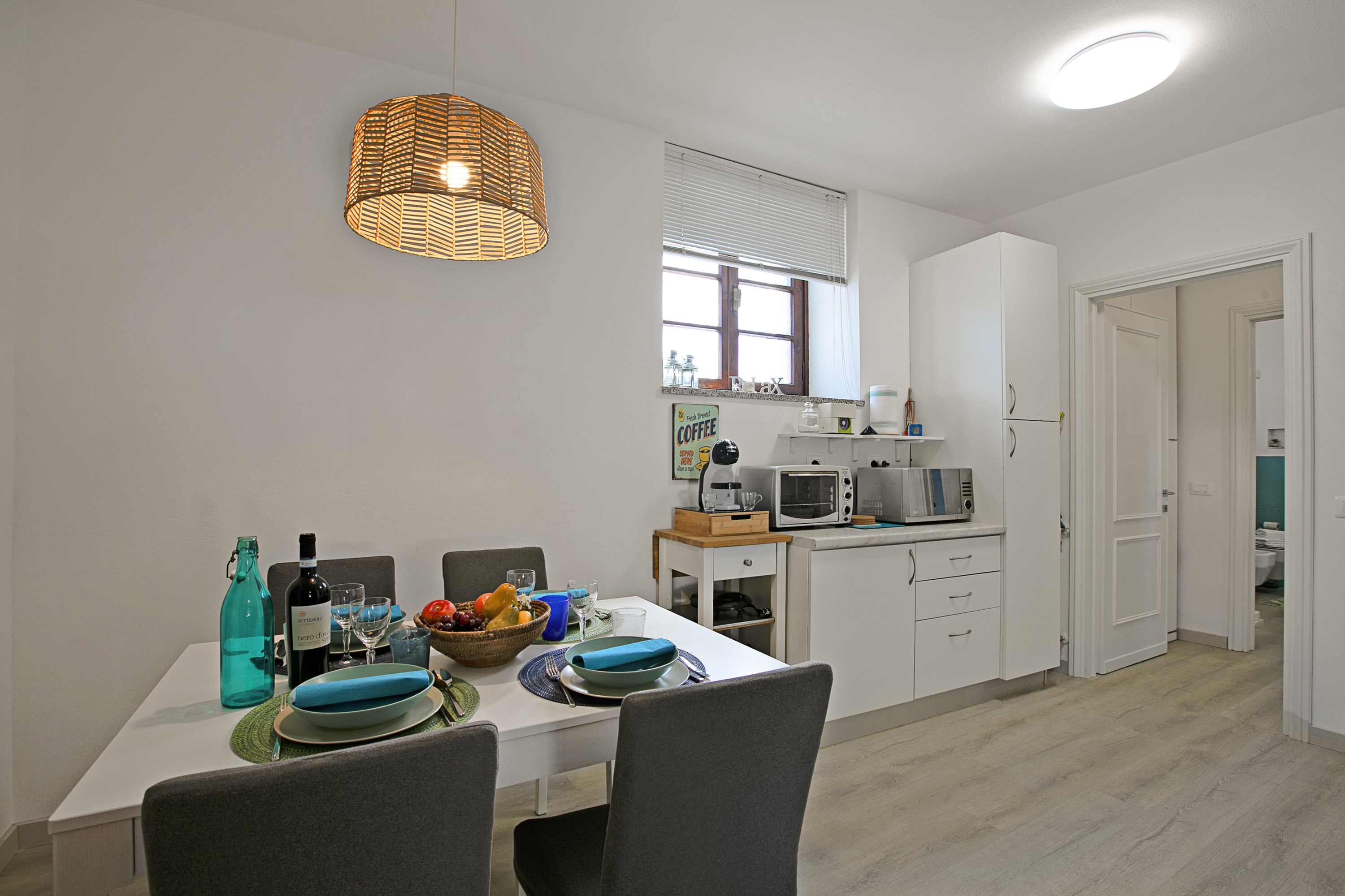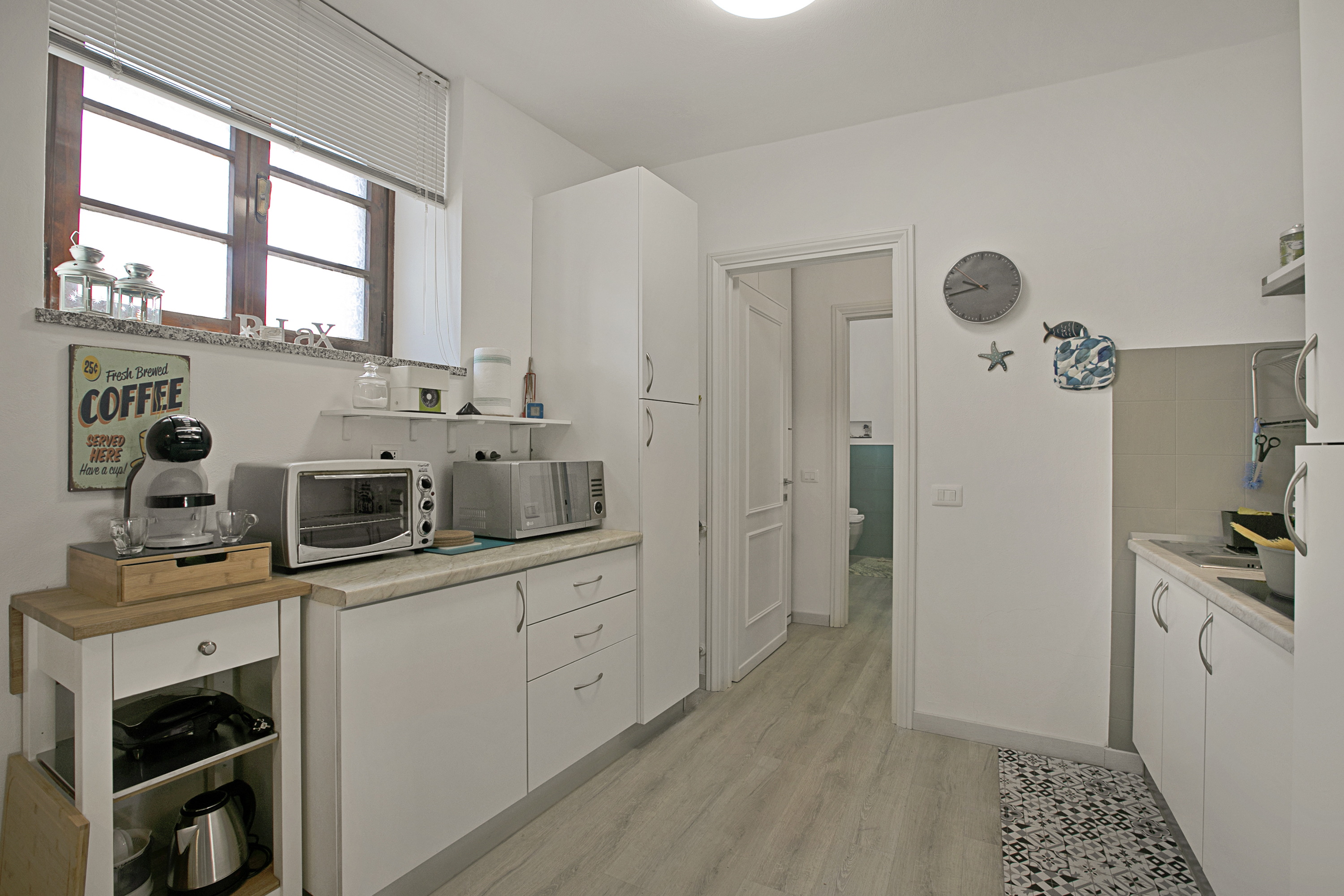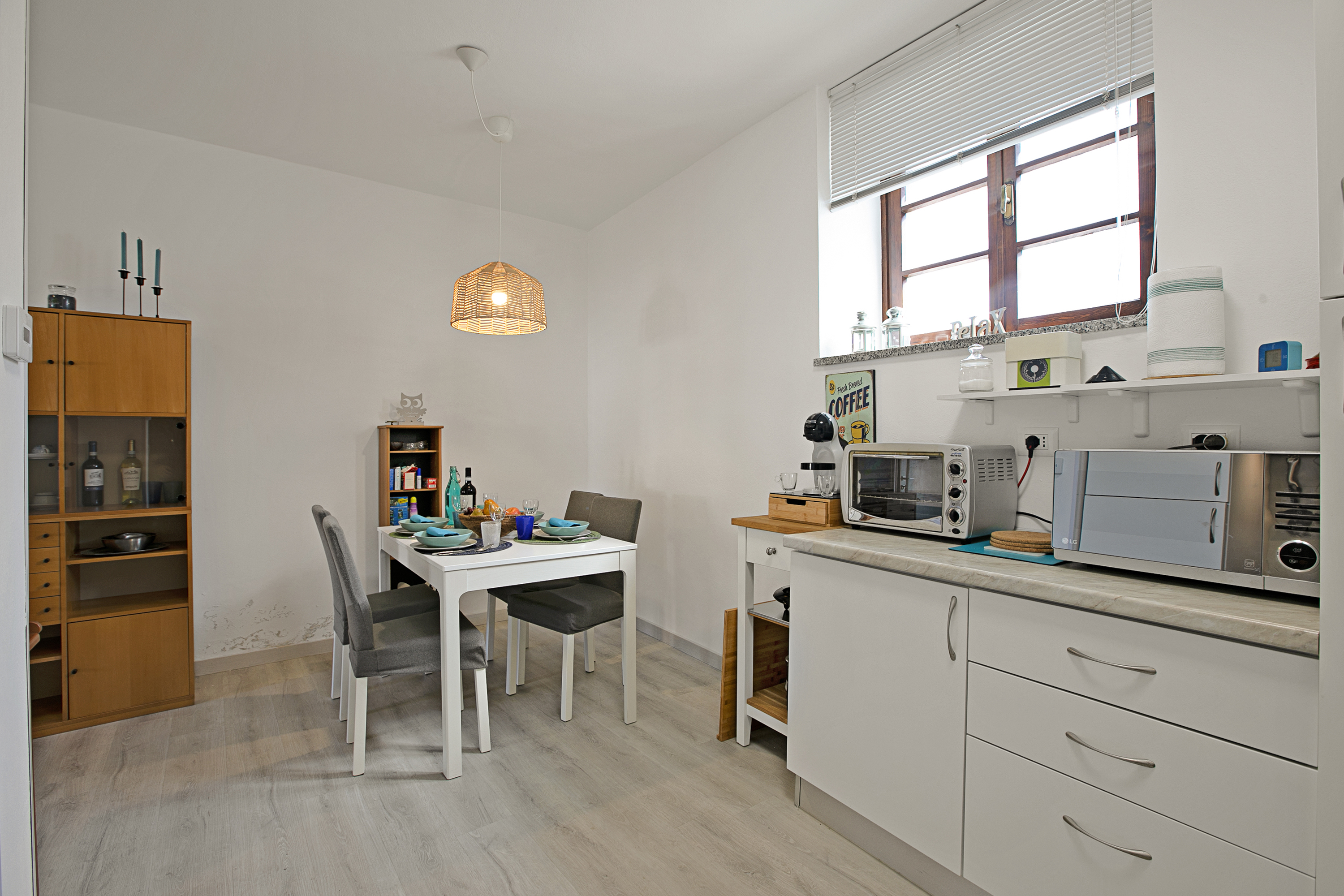 Op de begane grond, met een schaduwrijk terras dat toegankelijk is vanuit de zithoek, bestaat het onlangs gerenoveerde appartement uit een L-vormige woonkamer met een bank, een flatscreen-tv en een eettafel. De open keuken is uitgerust met een inductiekookplaat, oven, magnetron, koelkast/vriezer en een koffiezetapparaat.