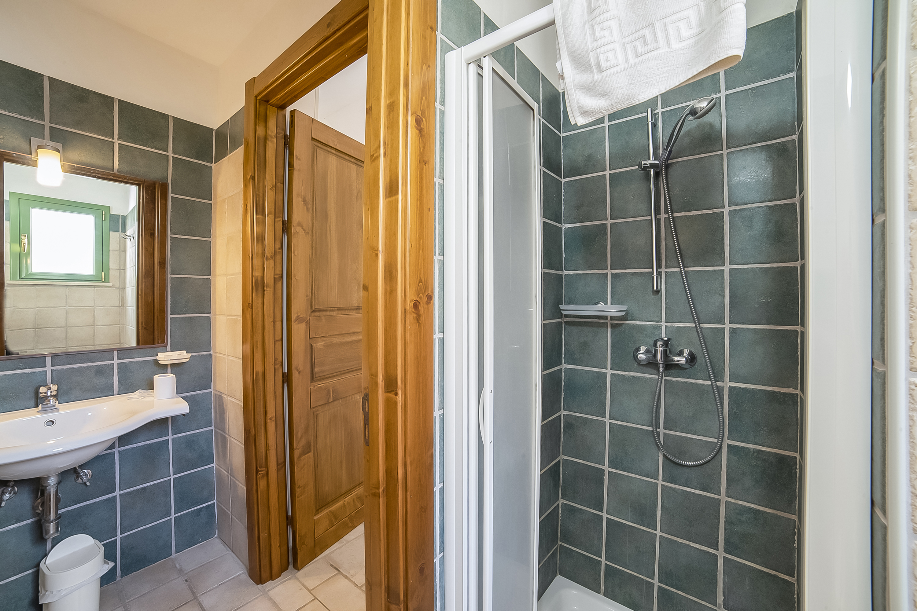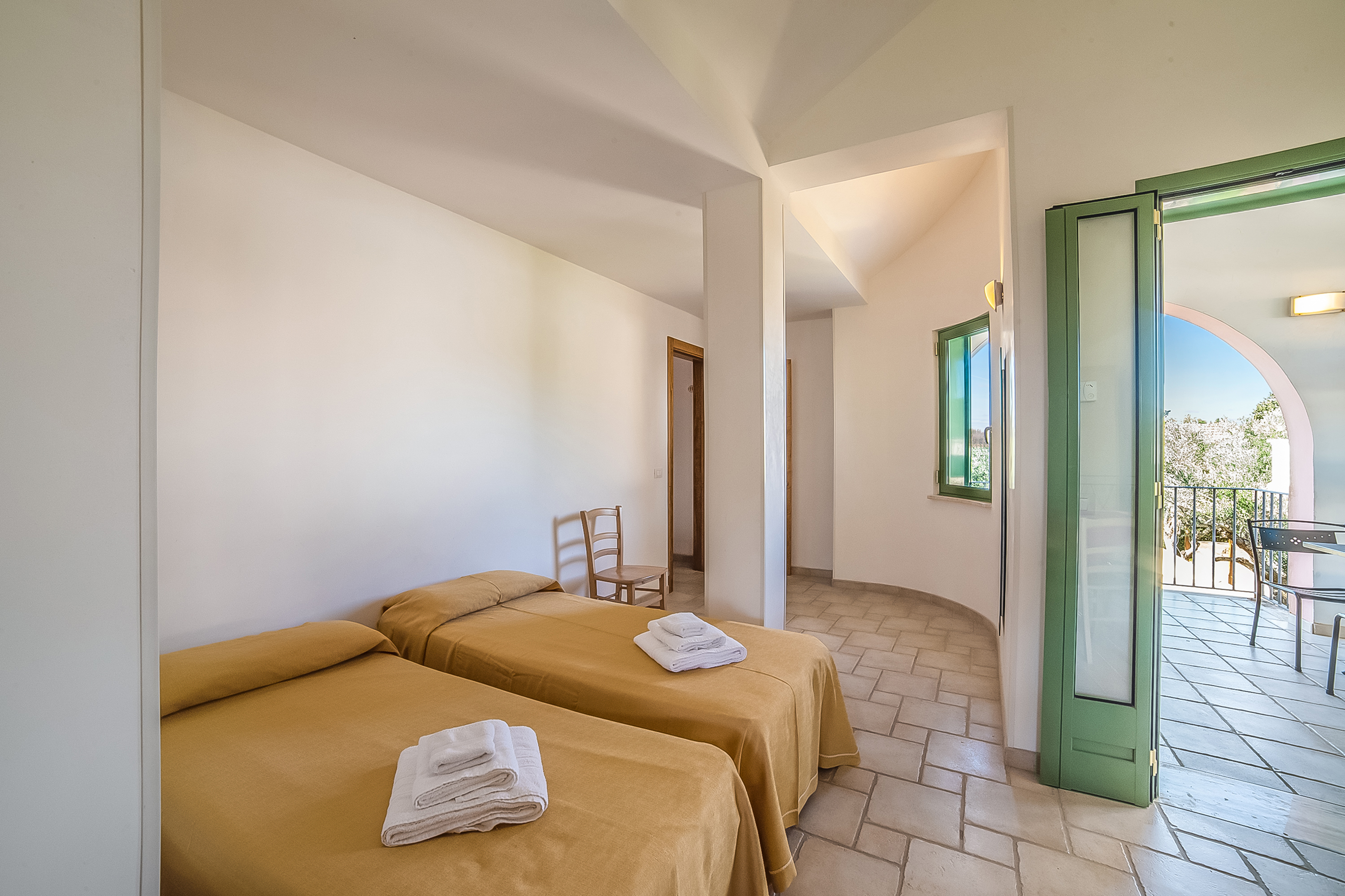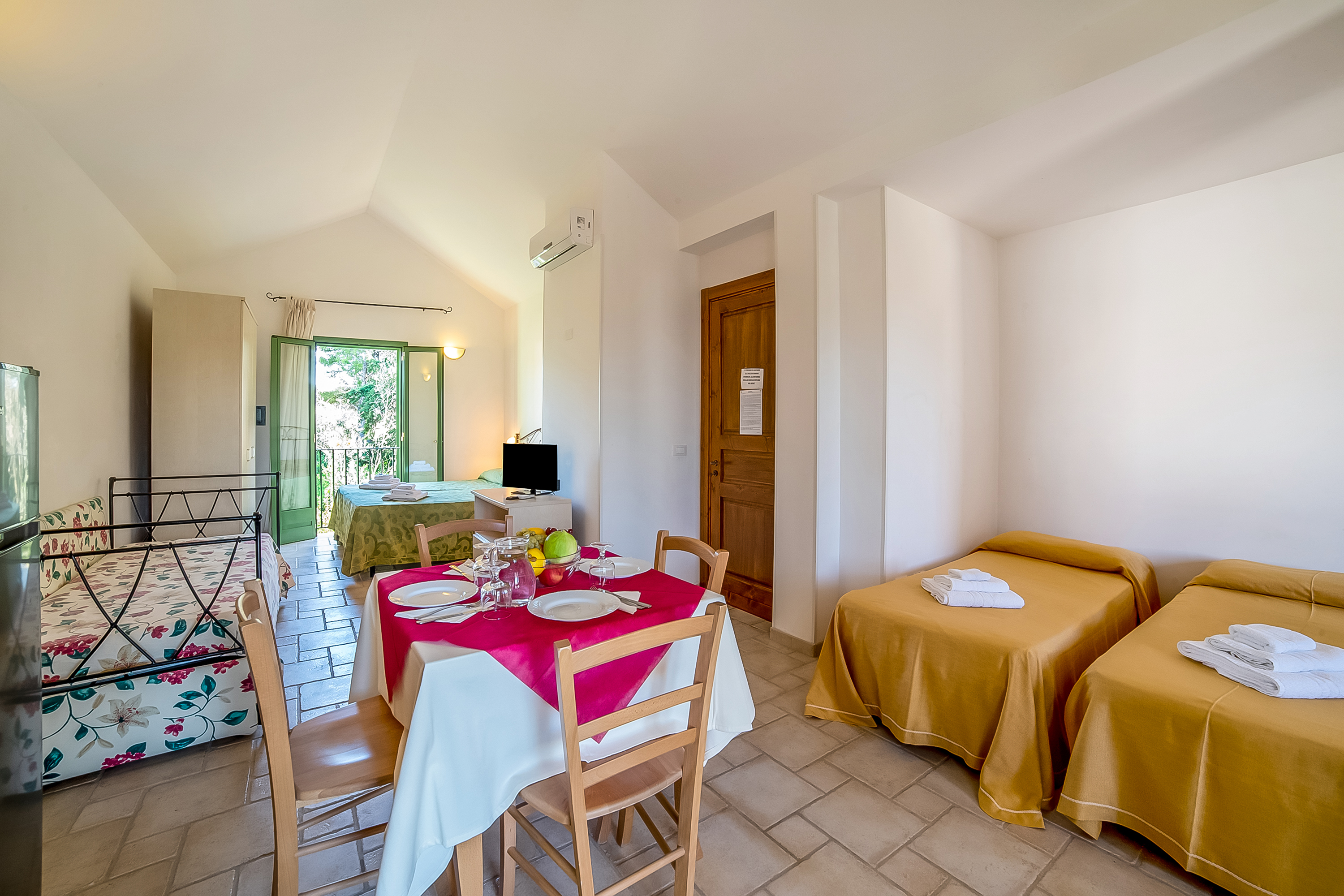 Dit appartement op de eerste verdieping beschikt over een woonkamer met een tweepersoonsbed, drie eenpersoonsbedden, airconditioning en een kledingkast. De badkamer is uitgerust met een bidet, douche en toilet.