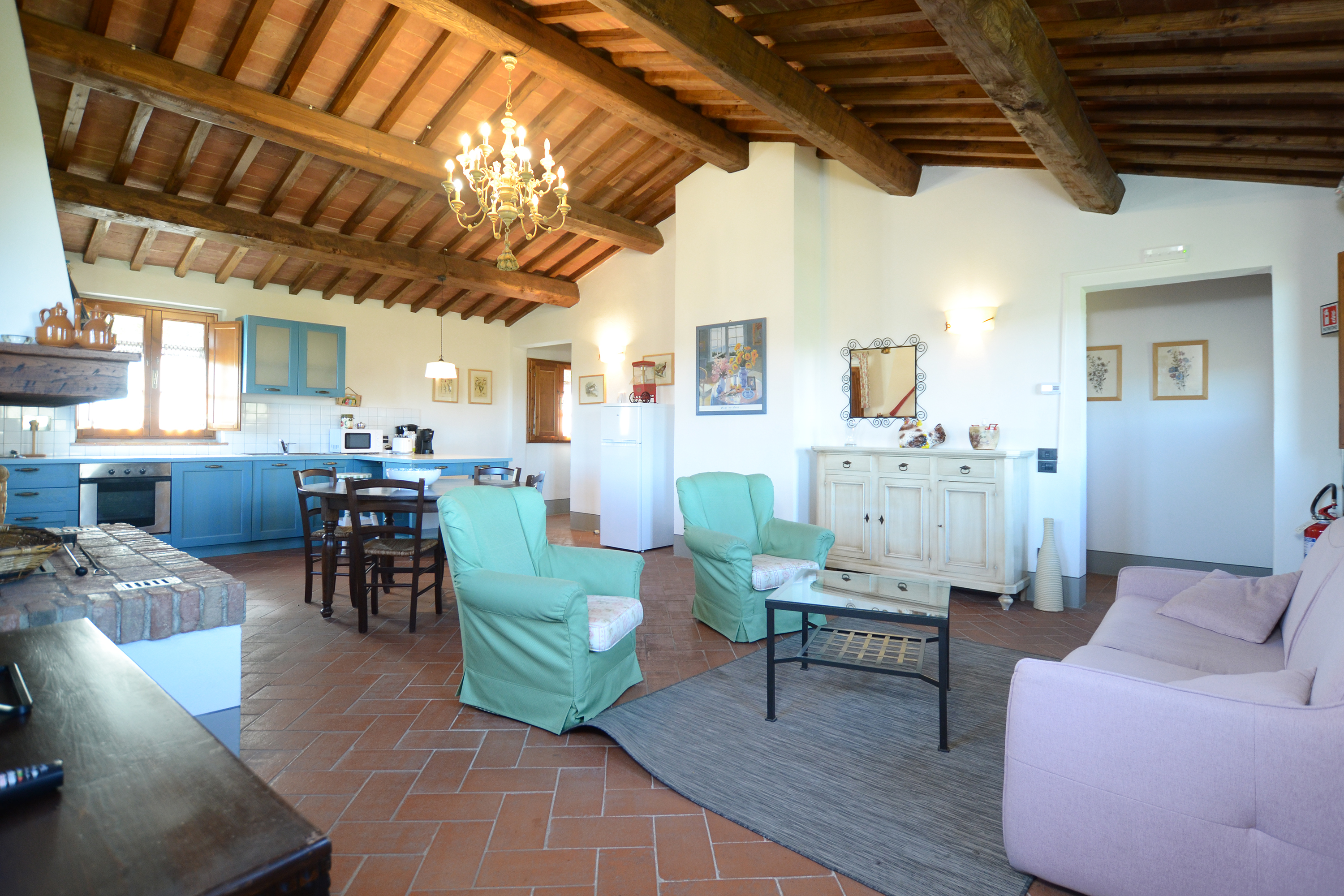 De open leefruimte heeft hoge balkenplafonds, terracotta vloertegels en een grote traditionele open haard die een warme en uitnodigende sfeer creëert. De ruime lounge heeft een open haard, een bank en twee comfortabele fauteuils. Een antieke eettafel voor zes personen staat naast de charmante keuken, die smaakvol is ingericht met geschilderde houten kasten en veel werkruimte. De keuken is volledig uitgerust met een kookplaat, oven, magnetron, vaatwasser, koelkast en een koffiezetapparaat.
