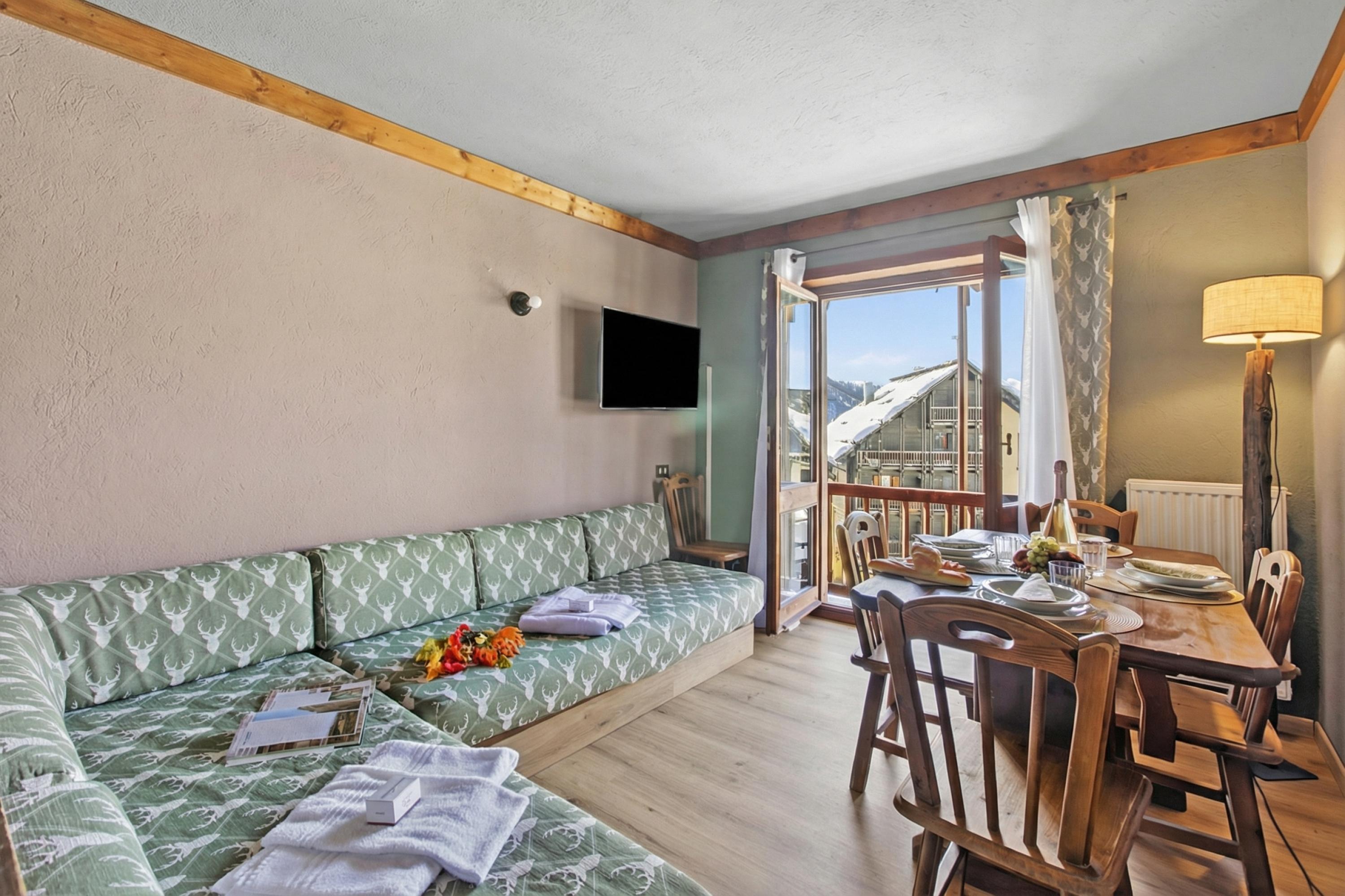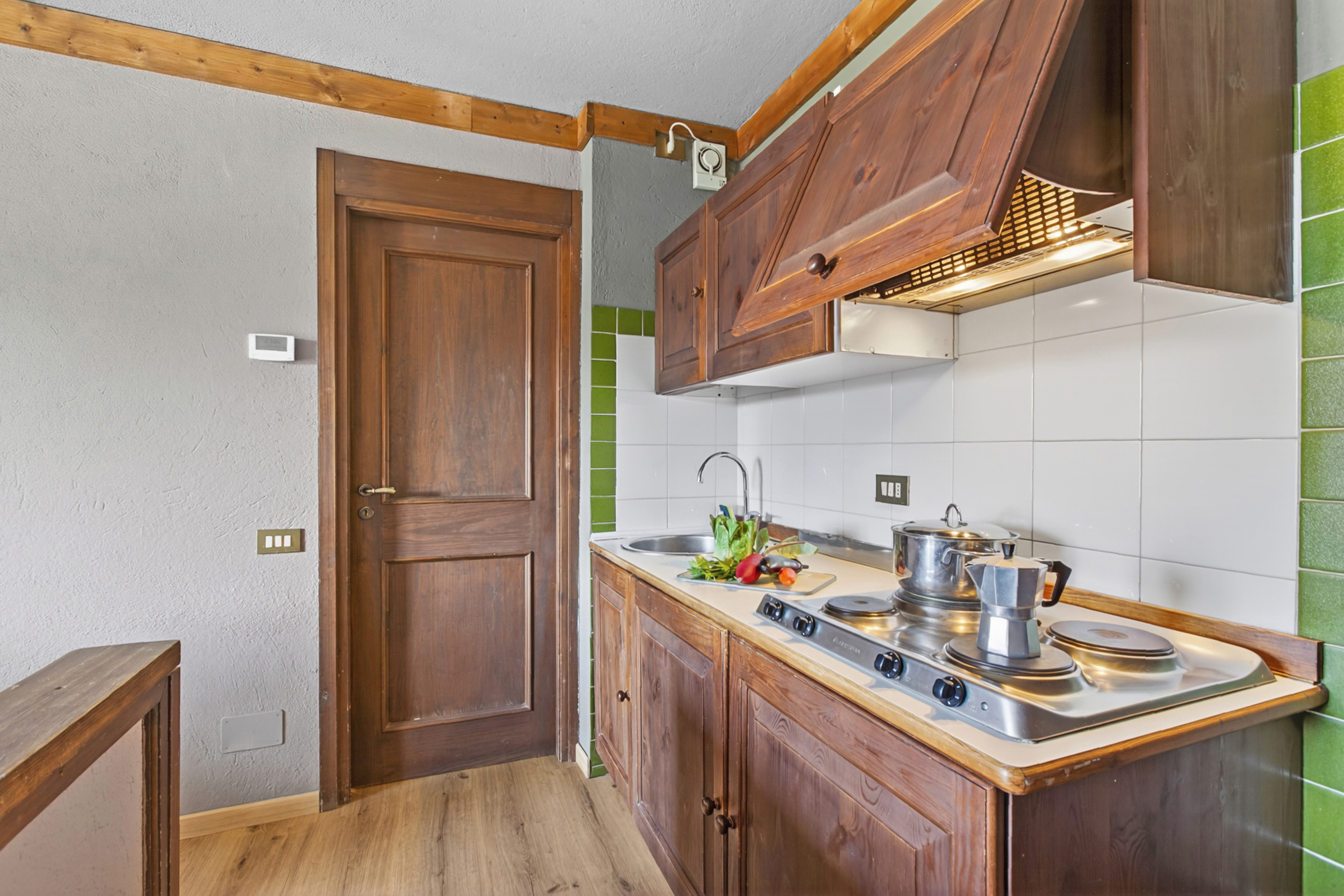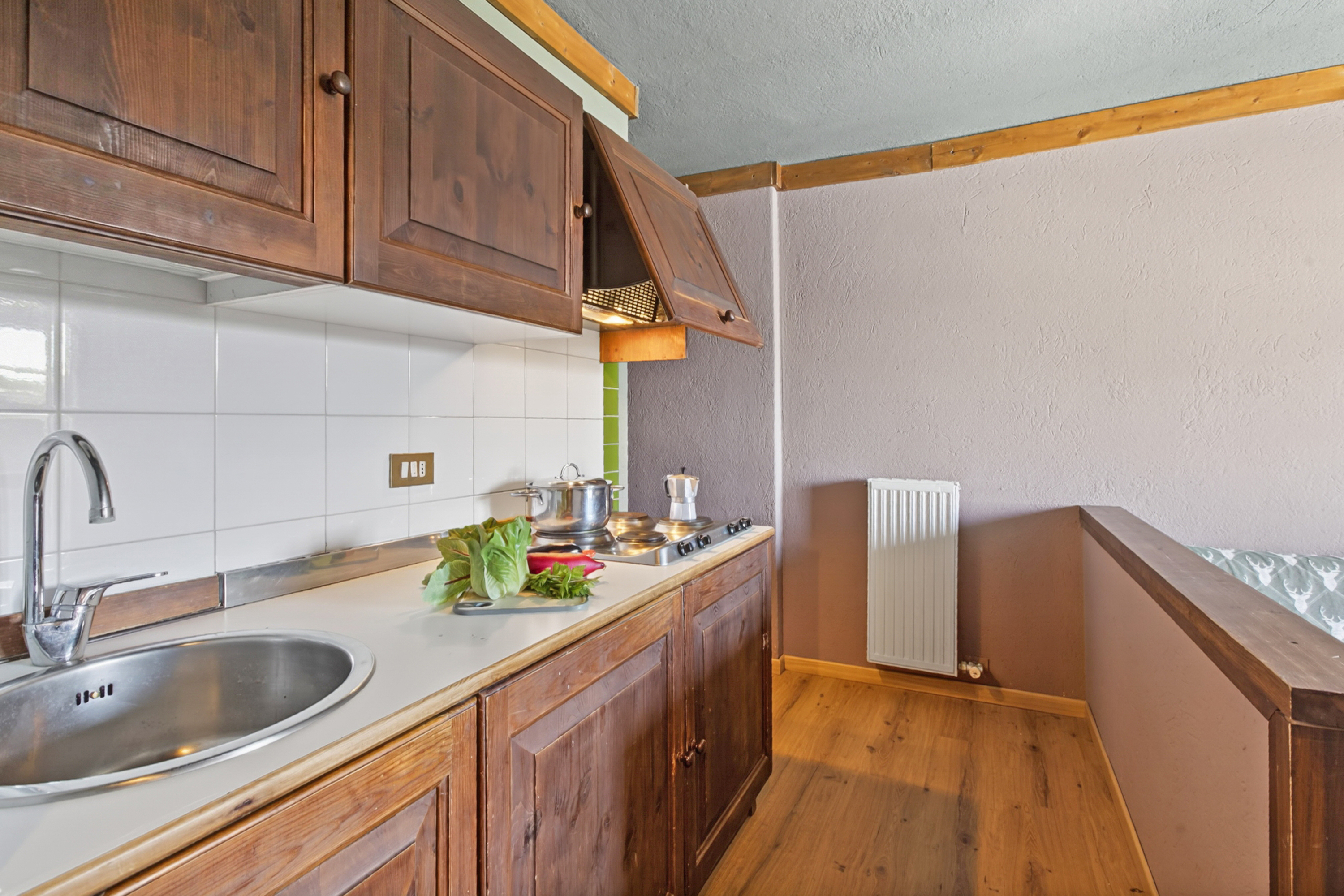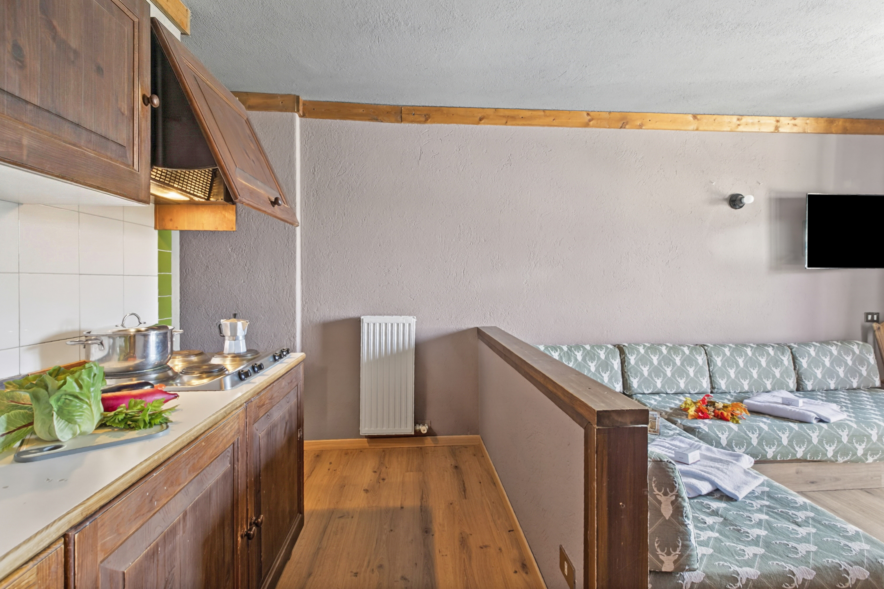 Het appartement op de tweede verdieping (met lift) heeft een lichte woonkamer met een L-vormige bank met een flatscreen digitale tv, een grote houten ladekast en een klein balkon. De houten eettafel staat naast de open keuken en biedt plaats aan 4 personen. De open keuken is uitgerust met een kookplaat, magnetron en koelkast.