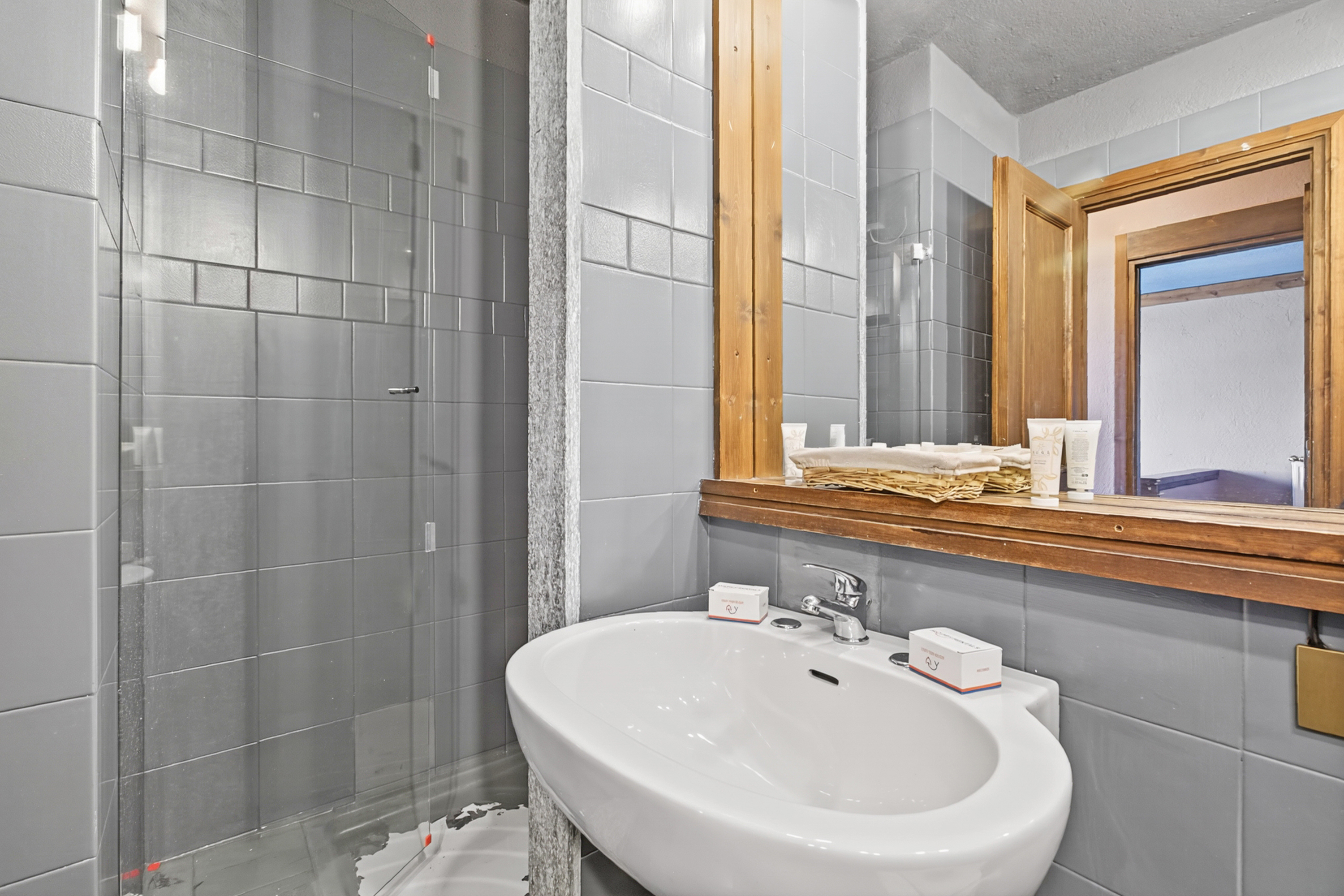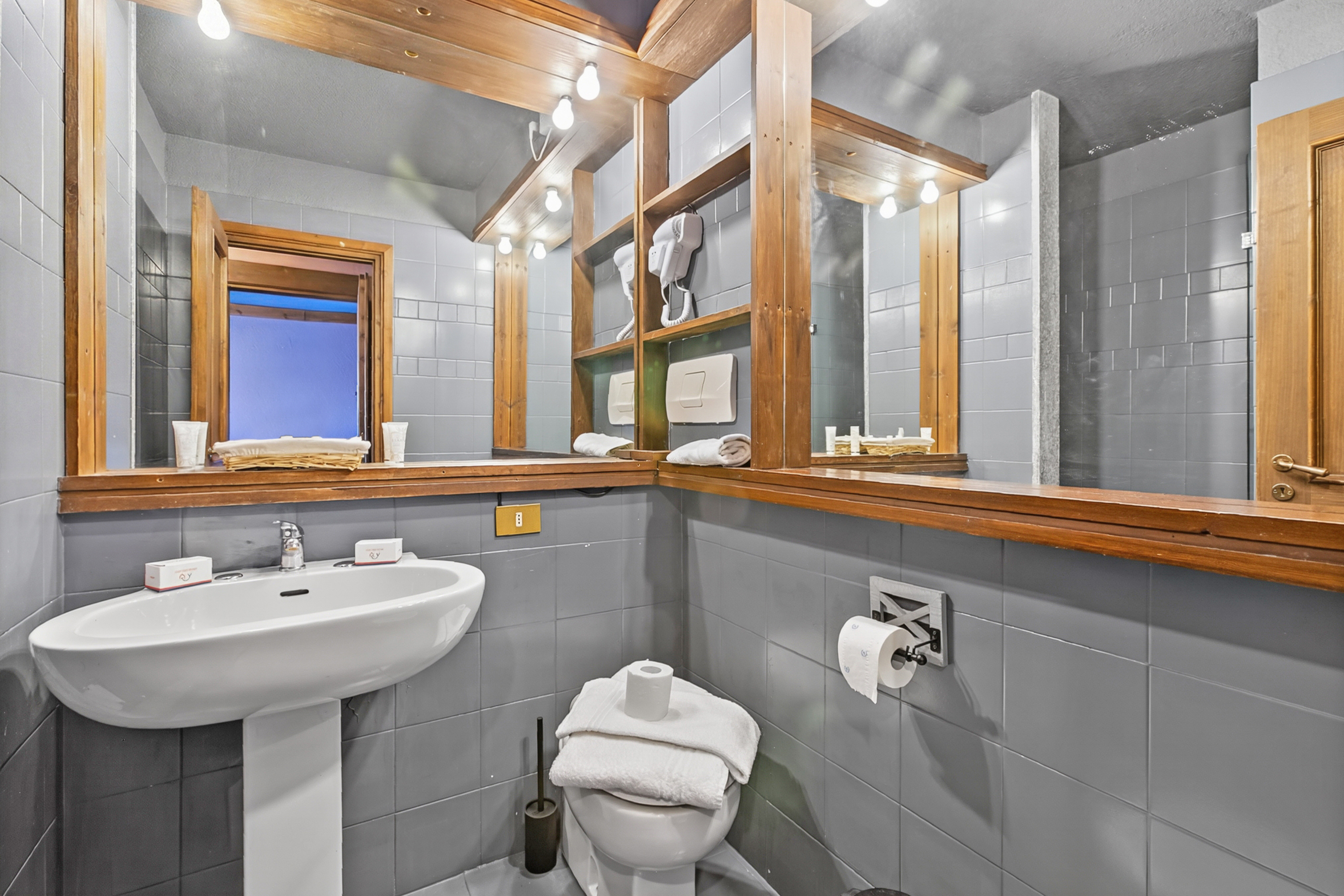 De betegelde badkamer met grote spiegels beschikt over een douche, wastafel, bidet en toilet.
