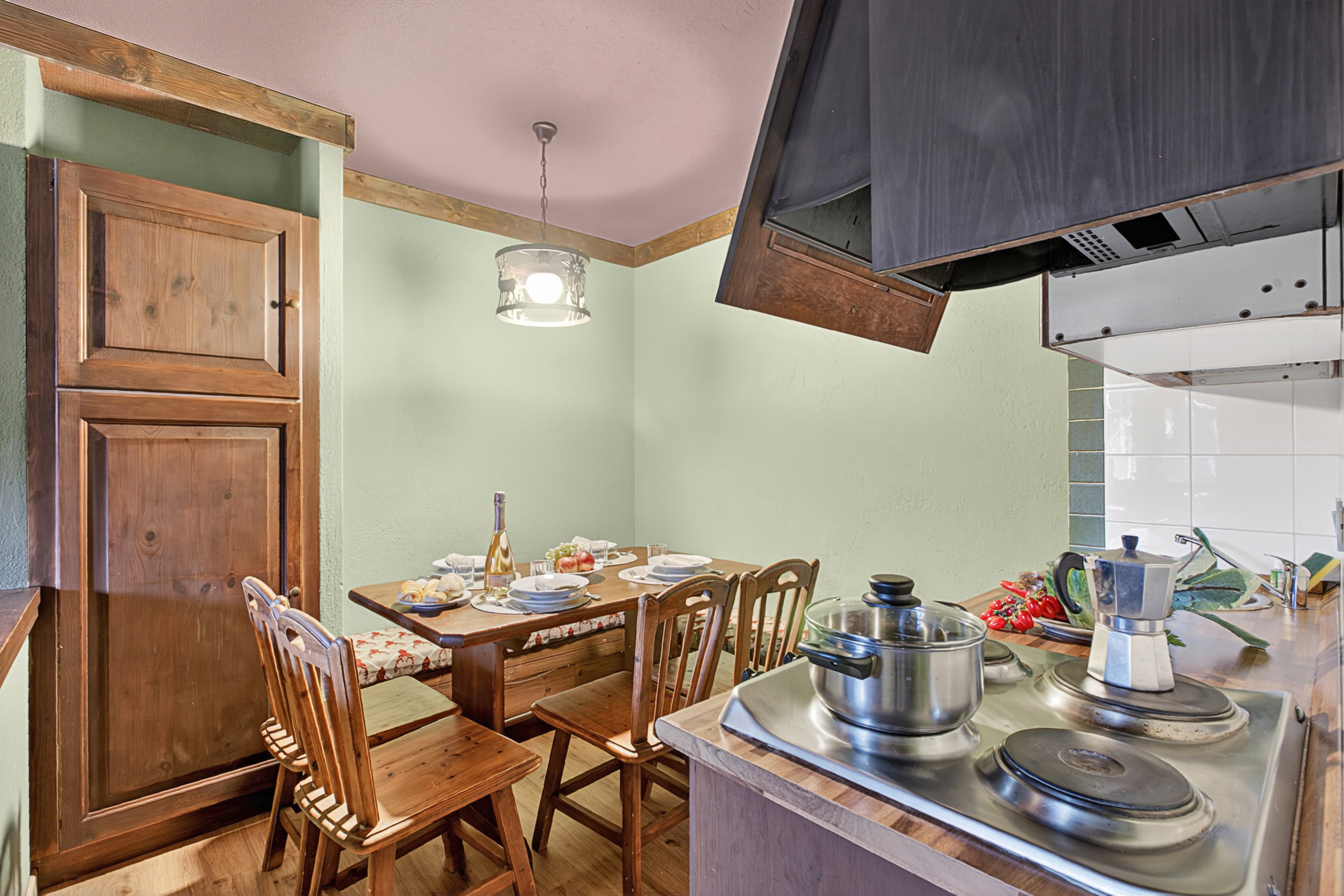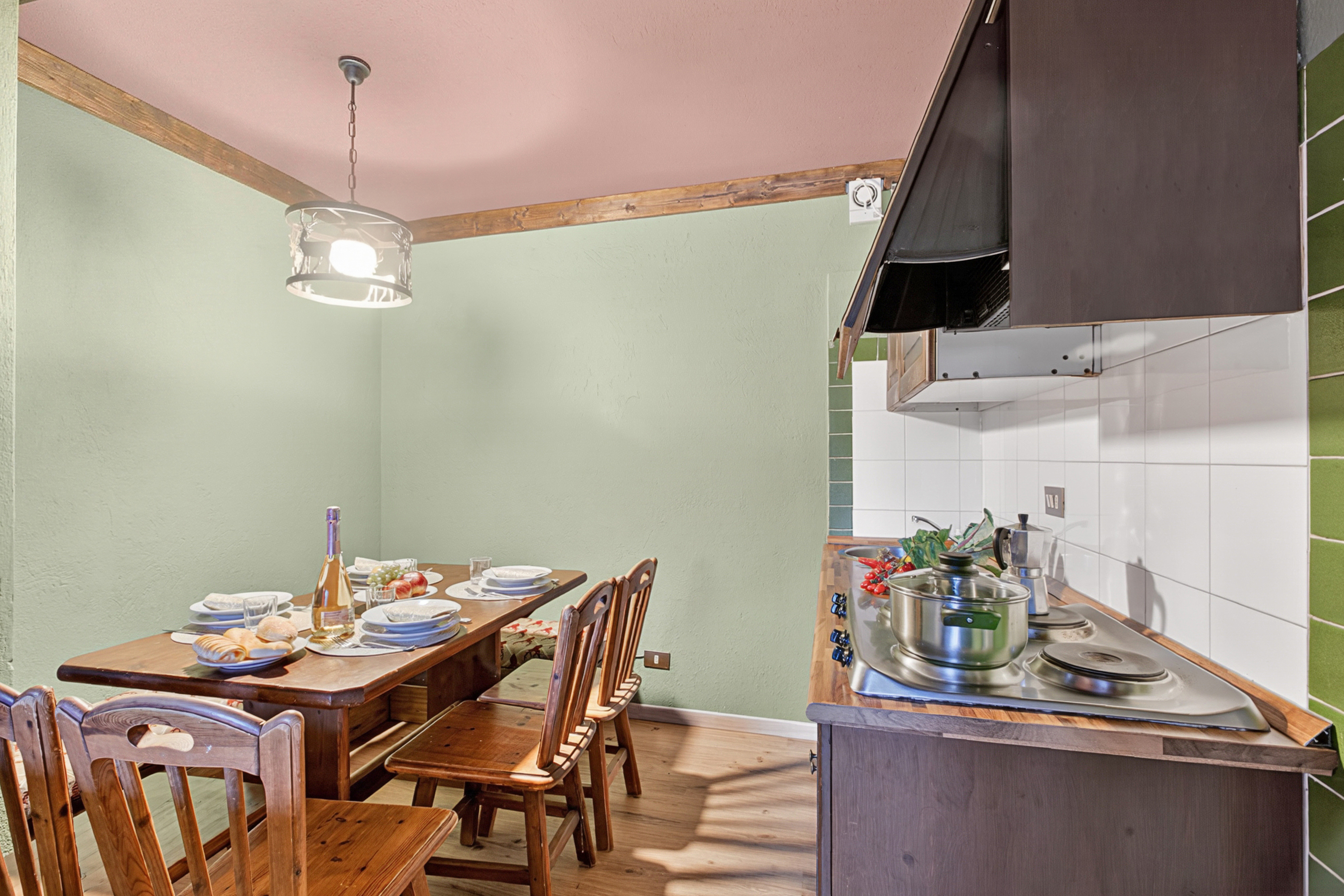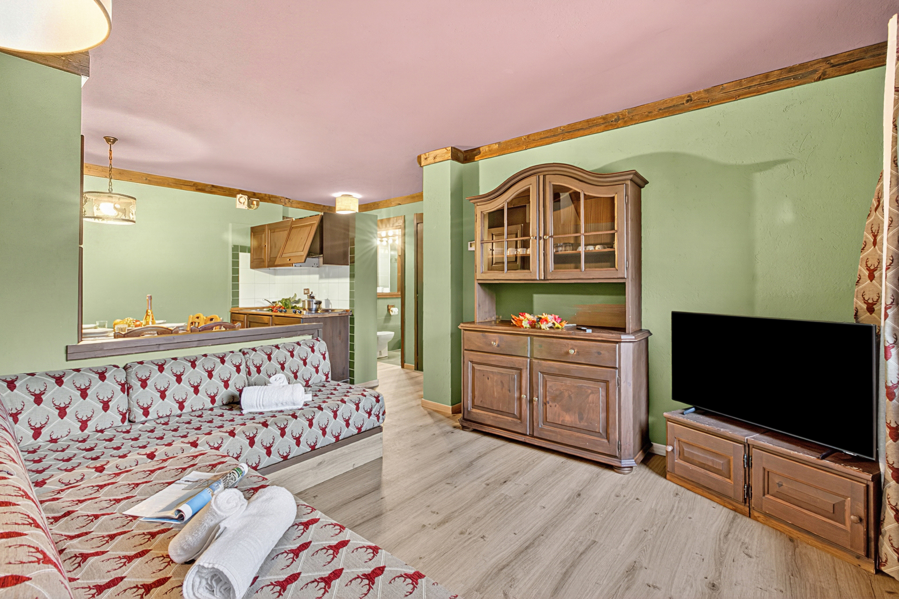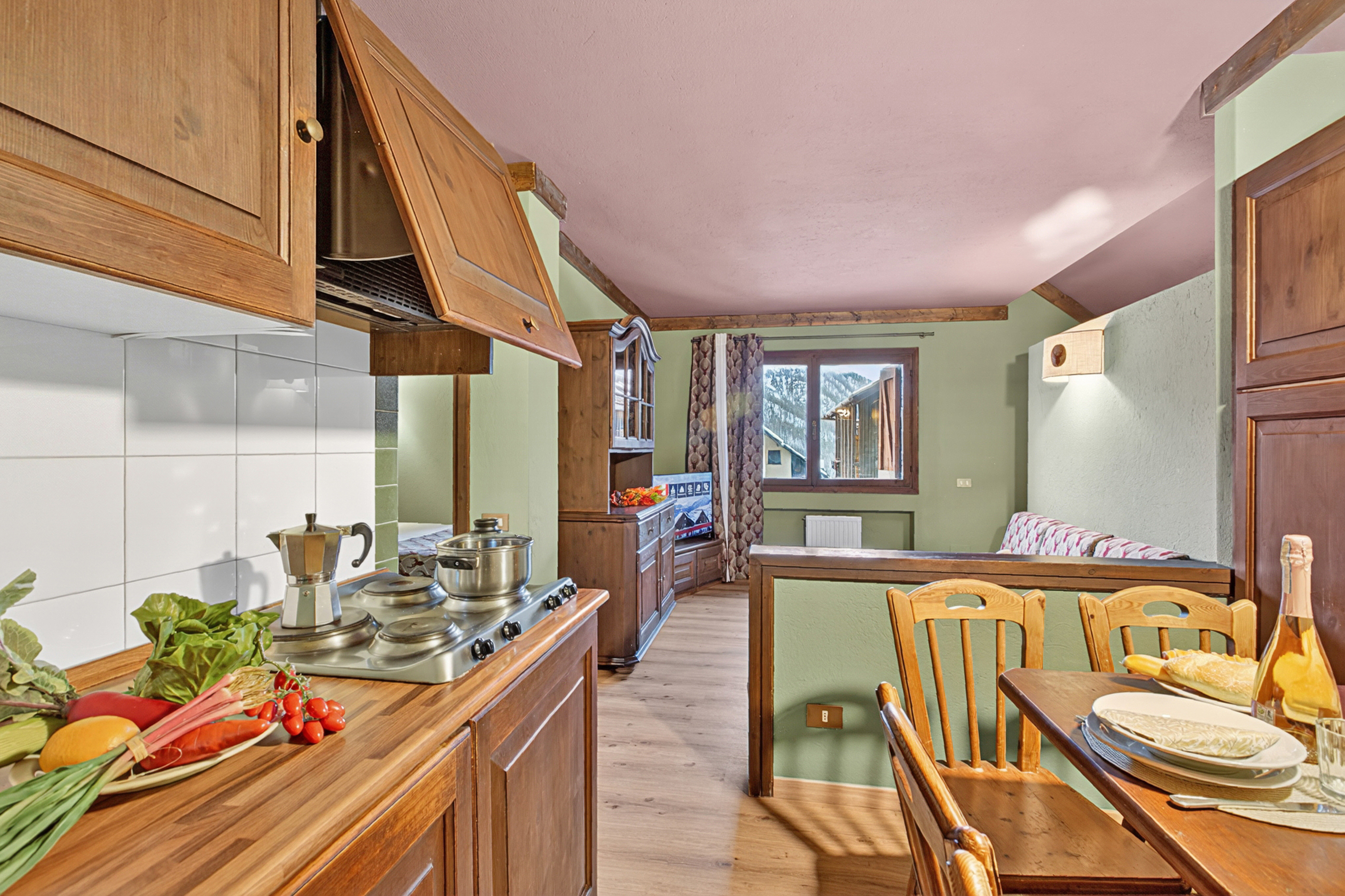 De woonkamer heeft een grote hoekbank, een traditionele dressoir en een flatscreen digitale tv. De houten eettafel staat naast de open keuken. De open kitchenette is uitgerust met een kookplaat, magnetron en koelkast.