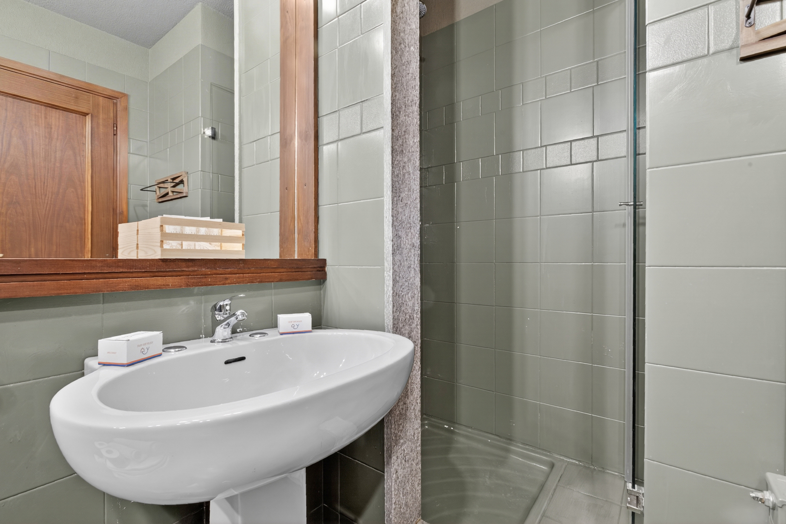 De recent gerenoveerde badkamer beschikt over een douche, wastafel, bidet en toilet.