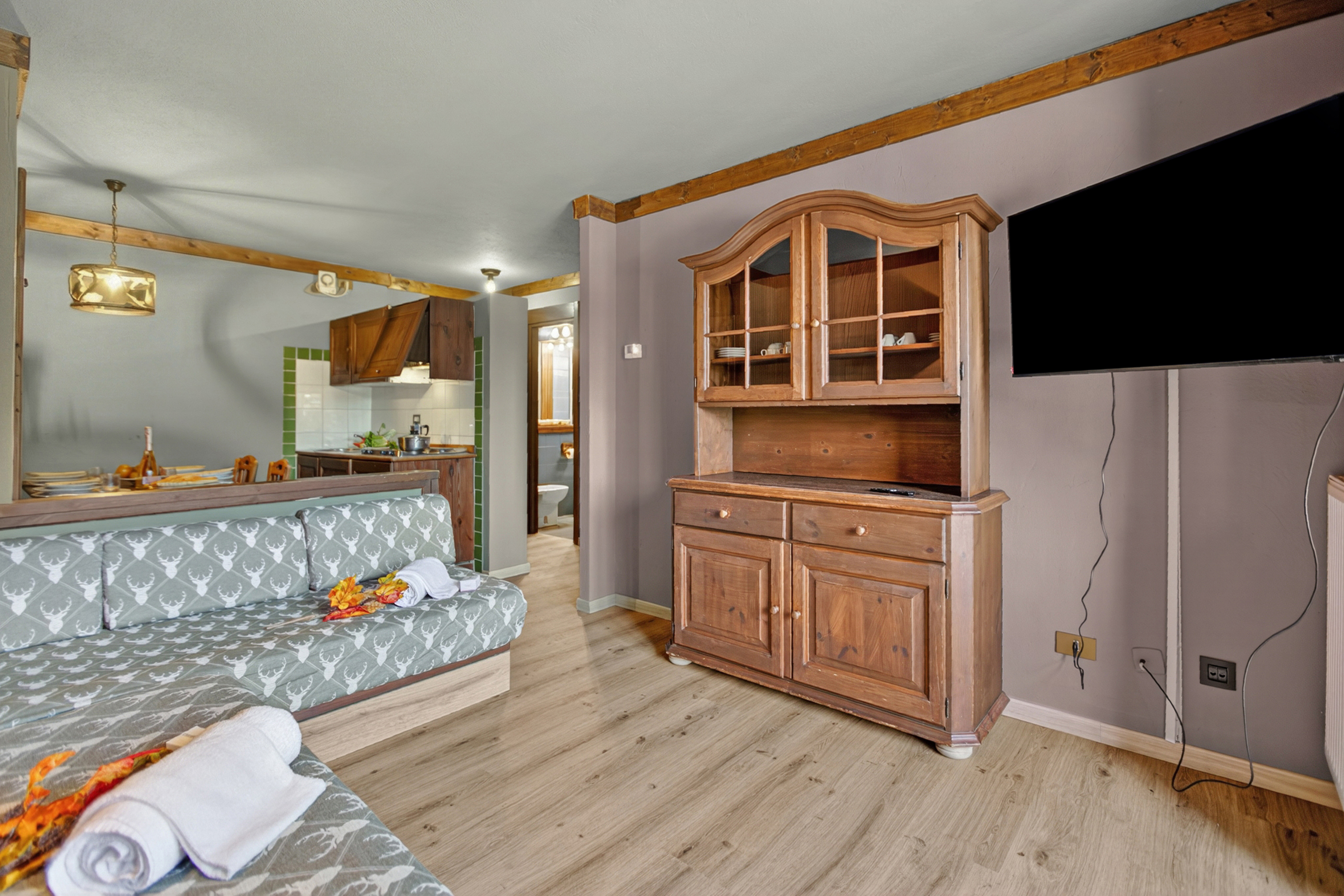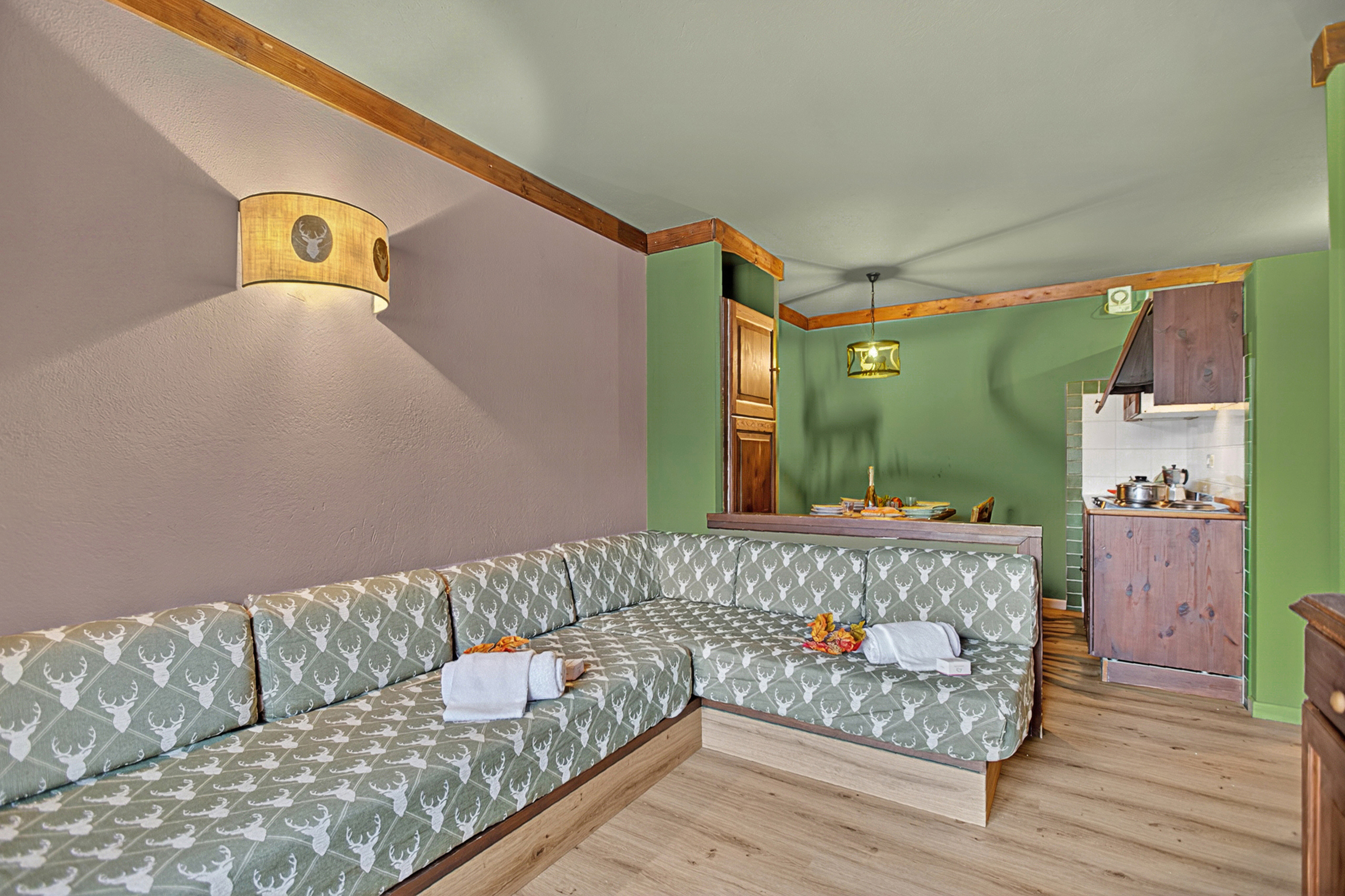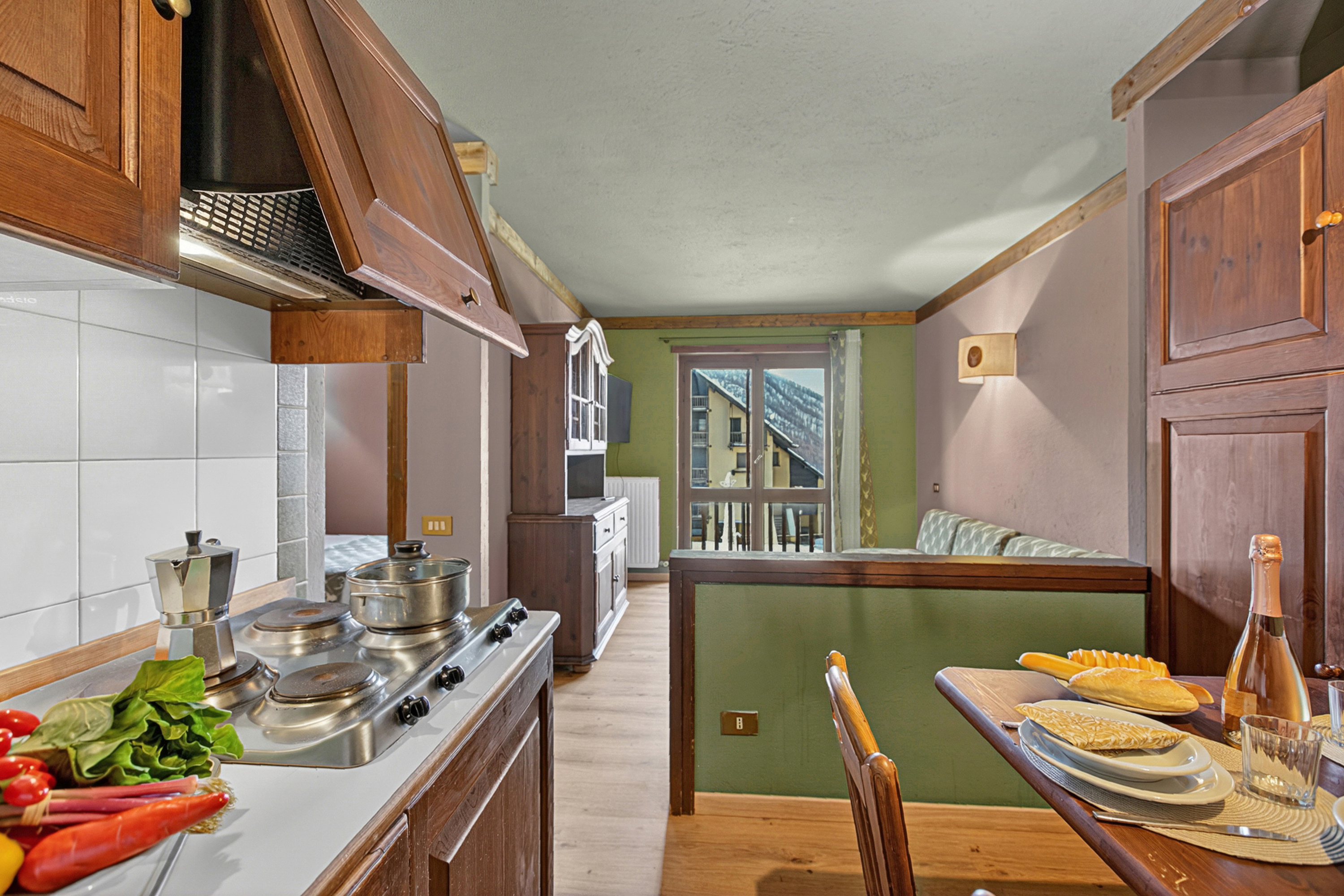 – Het stijlvolle appartement op de eerste verdieping beschikt over een woonkamer in alpinestijl met groene tegelvloer, een hoekbank, een flatscreen-tv met digitale zenders, een groot houten dressoir en een klein balkon.