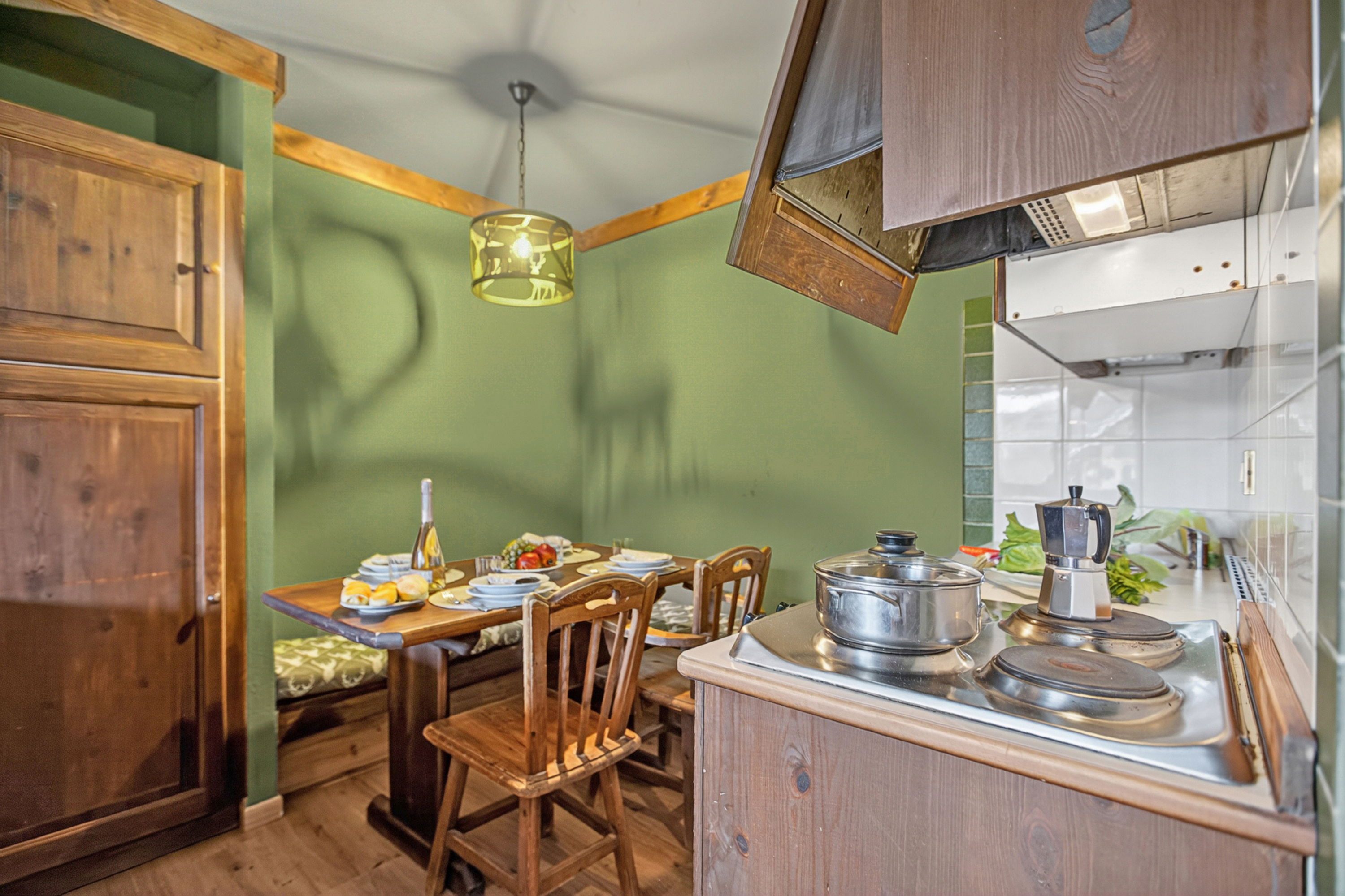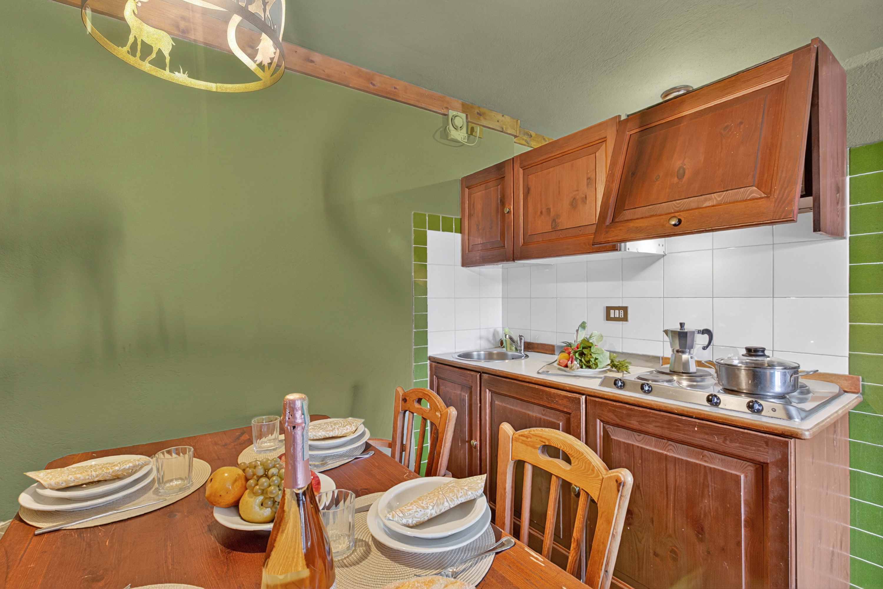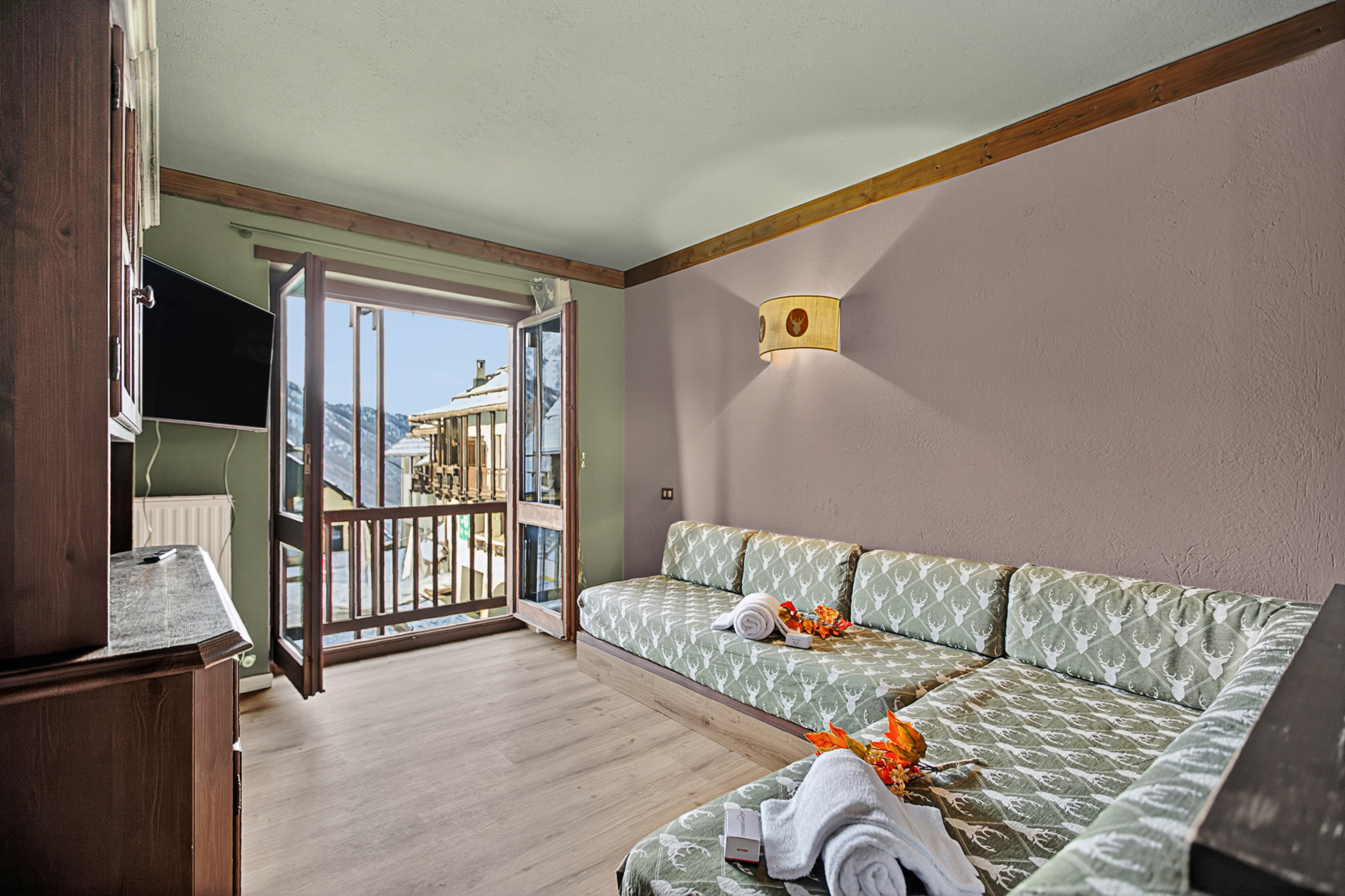 – Het stijlvolle appartement op de eerste verdieping beschikt over een woonkamer in alpinestijl met groene tegelvloer, een hoekbank, een flatscreen-tv met digitale zenders, een groot houten dressoir en een klein balkon.